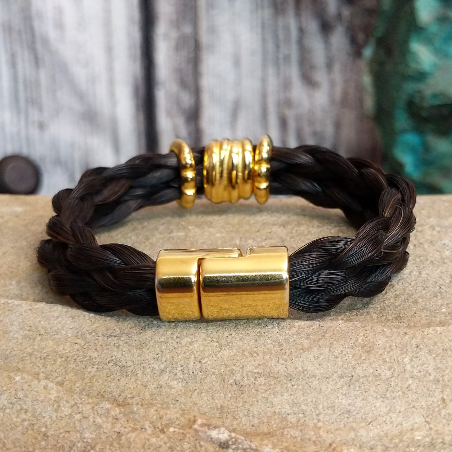 This Gold Digger bracelet from Cowboy Collectibles shines with frontier opulence through its dual brown horsehair braids. The maker’s gleaming gold-toned accents evoke a treasure hunter’s spirit and offer a magnetic clasp closure, sturdy for any adventure.