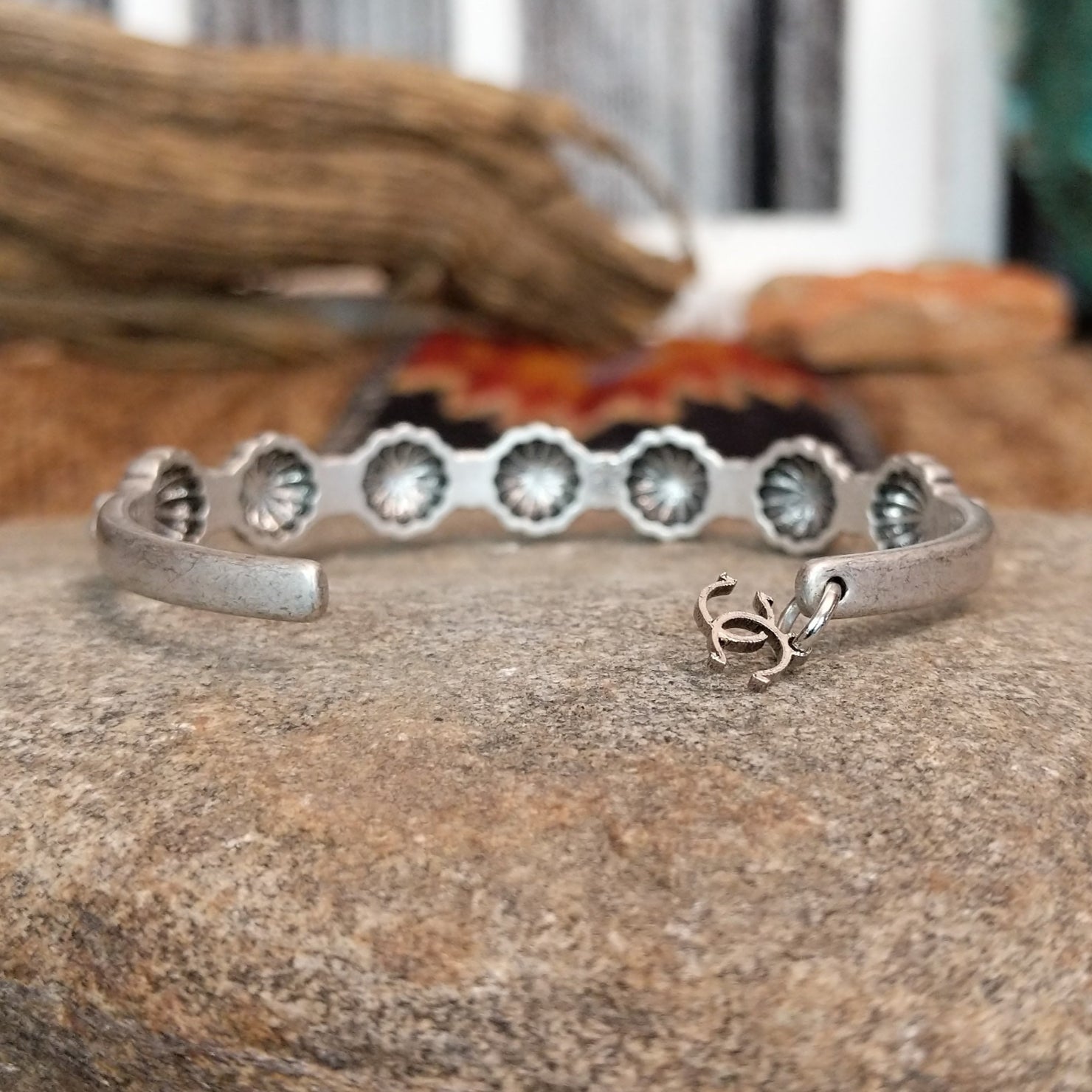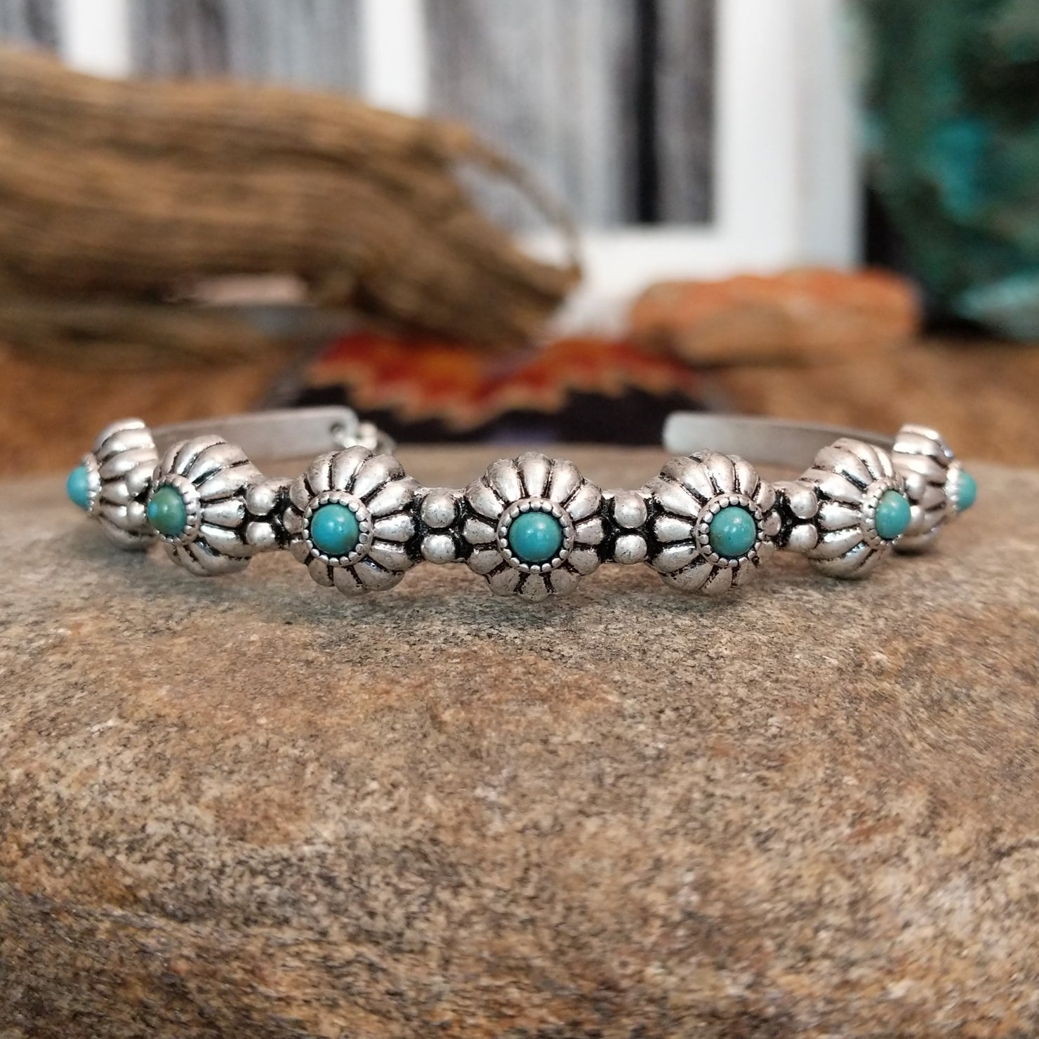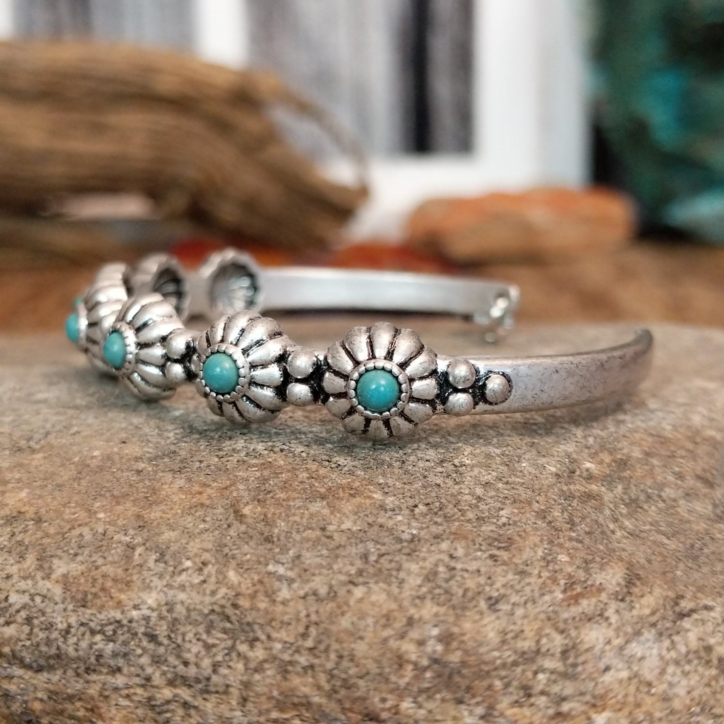 This Paradise City bracelet from Cowgirl Confetti radiates the allure of a desert oasis with its striking nickel-free metal cuff and vivid turquoise colored stones. The floral settings add a touch of natural elegance, perfect for a bold, comfortable style.