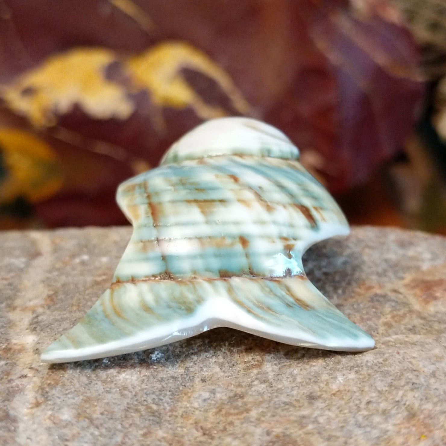 This Zuni fish fetish carving by Cheryl Beyuka is expertly crafted from green snail shell, symbolizing purification, strong character, and the ability to conceal emotions. The green shell highlights the detailed craftsmanship, reflecting both cultural symbolism and artistic precision.