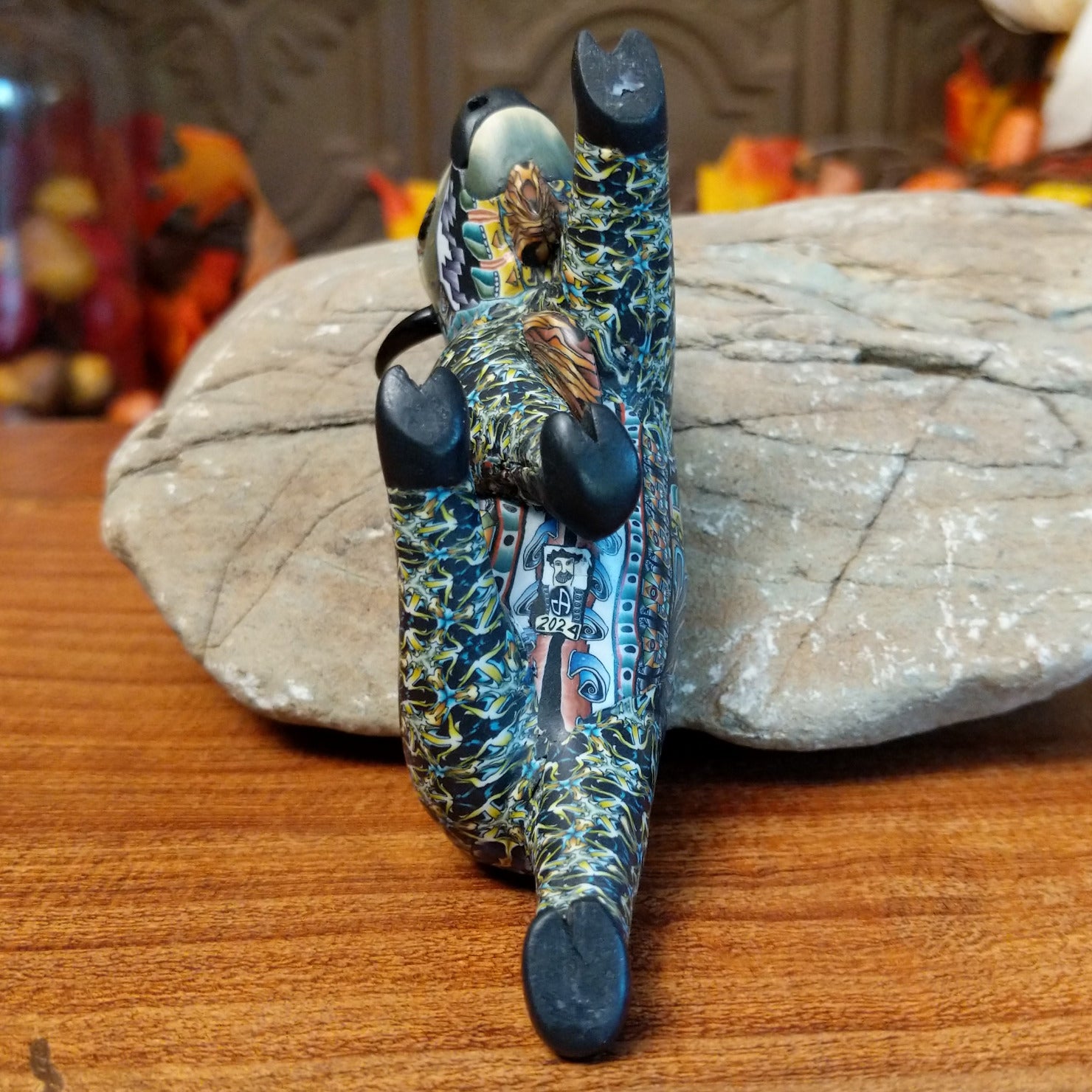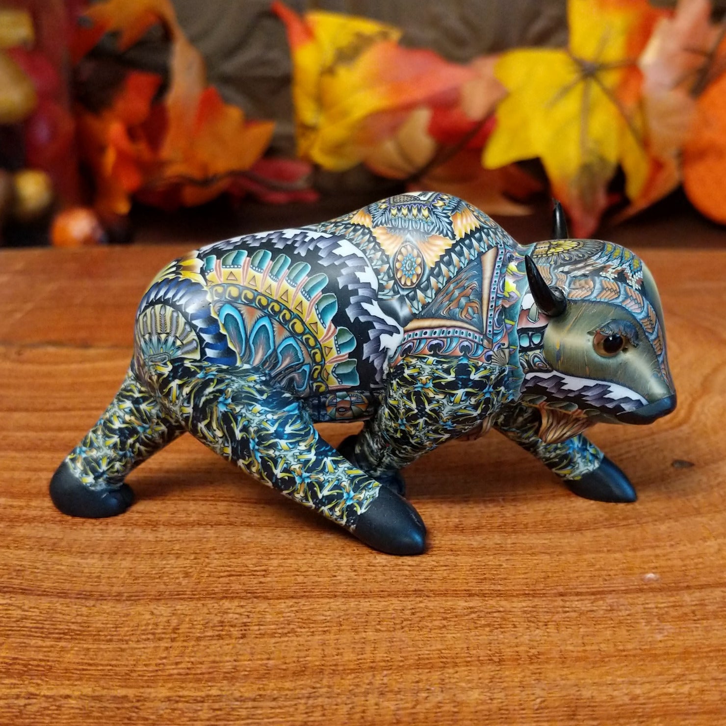 The "Bison Baby" Fimocreation by Jon Anderson showcases expert craftsmanship using polymer clay to sculpt a buffalo adorned with intricate geometric patterns and detailed insect motifs. This unique piece merges artistic precision with symbolic design, making it a charming addition for various collections.