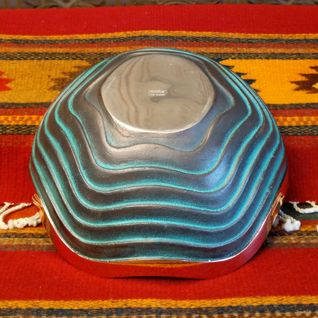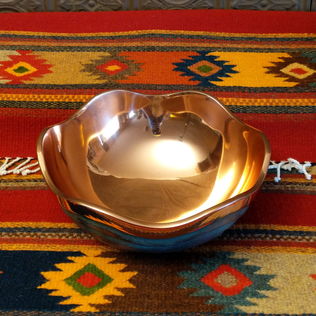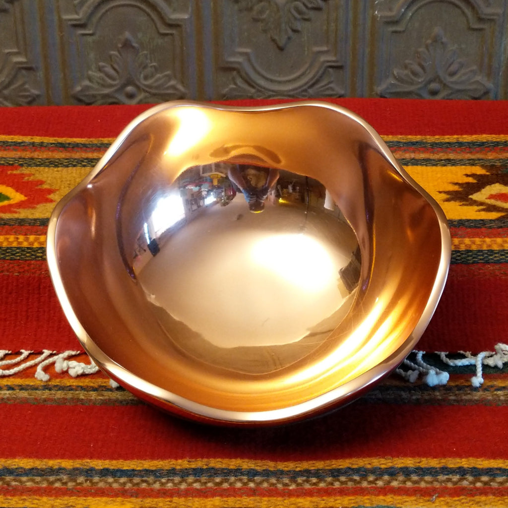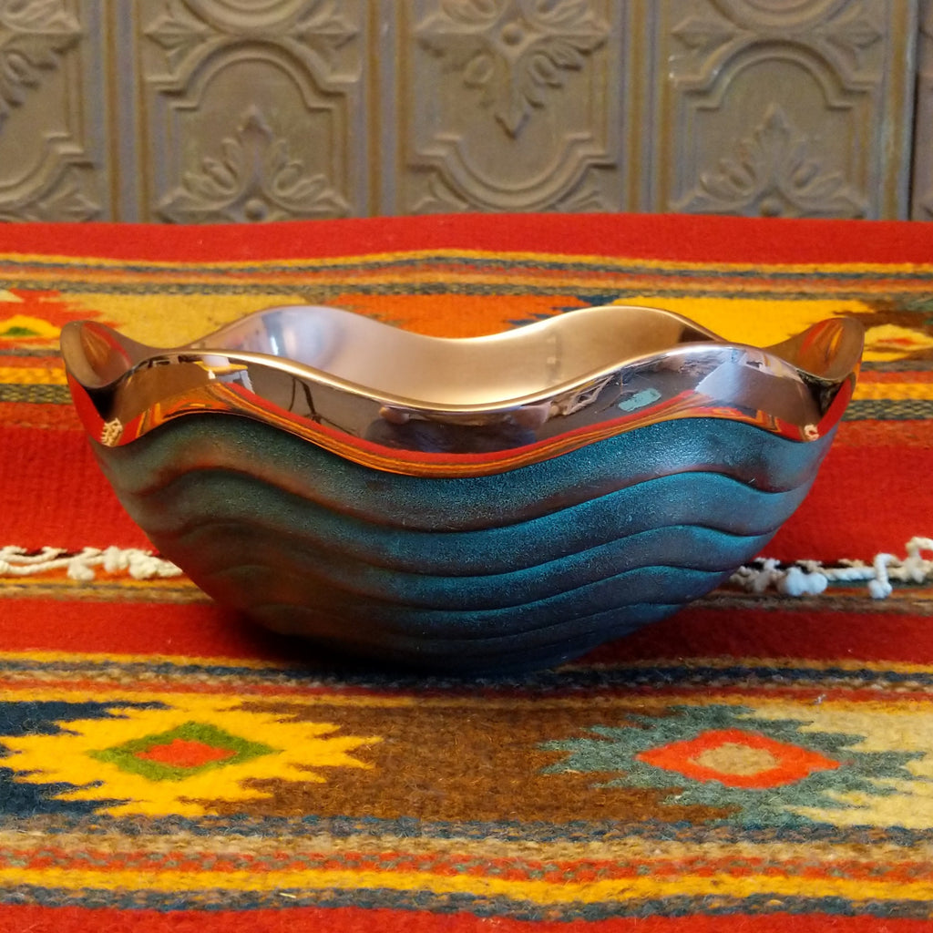 This striking bowl features a radiant copper-coated interior that gleams with warmth, while the exterior showcases tiered, undulating steps that taper gracefully toward the base. A patina-like finish adds depth and character, giving the piece a refined, timeworn appeal. Clear-coated for lasting beauty, this bowl is both a captivating decorative piece and a practical vessel for everyday use.