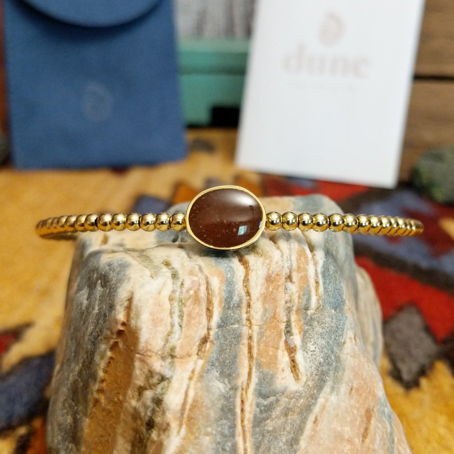 This beaded cuff bracelet, crafted by Dune Jewelry, exudes warmth with its golden beads and earthy sand-filled oval, reminiscent of desert stillness. Encased in gold-plated brass, the maker’s design perfectly balances rustic charm and flexible, sleek style.