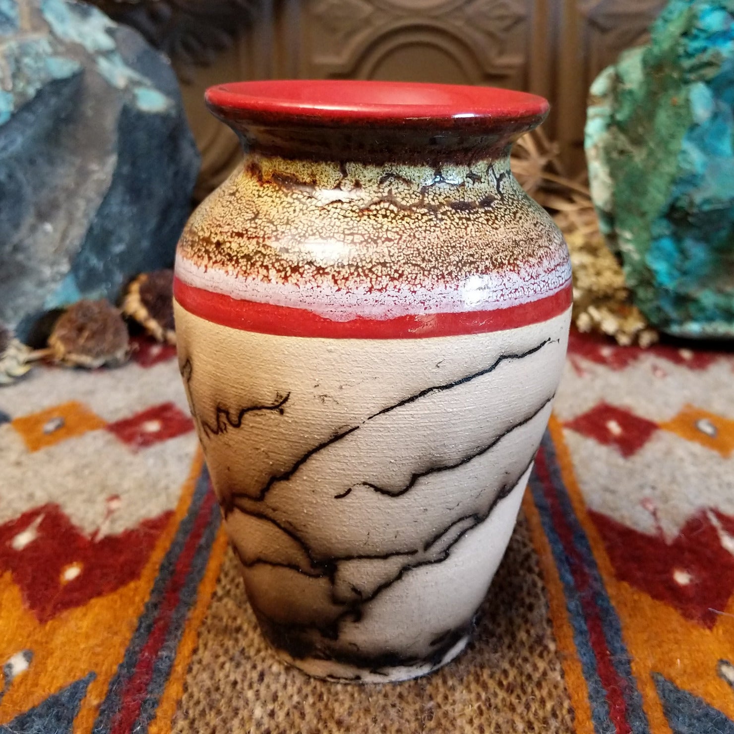 This pottery piece by Roger Calhoun features white ceramic with horsehair fired onto the surface, creating unique patterns. Dapples of red on the surface, lip, and decorative stripe are glazed using the raku firing technique, making it a beautiful and unique decor piece.