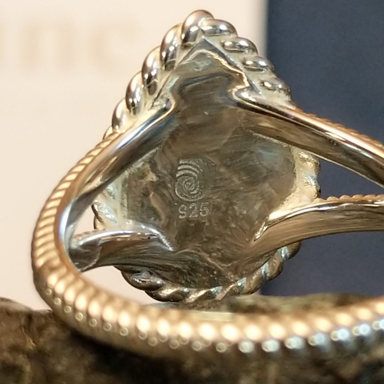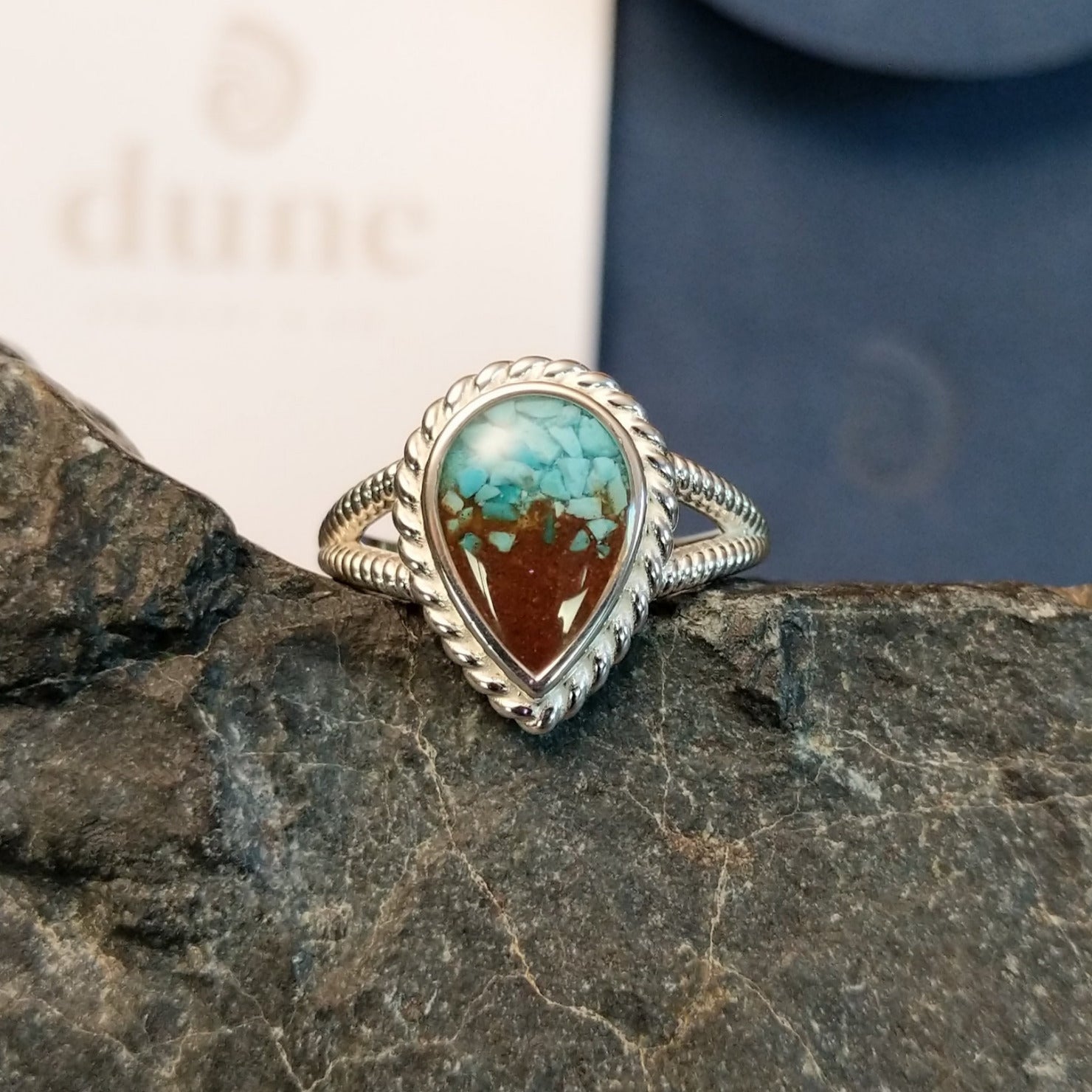 This expertly crafted mermaid ring by Dune Jewelry features an intricate band design that complements the natural beauty of turquoise and Lake Powell sand set within the bezel. The combination of materials offers a unique connection to the Southwest's landscapes.