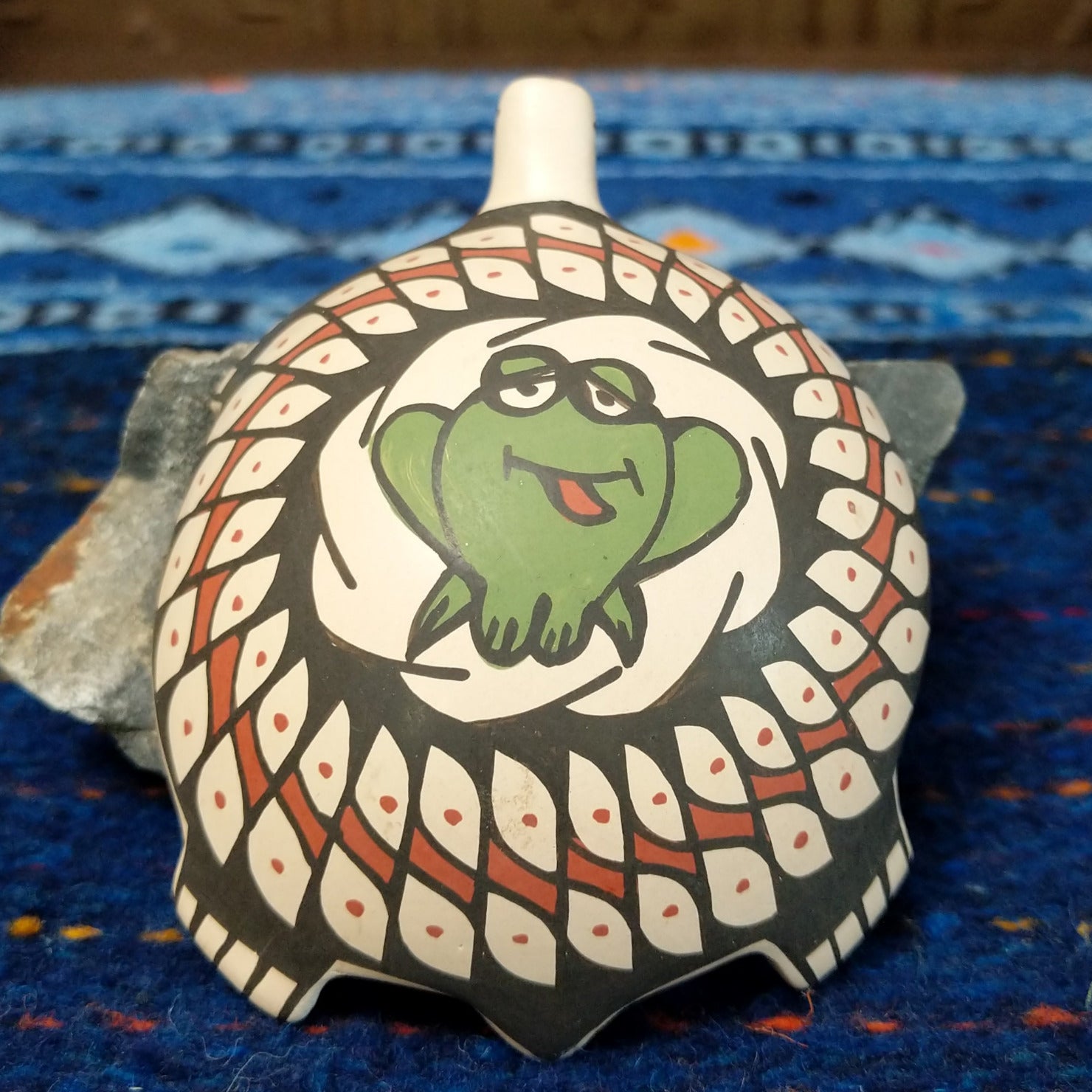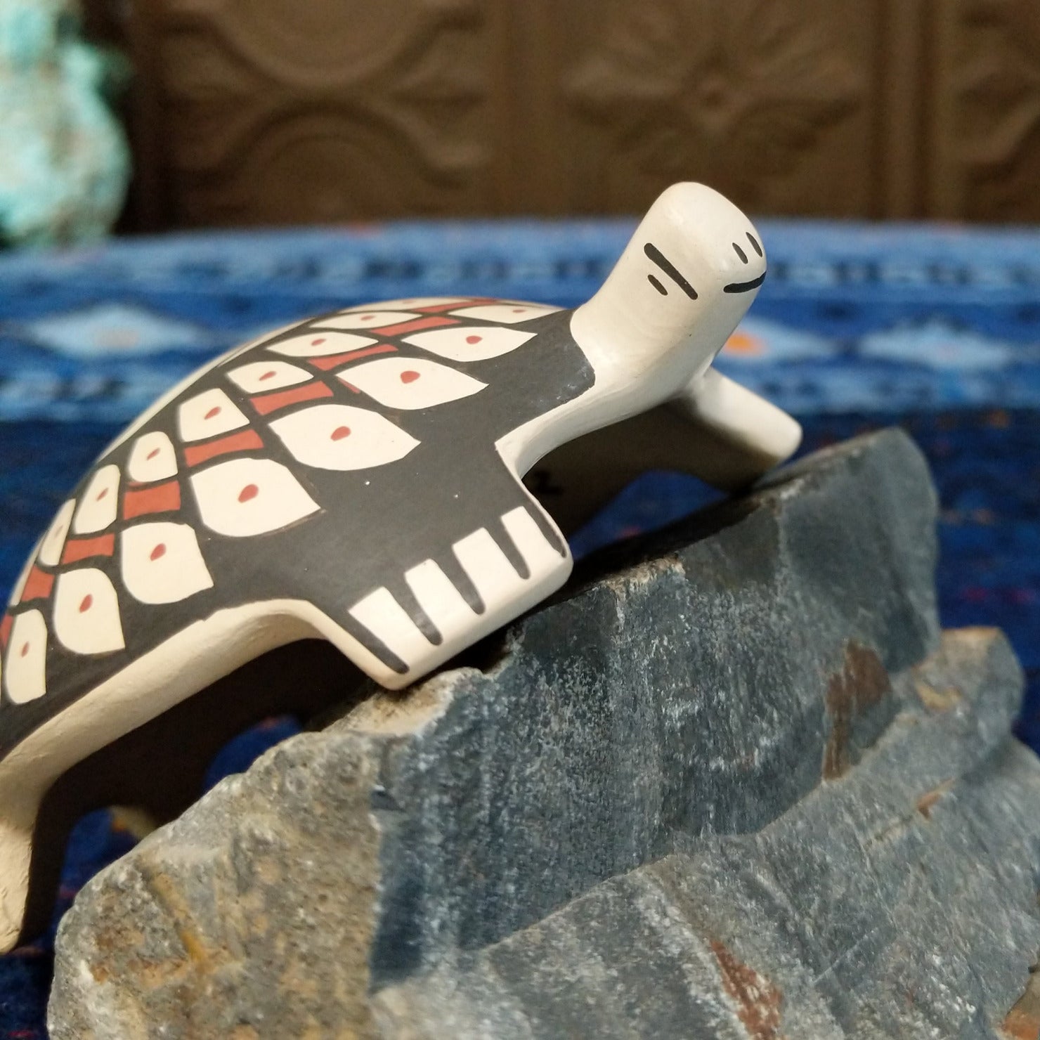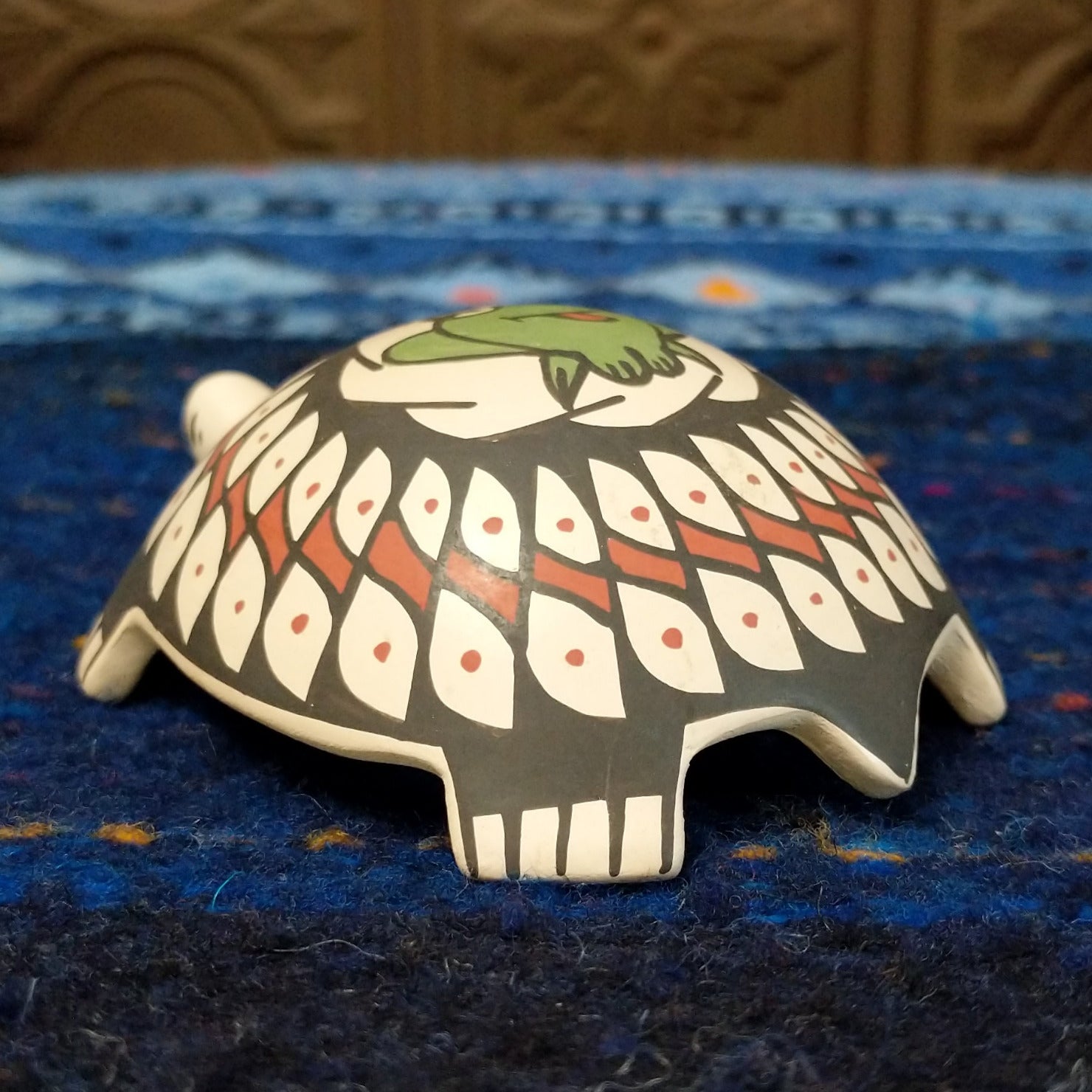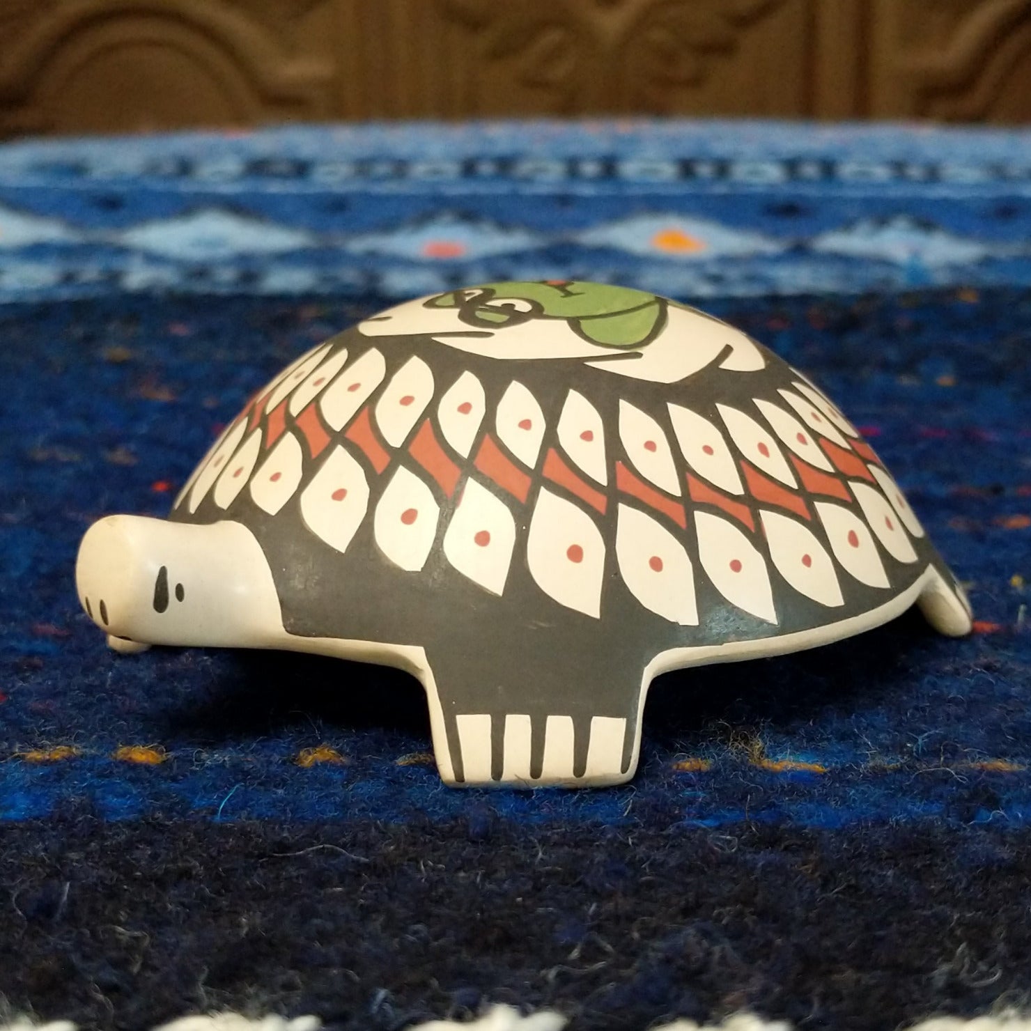 Handcrafted by Mata Ortiz artisan Martha Hernandez, this turtle-shaped pottery embodies a smooth white clay and striking black and red designs. The piece features an intricate pattern on the turtle's shell, accented by geometric motifs and a narrow neck, and a charming green frog on shell.