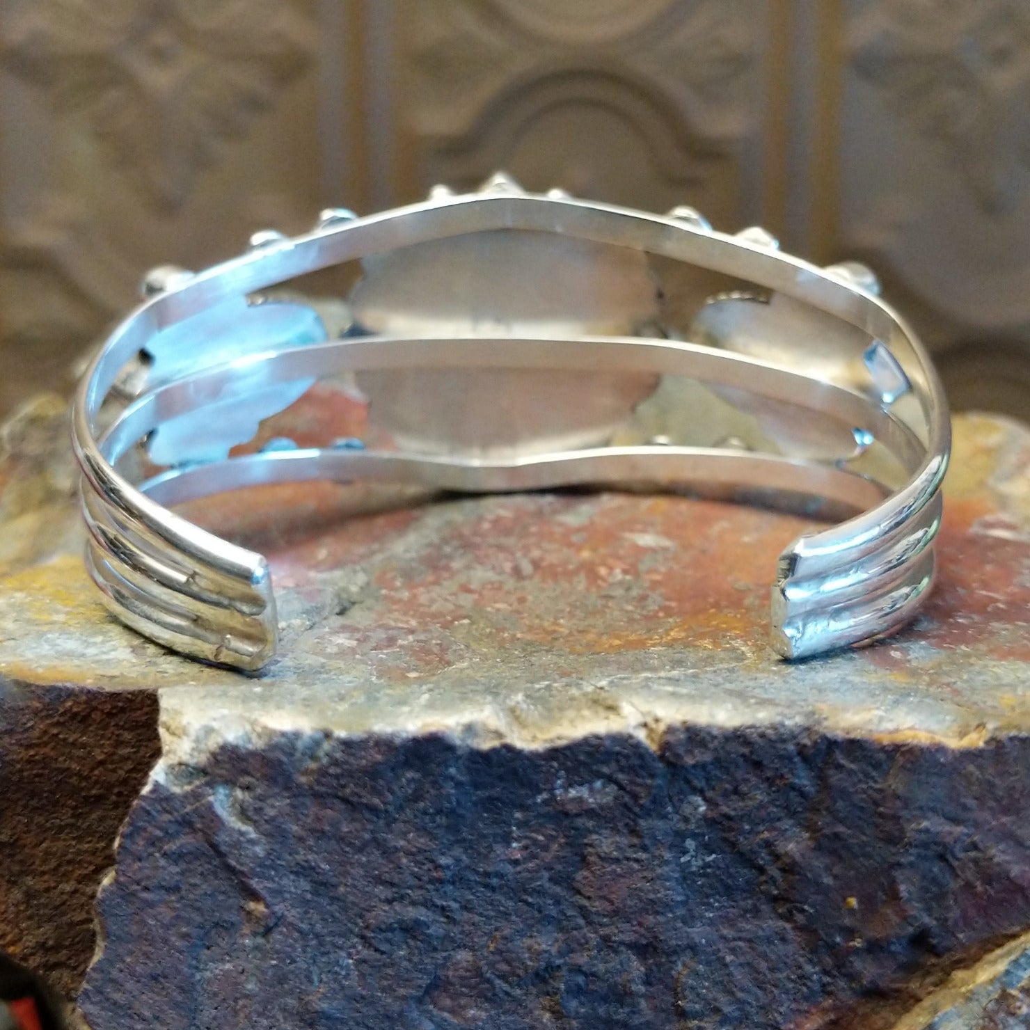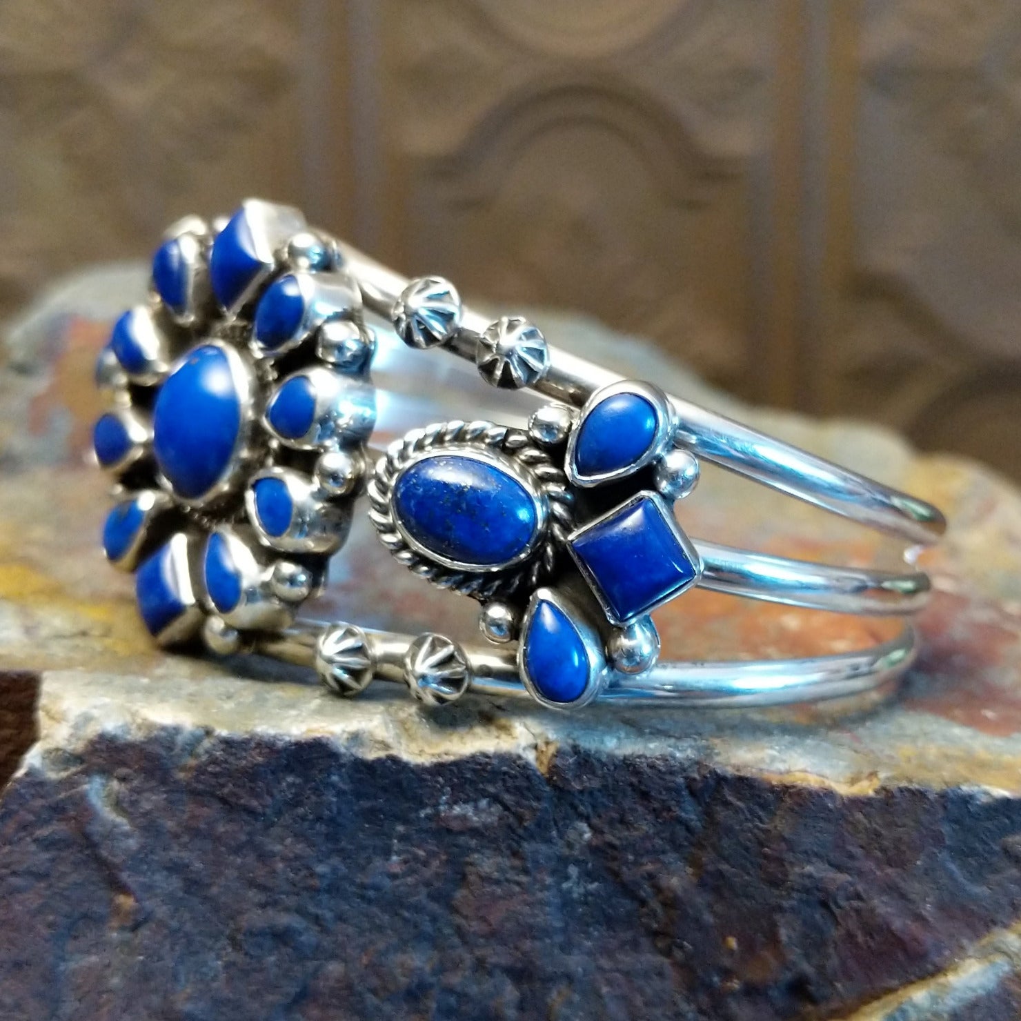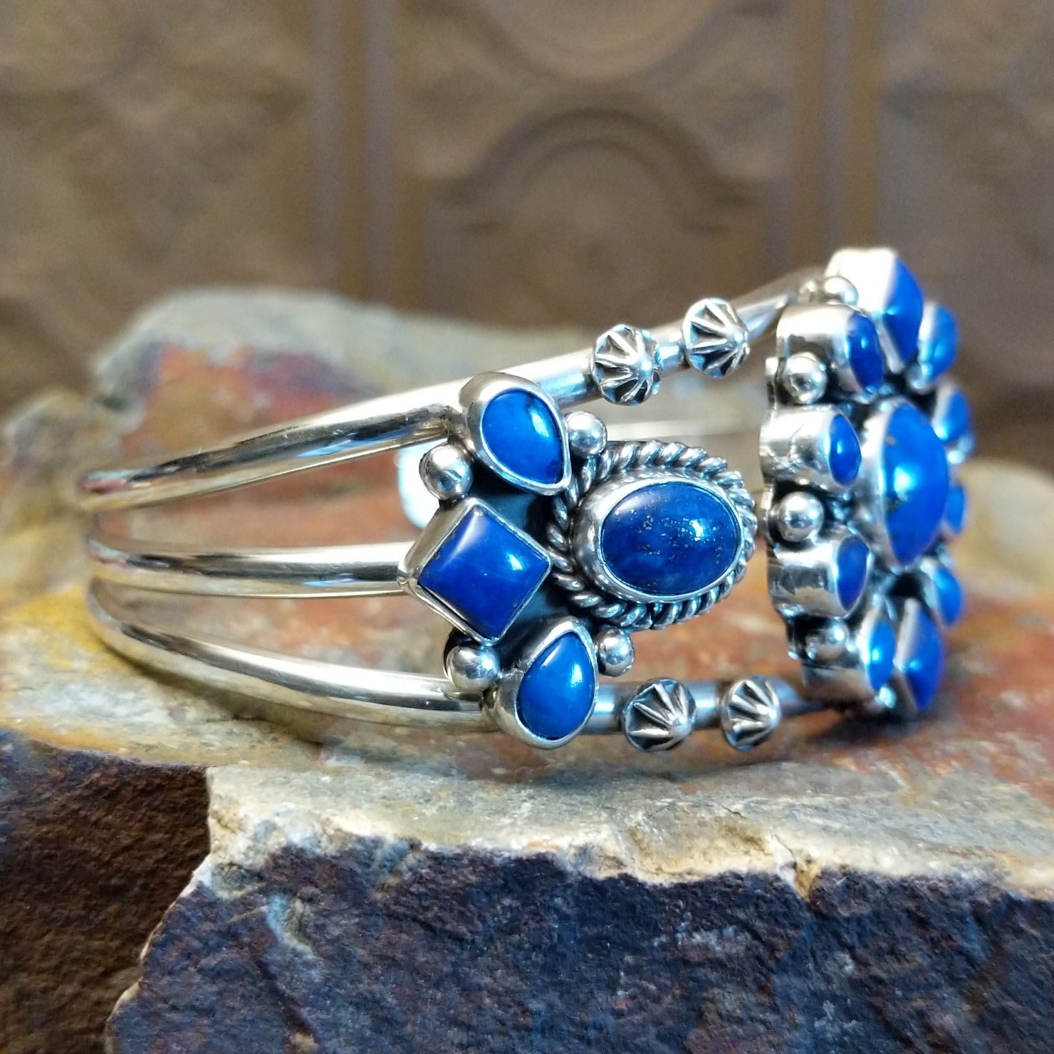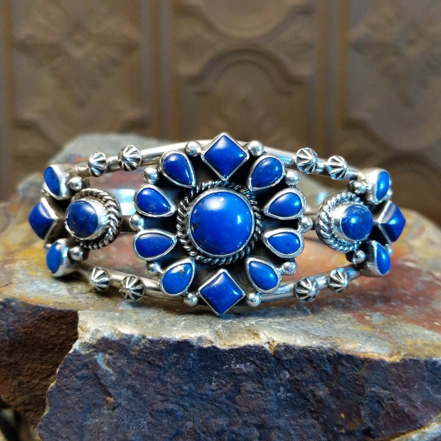This sterling silver cuff bracelet by Navajo artisan Tricia Smith showcases lapis stones set in elegantly shaped bezels that accentuate the band. Complemented by delicate starry silverwork that adds texture, the unique design transitions seamlessly from everyday wear to special occasions.