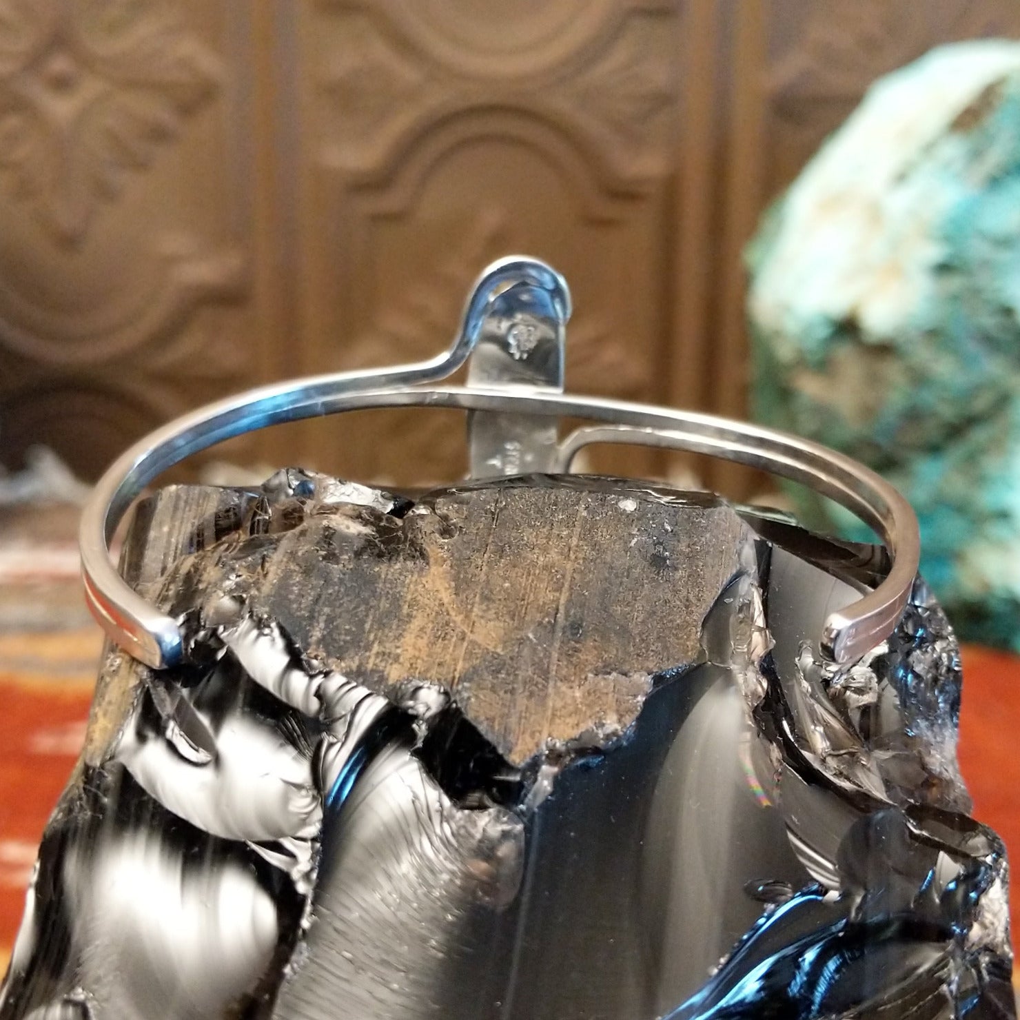 This unique bracelet is crafted by Navajo artisan Tricia Smith, and features the polished sterling silver band. The band features a radial layout, with the large, rectangular stone as the centerpiece.
