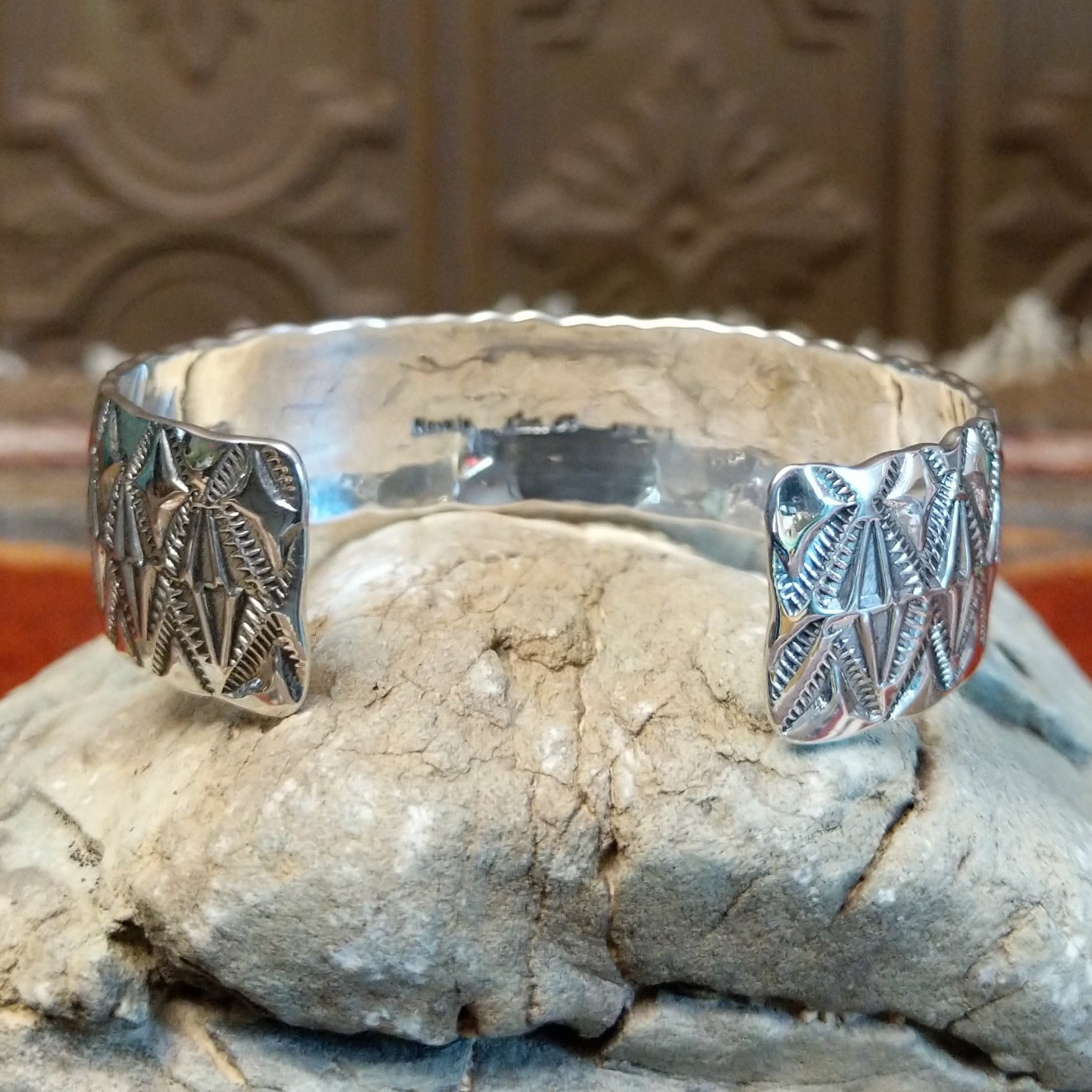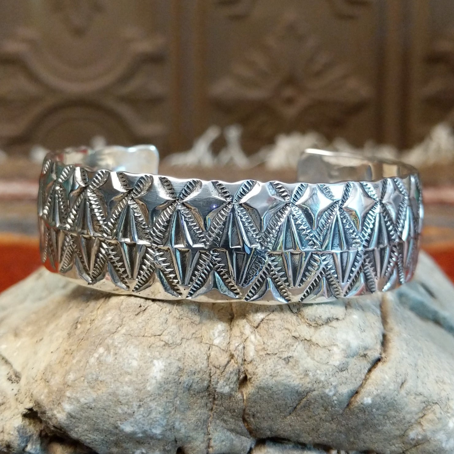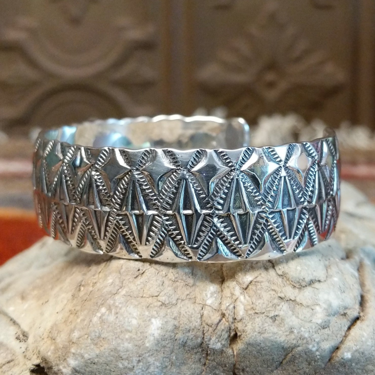 Handcrafted by Navajo artisans Charlene and Robert Little, this cuff features intricate stamped details on the surface. The hand-stamped diamond designs and polished finish, make it a beautiful decorative piece for collectors.