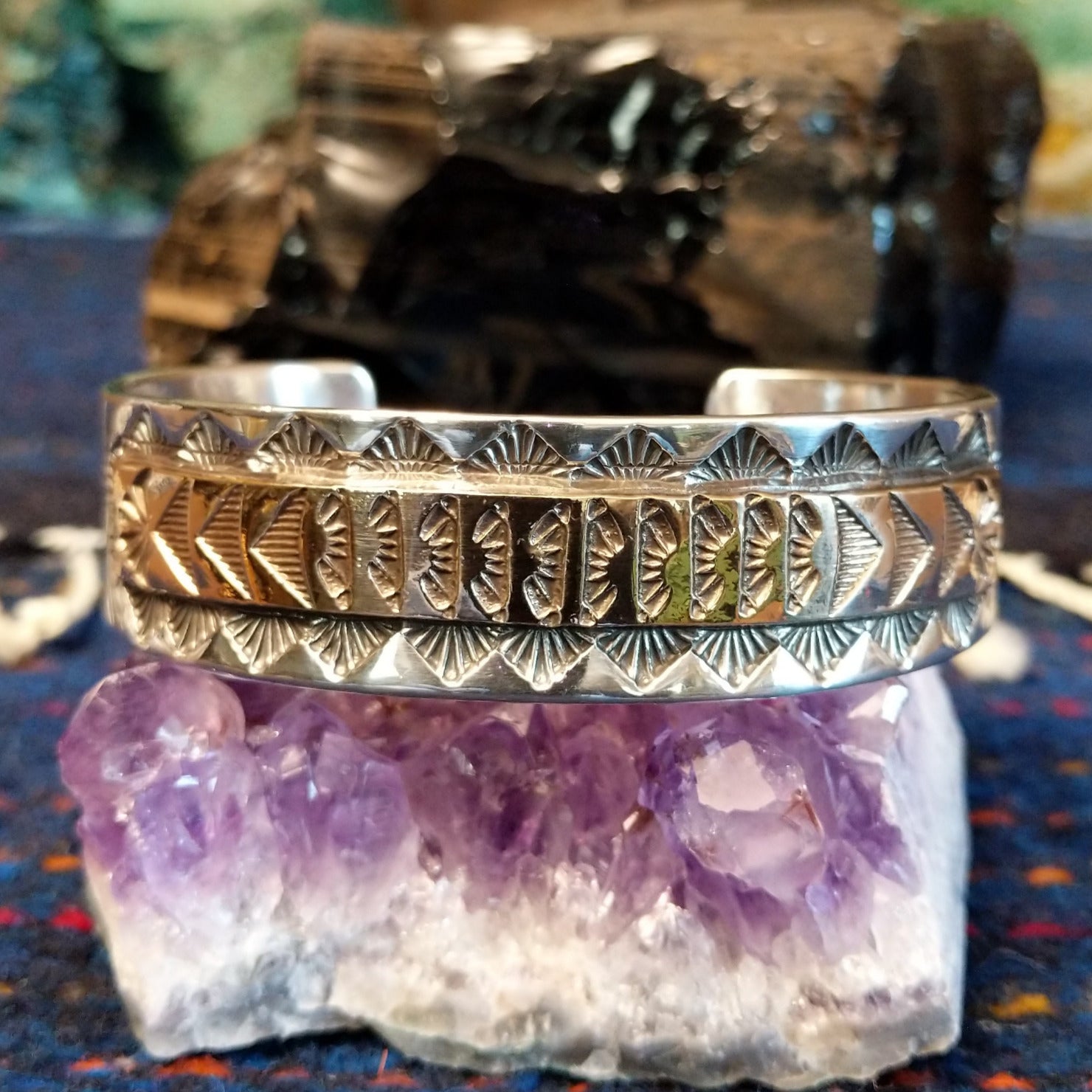 This cuff showcases a blend of sterling silver and 14k gold with intricate stamped patterns, crafted by the skilled Marc Antia. The design highlights Native American artistry with its detailed geometric motifs and polished finish.