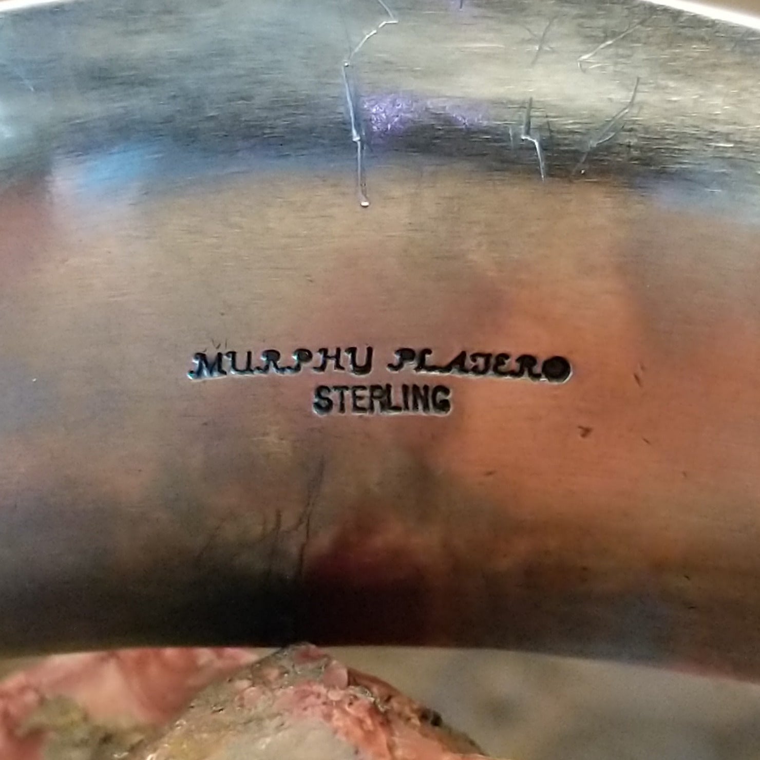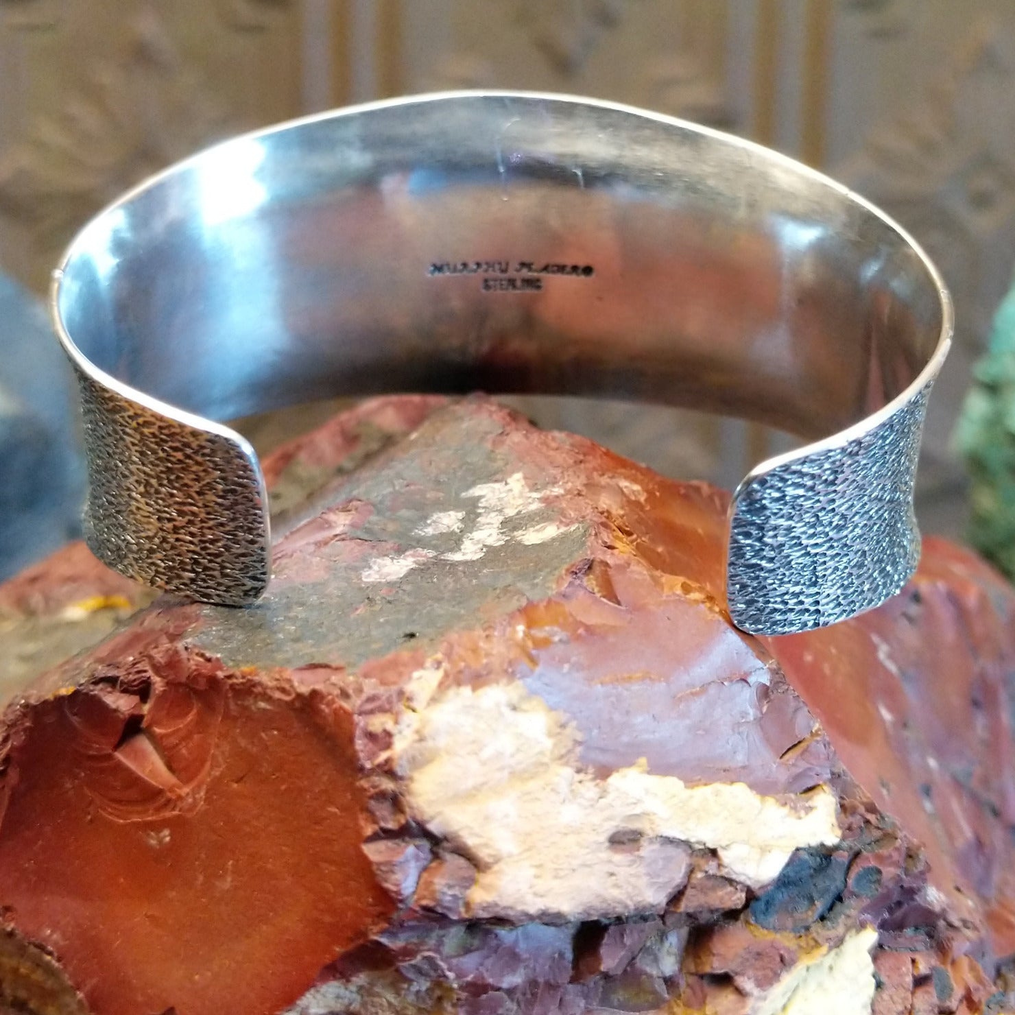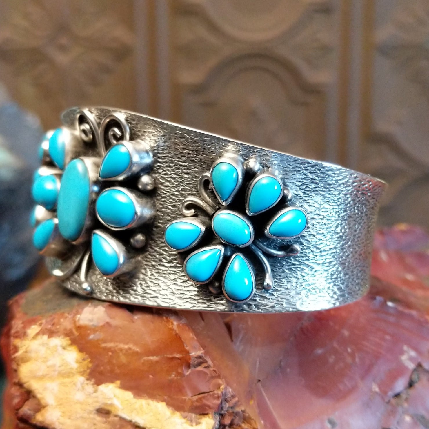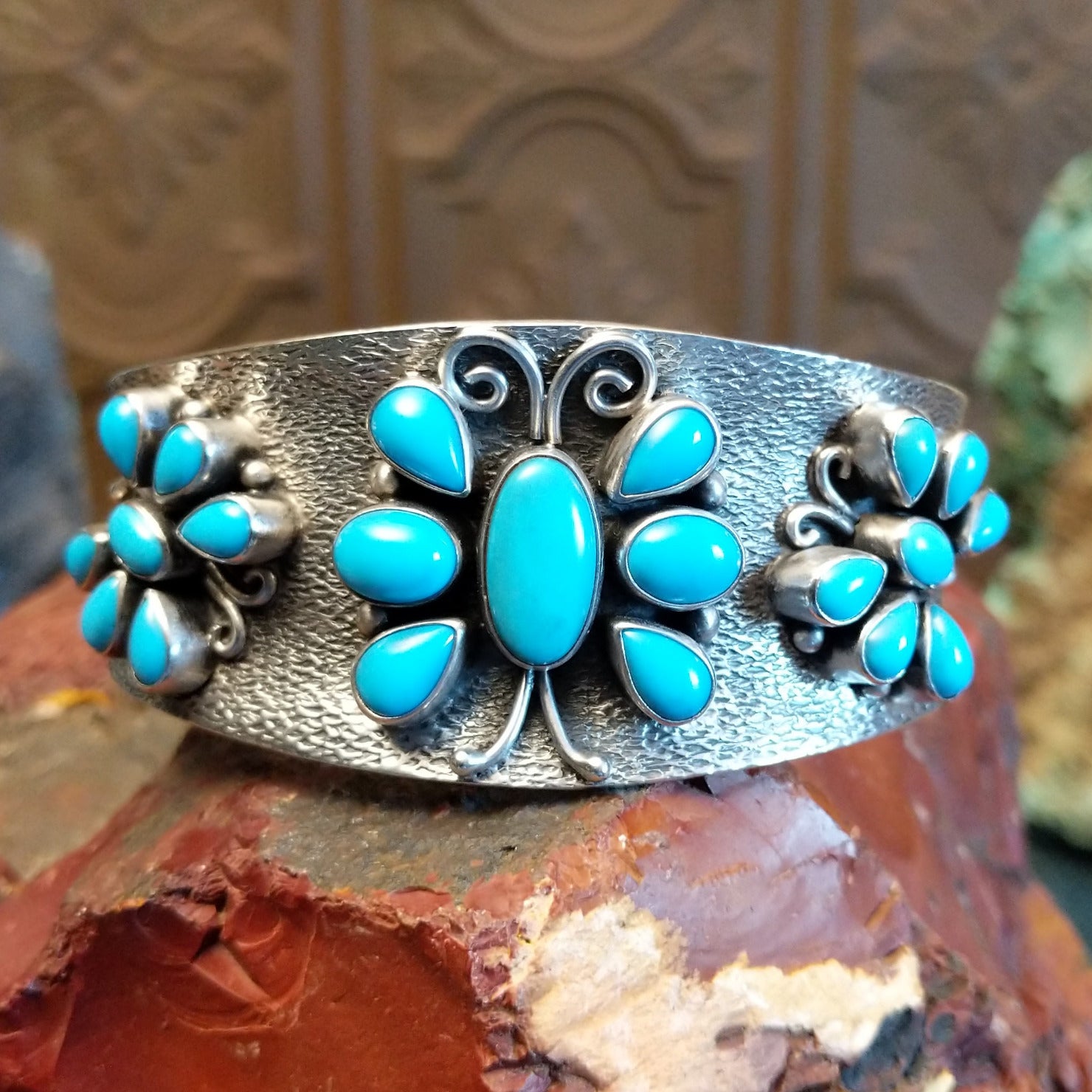 Crafted by Navajo artisan Murphy Platero, this sterling silver cuff features a trio of butterflies with turquoise set in the bezels. The uniquely placed stones form the design, making this a stunning piece for collectors.