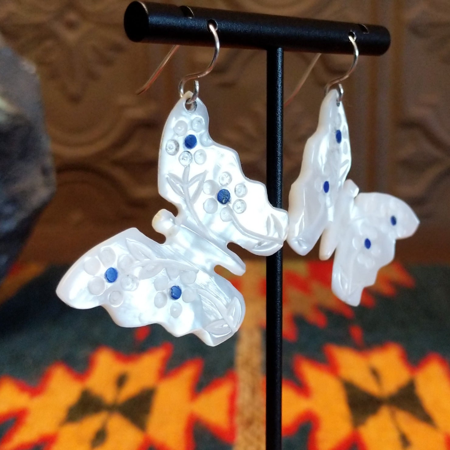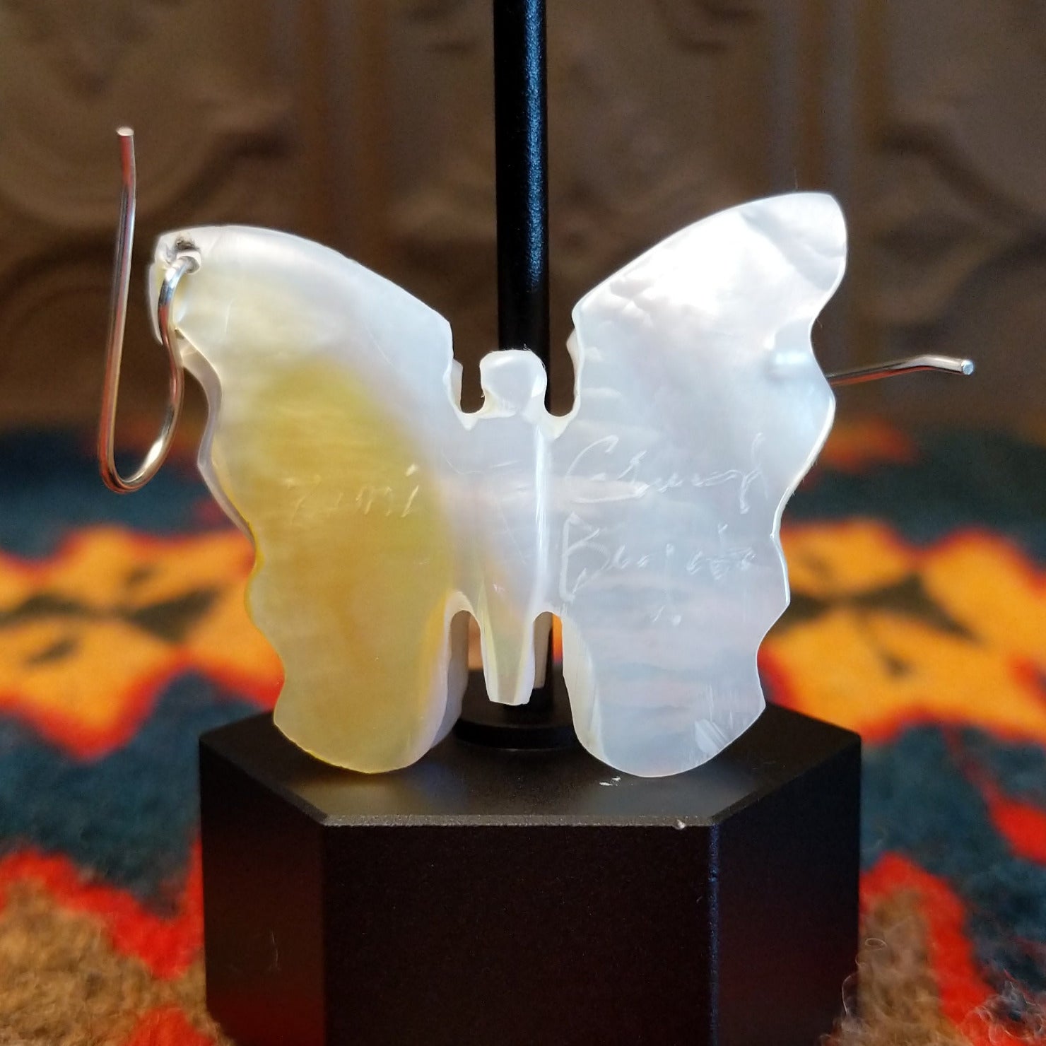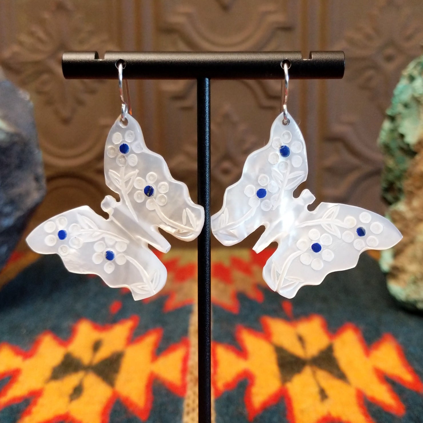 These unique earrings by Navajo artisan Cheryl Beyuka features a butterfly design made of mother of pearl with lapis and floral designs inlaid on the wings. The stunning piece is suspended from sterling silver hooks, perfect for everyday wear or worn as a statement piece.