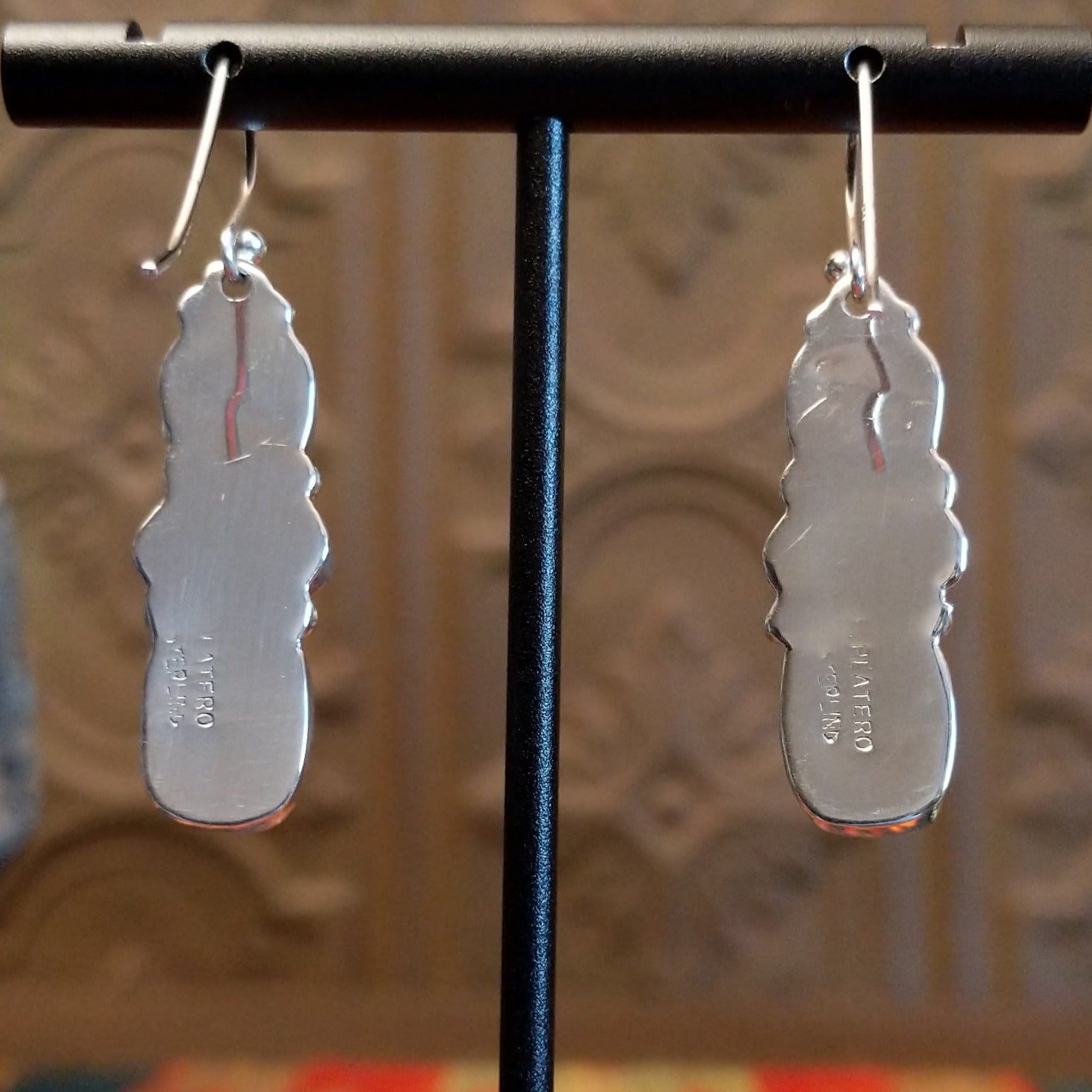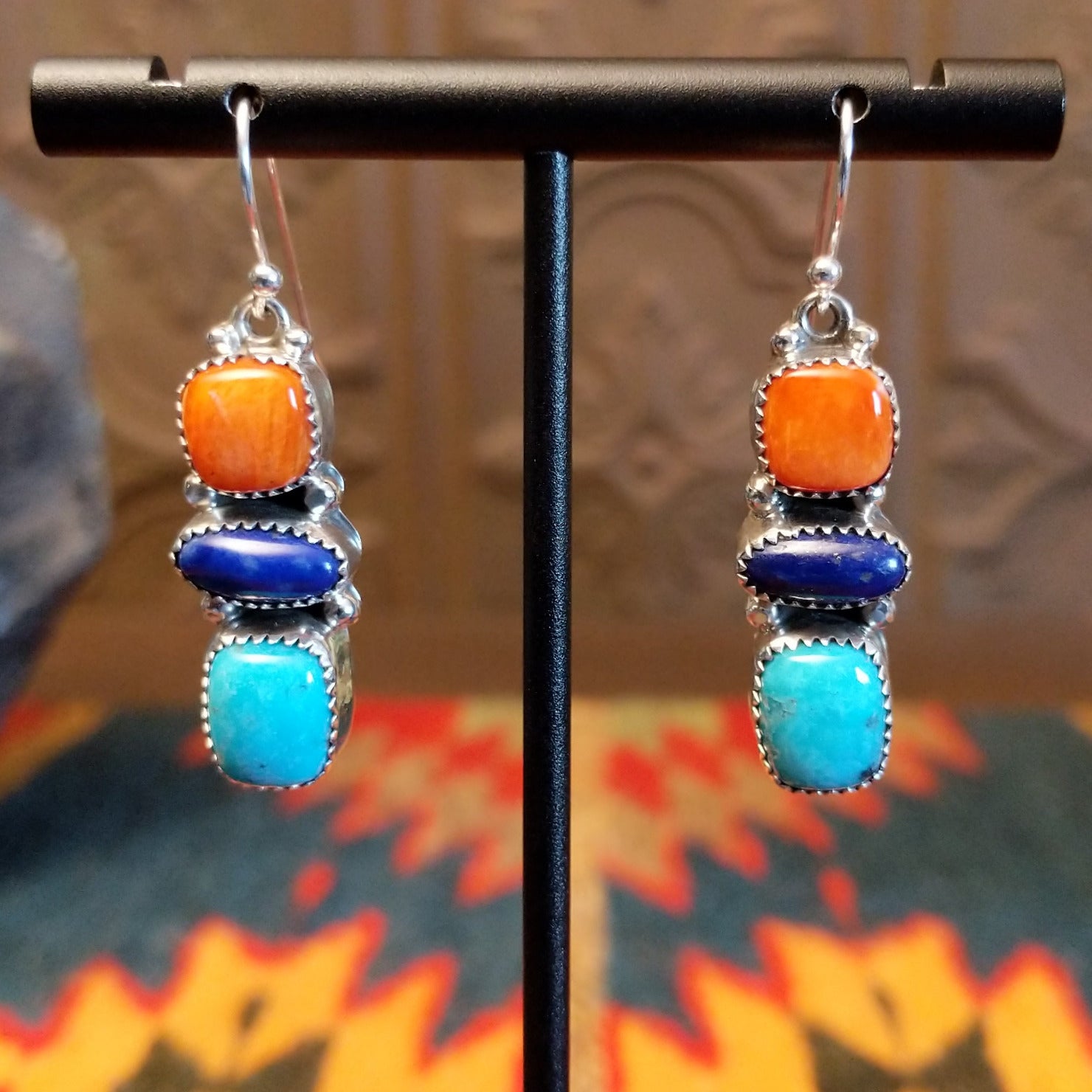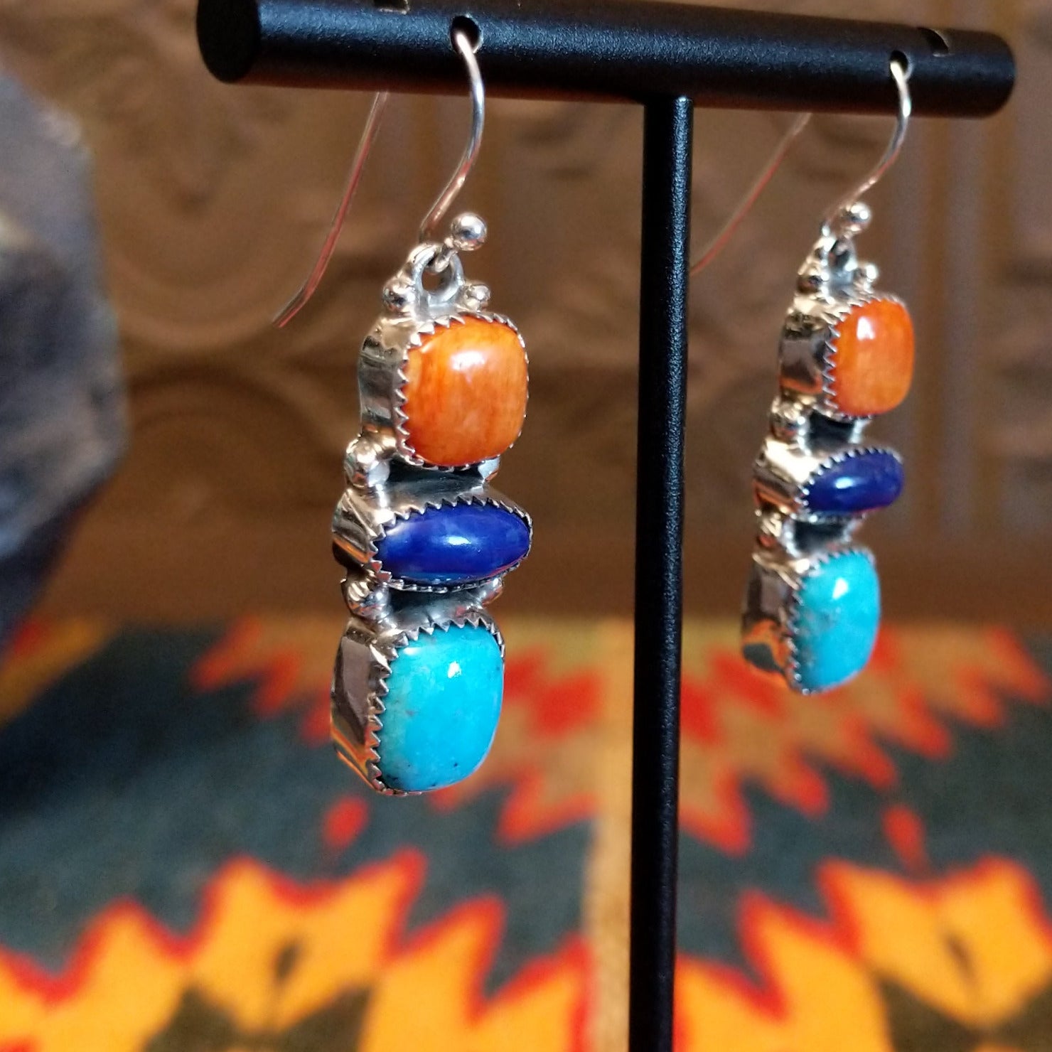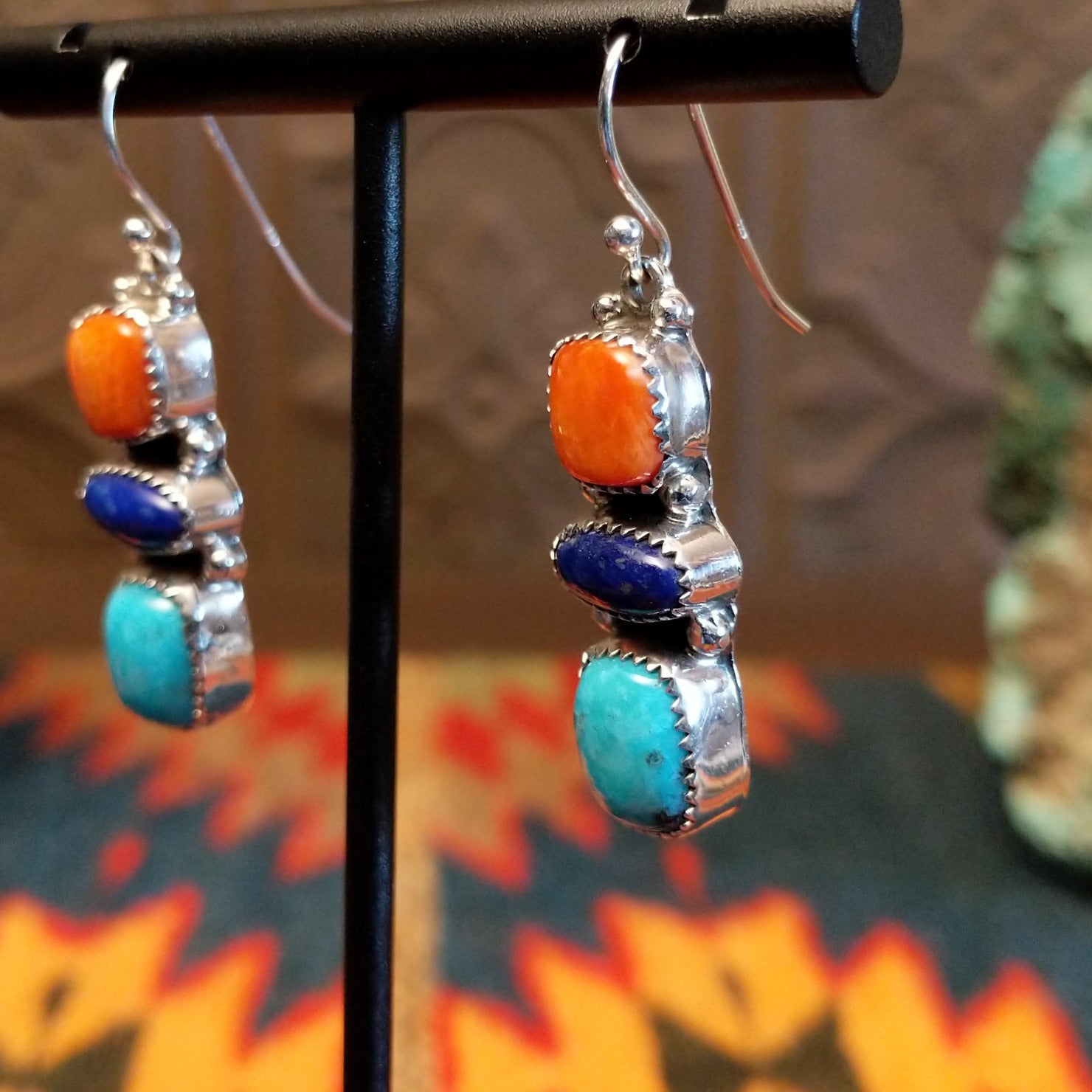 Crafted by Navajo artisan Lolita Platero features turquoise, lapis, and orange spiny oyster shell set in notched bezels. Each bezel is stacked and hung by the dangle hook making this a versatile piece for various occasions.