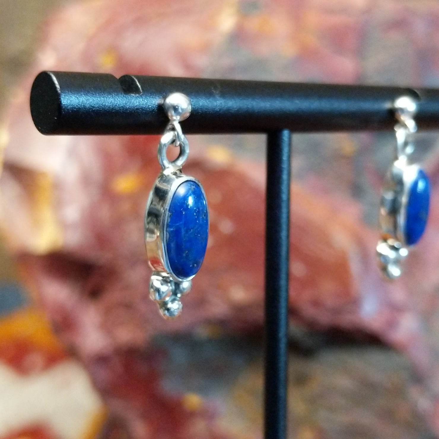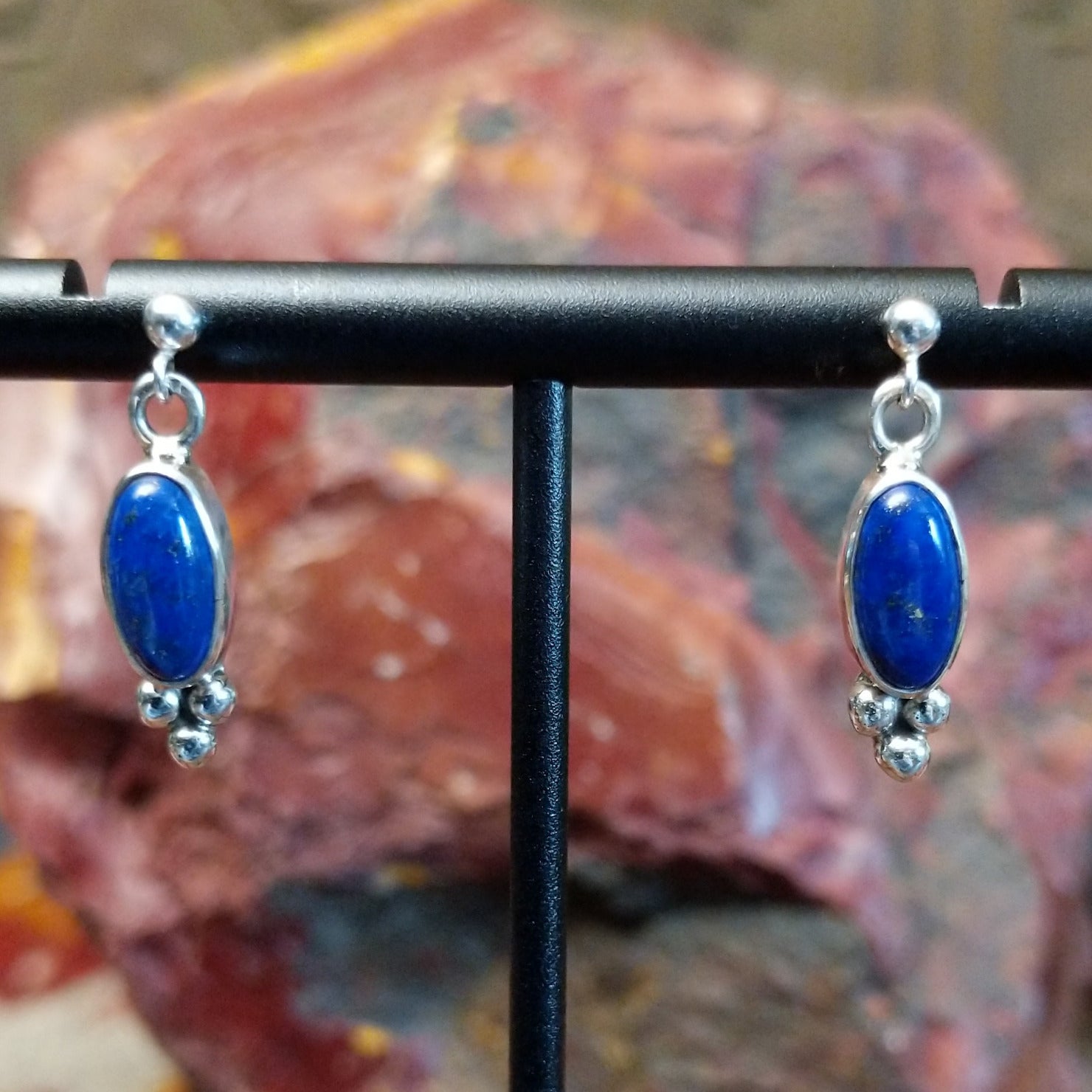 These Navajo post earrings feature deep blue lapis lazuli stones set within sterling silver bezels and framed by distinctive dotted metalwork. Crafted by artisan S.P., the design showcases secure post backs ideal for everyday wear.