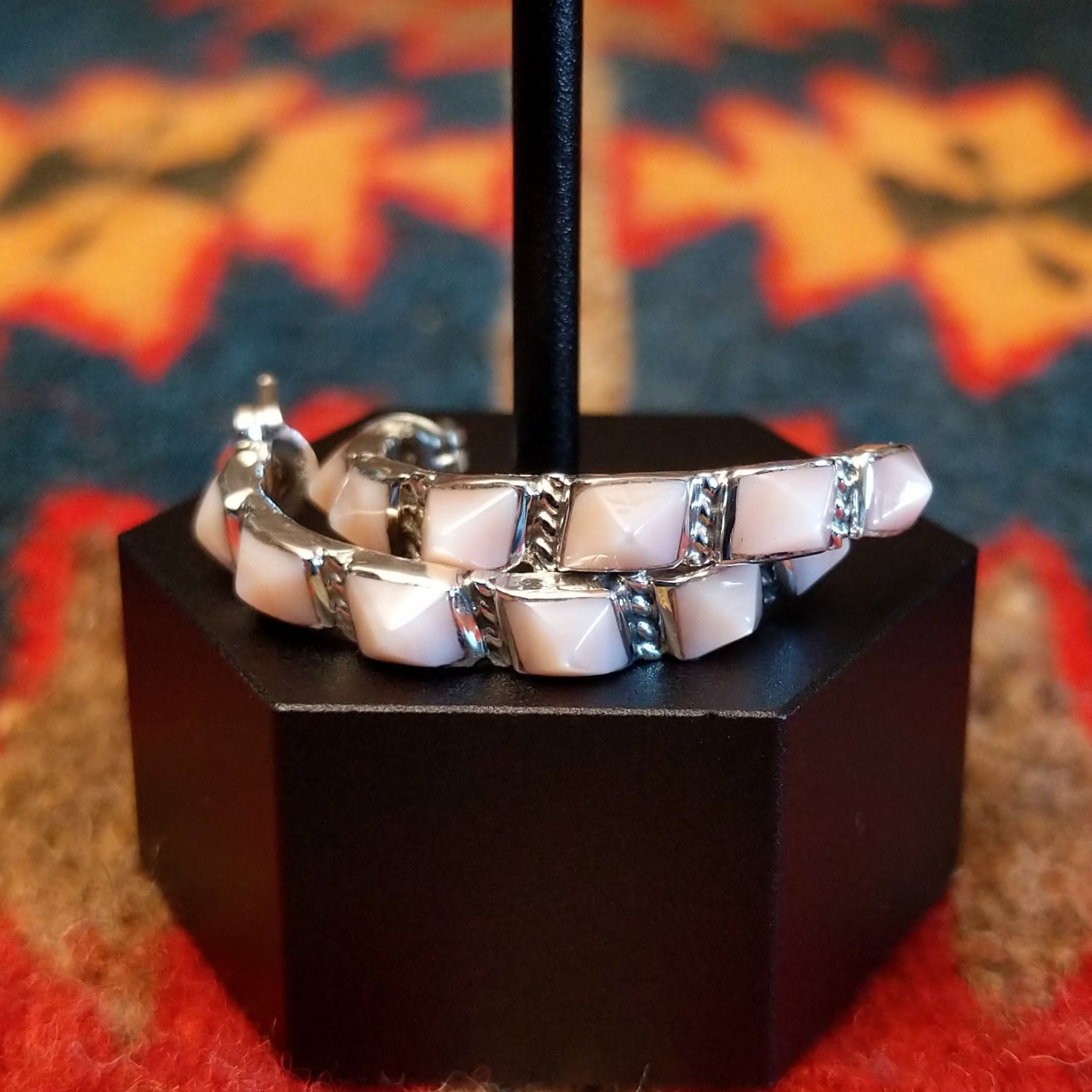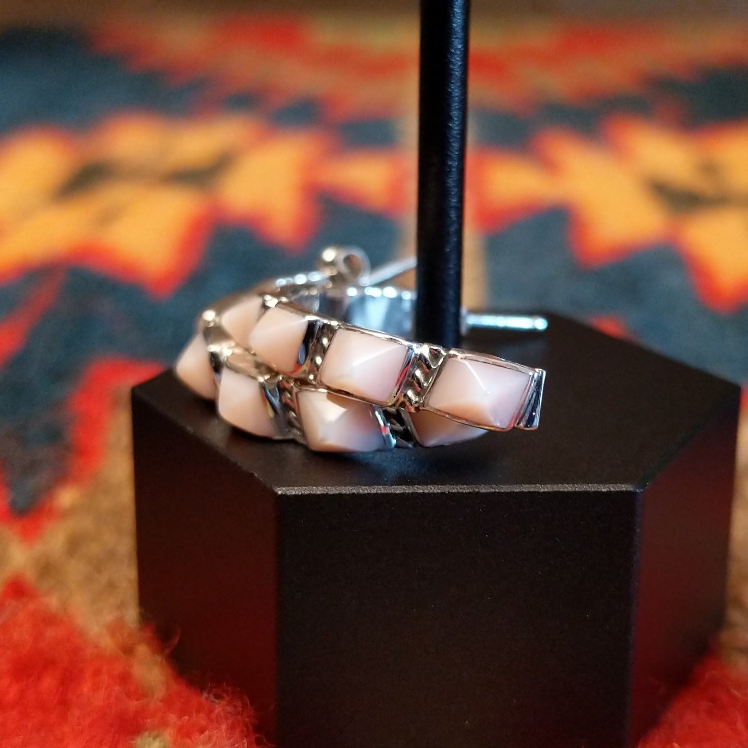These Navajo made sterling silver earrings features pink conch shells set in the square bezels. The half hoop design makes these a unique and beautiful addition for various jewelry collections.