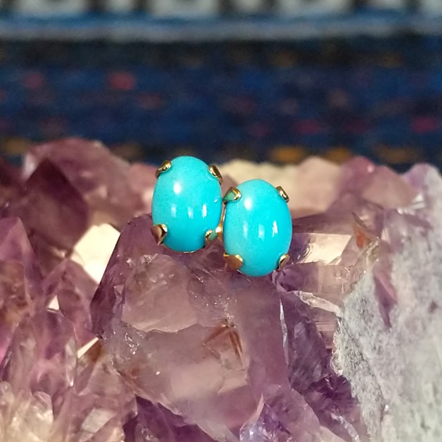 Navajo made turquoise cabochon gold earrings feature vibrant turquoise stones set in elegant gold settings, embodying their rich heritage. The smooth, oval cabochons showcase the stone's natural blue hue, complemented by the warm glow of gold, making them a timeless addition to any collection.