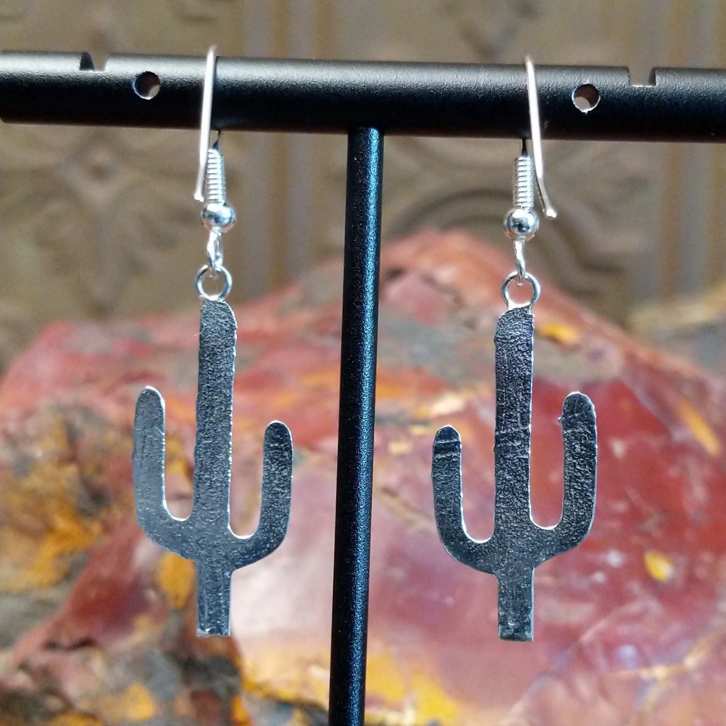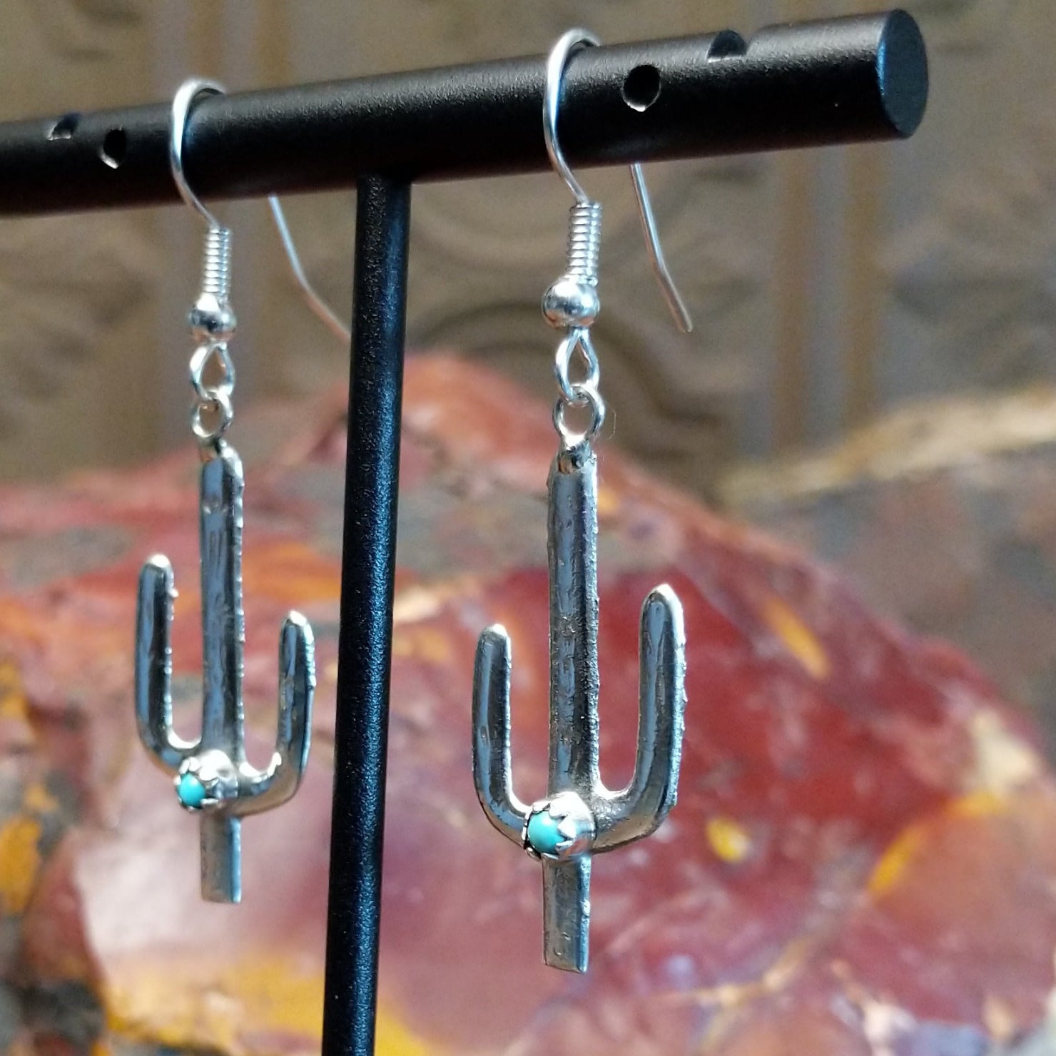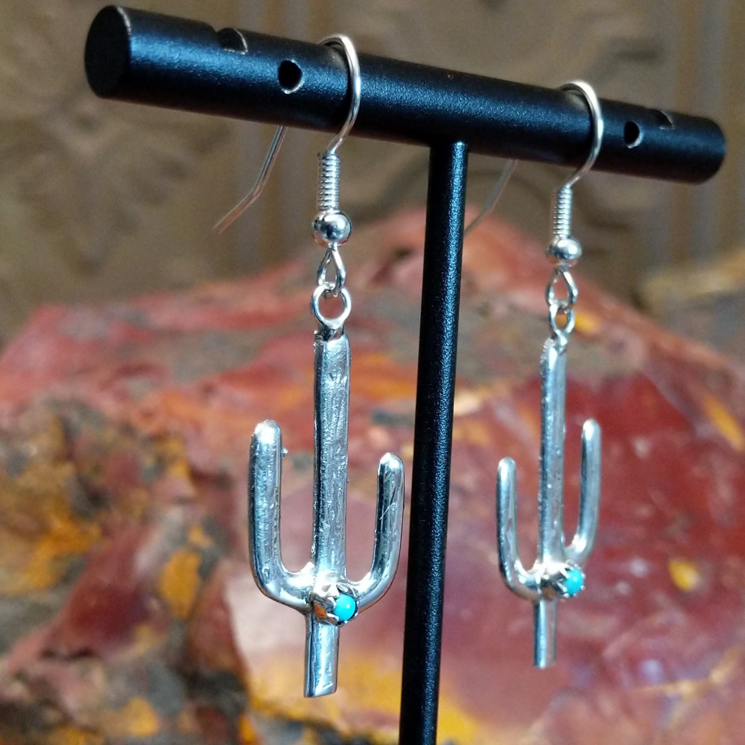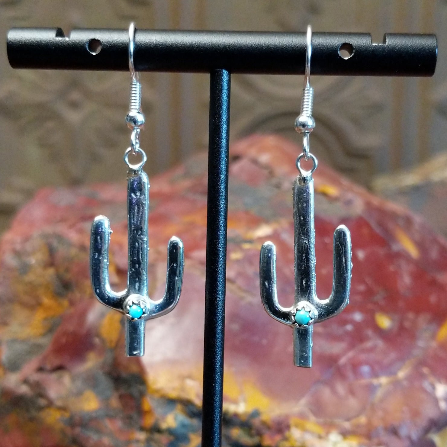 These Navajo sterling silver earrings capture the iconic saguaro cactus silhouette with vibrant turquoise stones set within notched center bezels. The polished silverwork and unique design make it a versatile piece for everyday wear or special occasions.