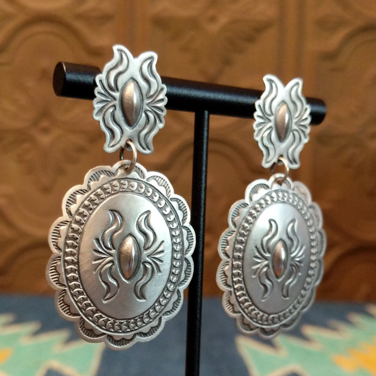 Handcrafted by Navajo artisan Harris Joe, these silver concho earrings showcase the mastery of traditional silversmiths. Made from sterling silver, each concho displays meticulous stamping and authentic silver construction.