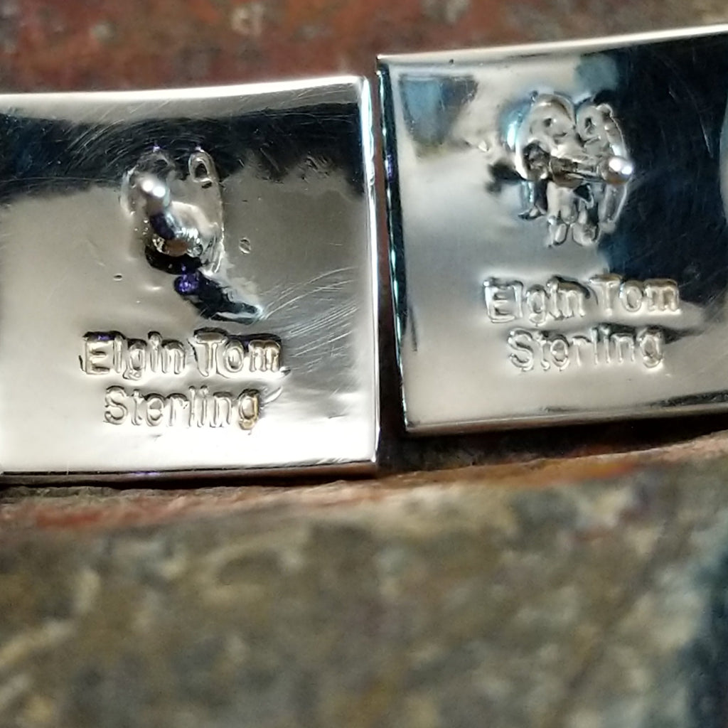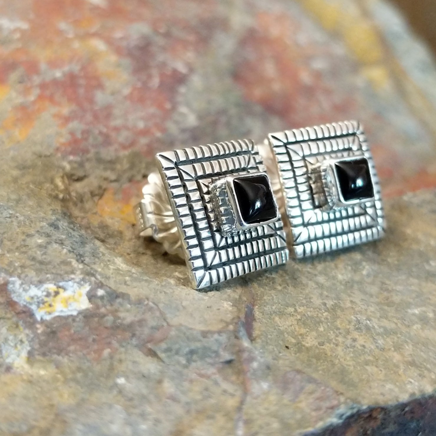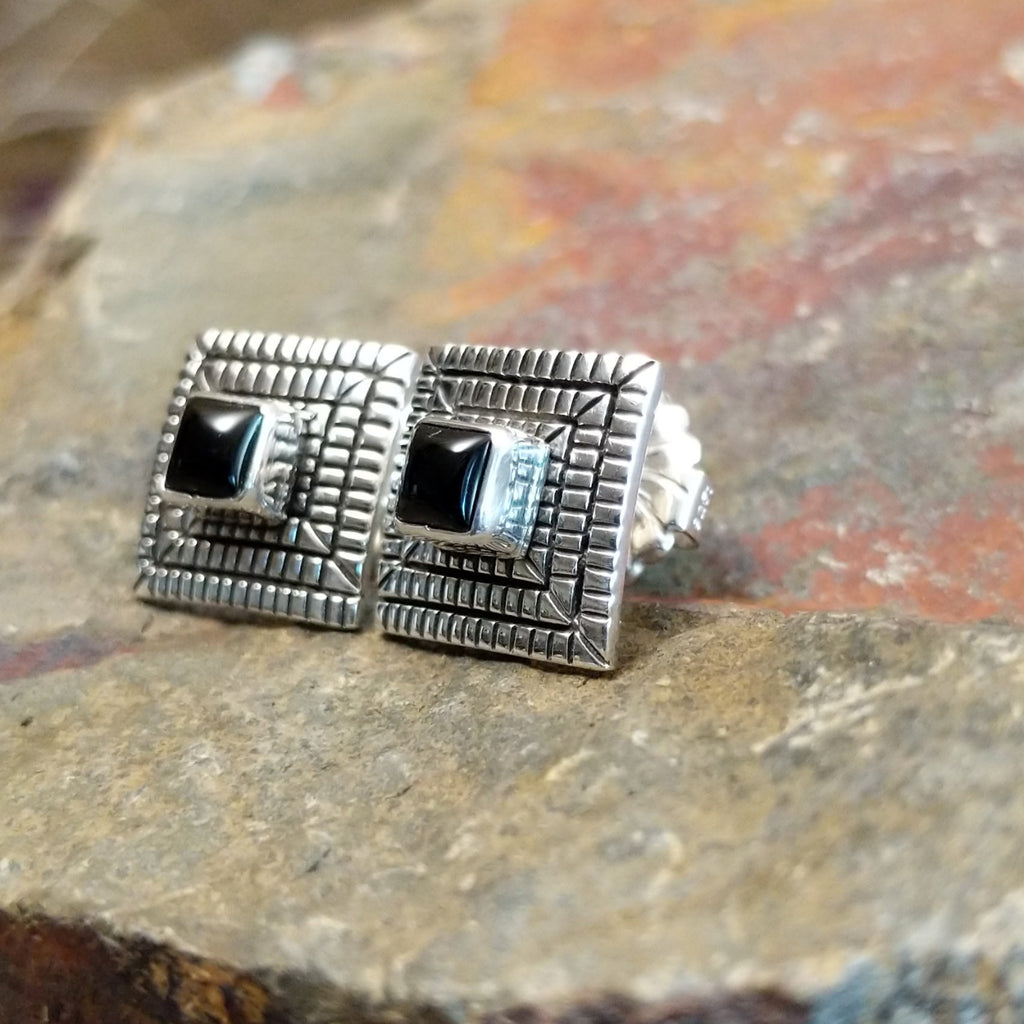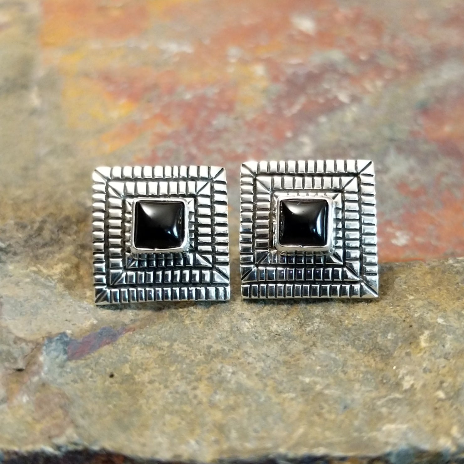 Designed by Elgin Tom, these earrings feature his unique style of patinaed linework radiating outwards from the black onyx stones. The concave silver design enhances the dark stone's appeal, prominently displaying them for all to see their beauty.