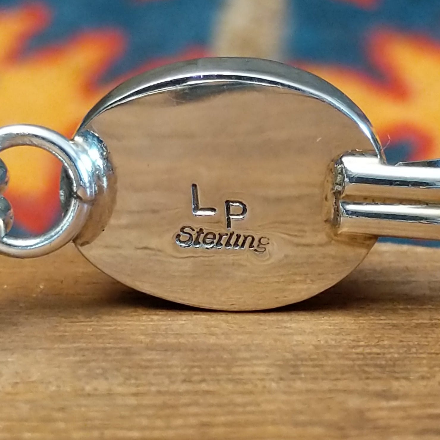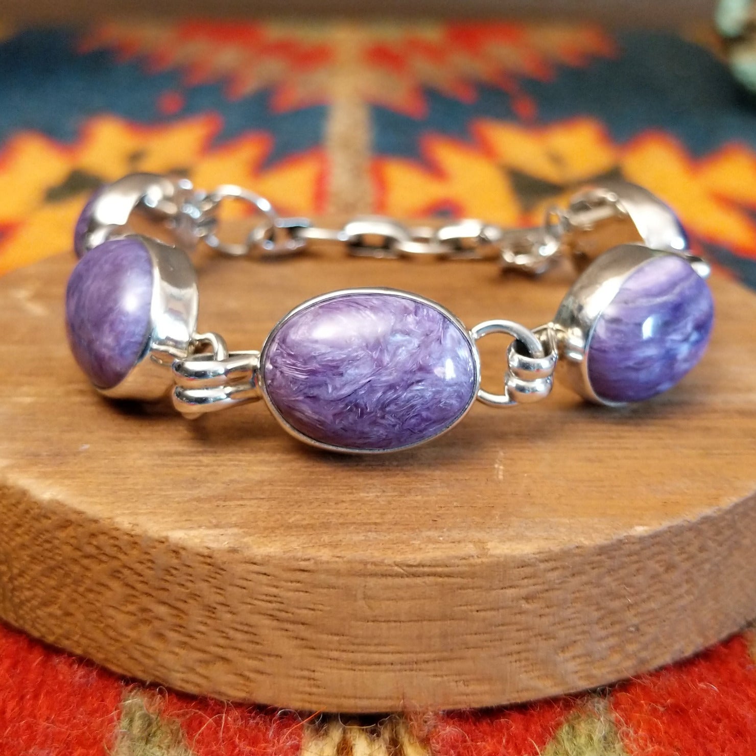 This sterling silver link bracelet by Navajo artisan Larry Pacheco features charoite set in oval bezels. The stunning design and unique hue of the stones make this a beautiful adornment for everyday wear.