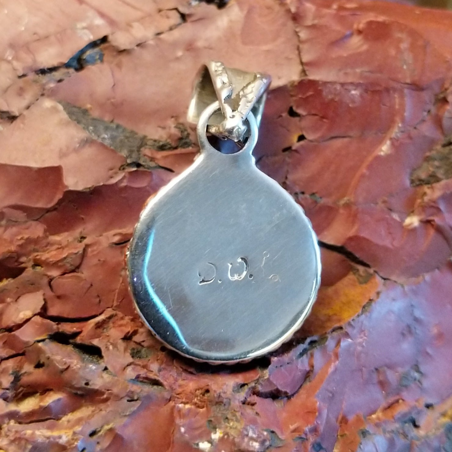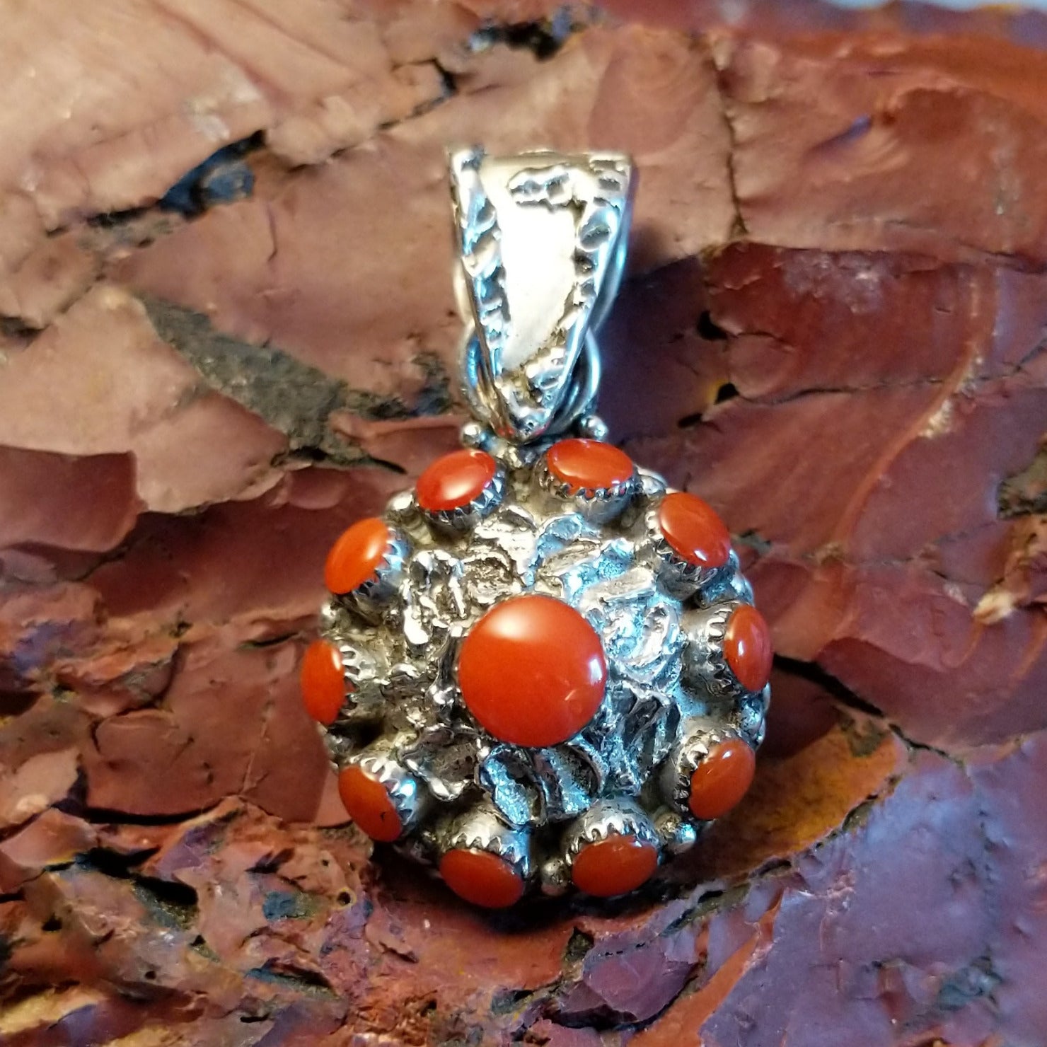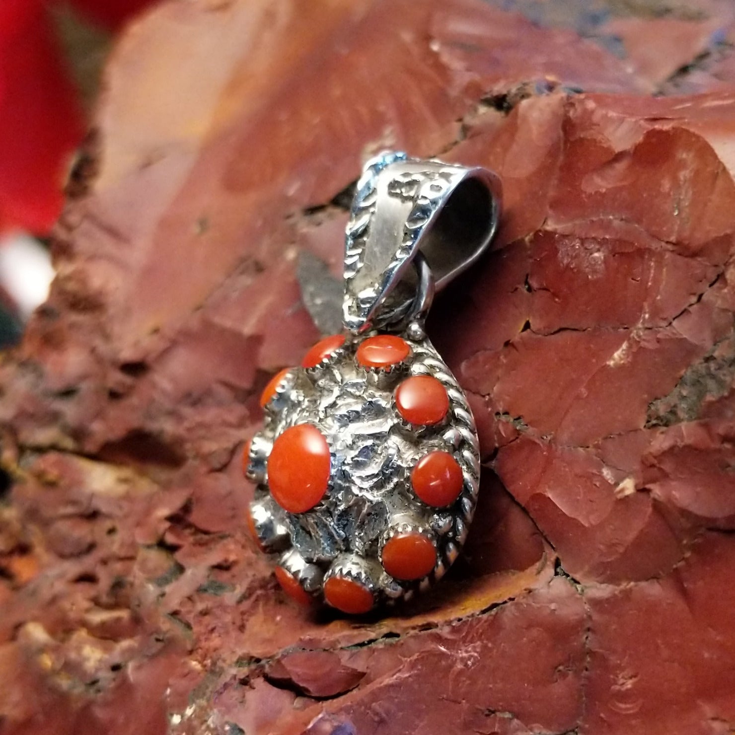 Crafted by Navajo artisan initialed D.W., this sterling silver pendant features coral set in notched bezels in a flower-like design. The pendant showcases a hammered finish, making it a unique and beautiful piece to add to your collection.