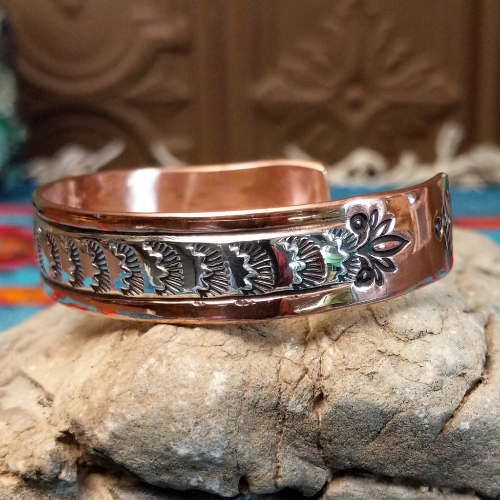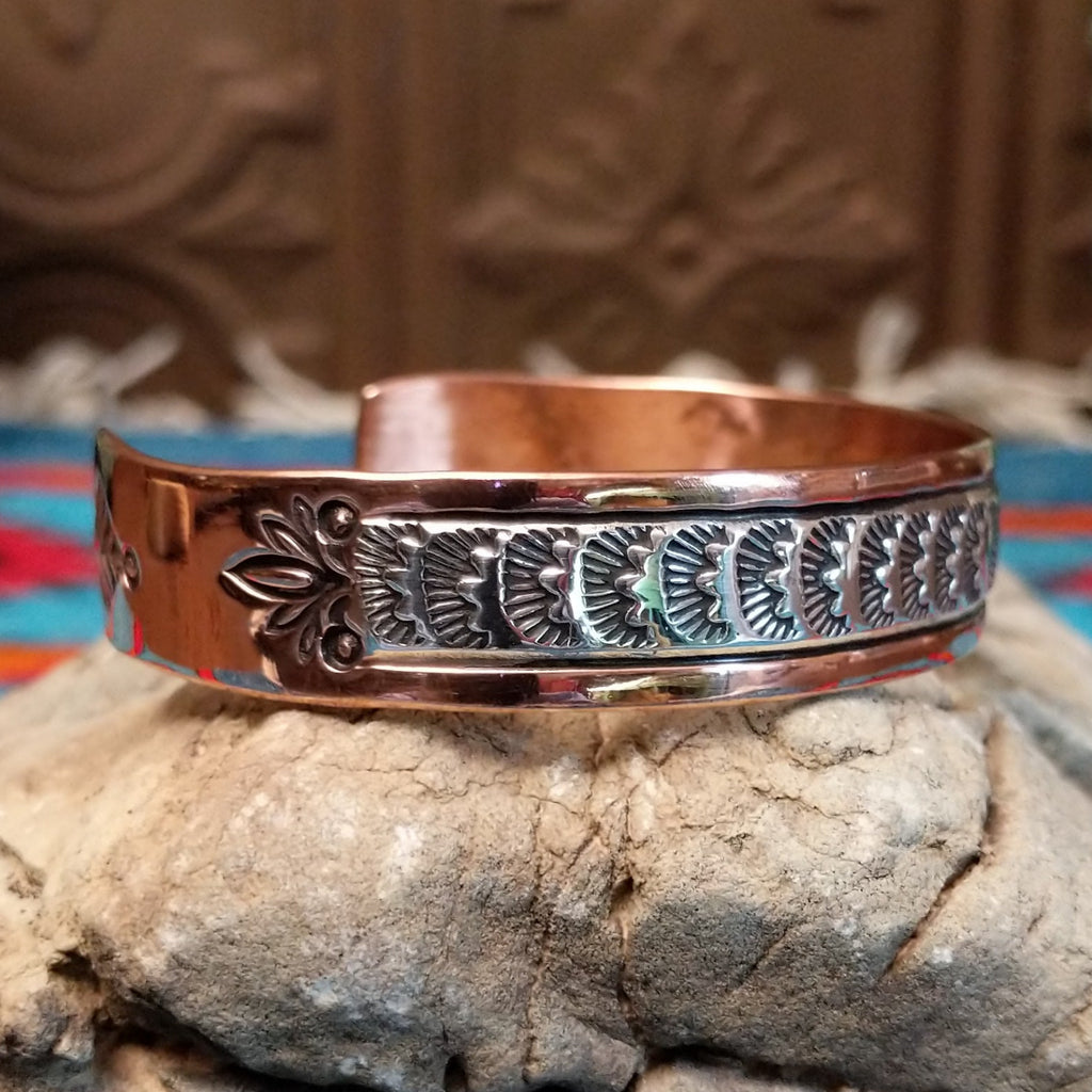 Handcrafted by Navajo artisan Robert Little, this copper and sterling silver cuff features patterned suns. The stamped details make it an eye-catching piece, perfect as a standalone accessory or paired with various adornments.