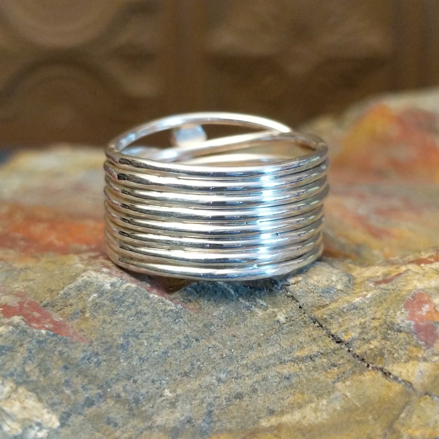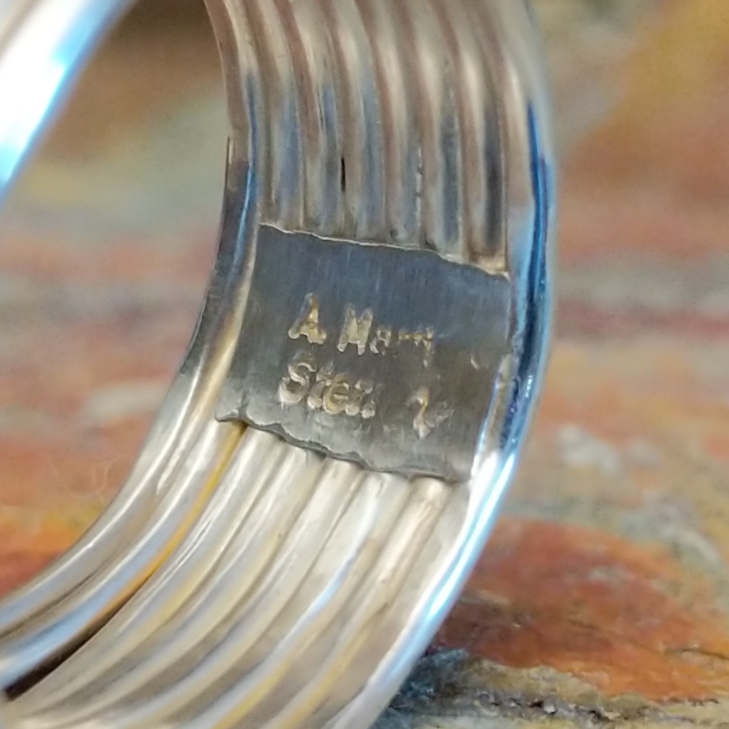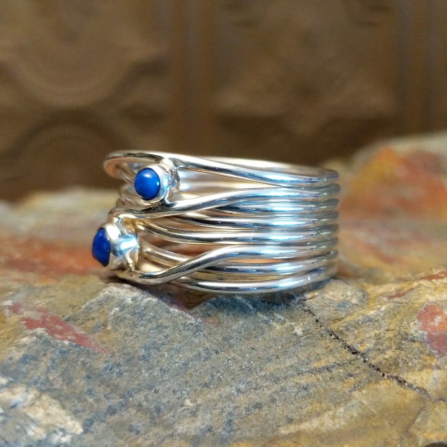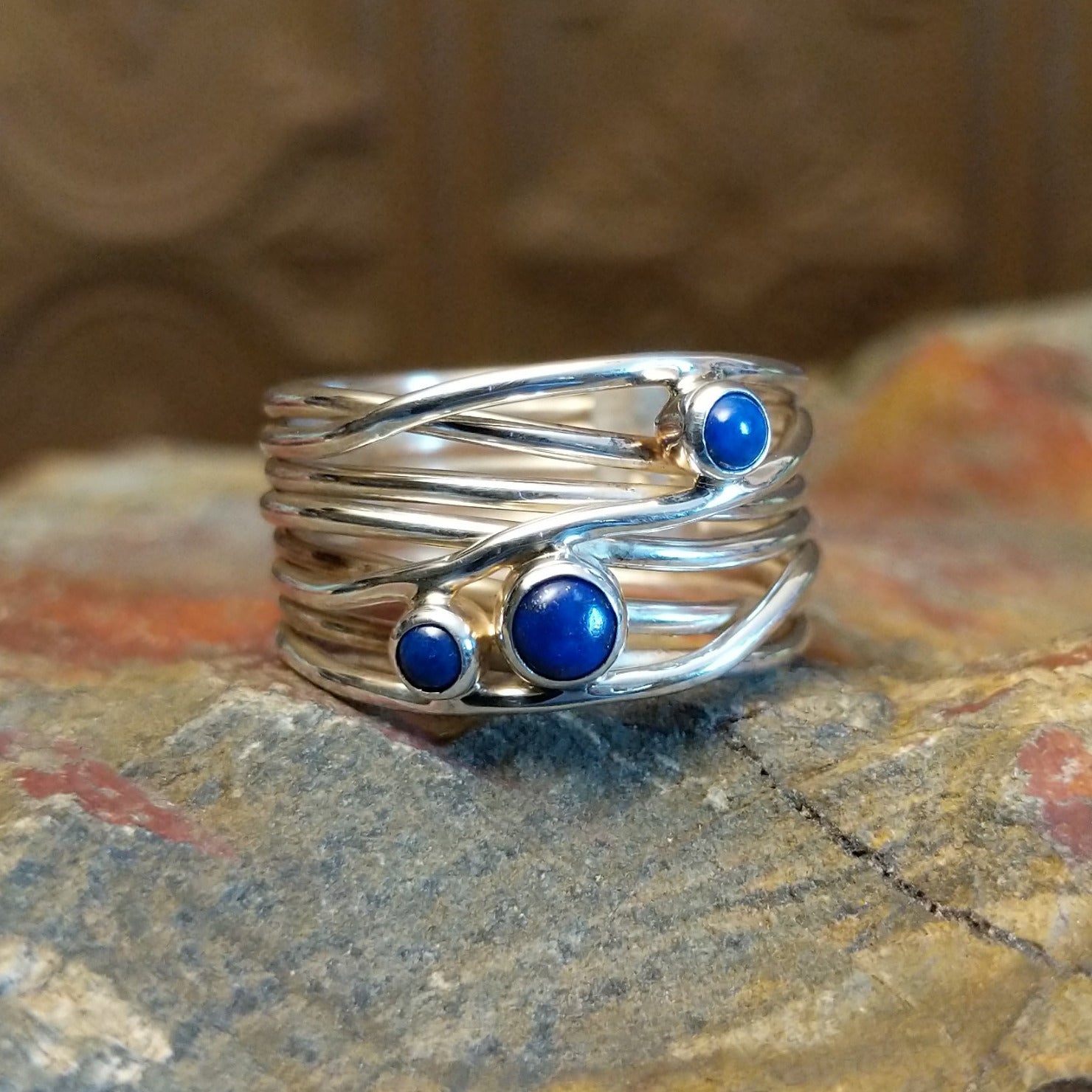 This sterling silver ring by Navajo artisan Angela Martin features a distinctive wiry layered band. Three round bezels showcase lapis, creating a sophisticated piece that is perfect as a standalone or layered adornment.