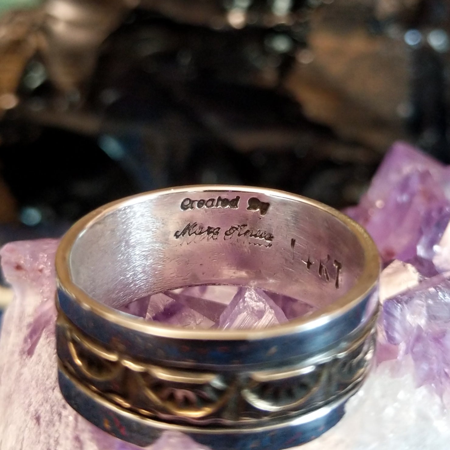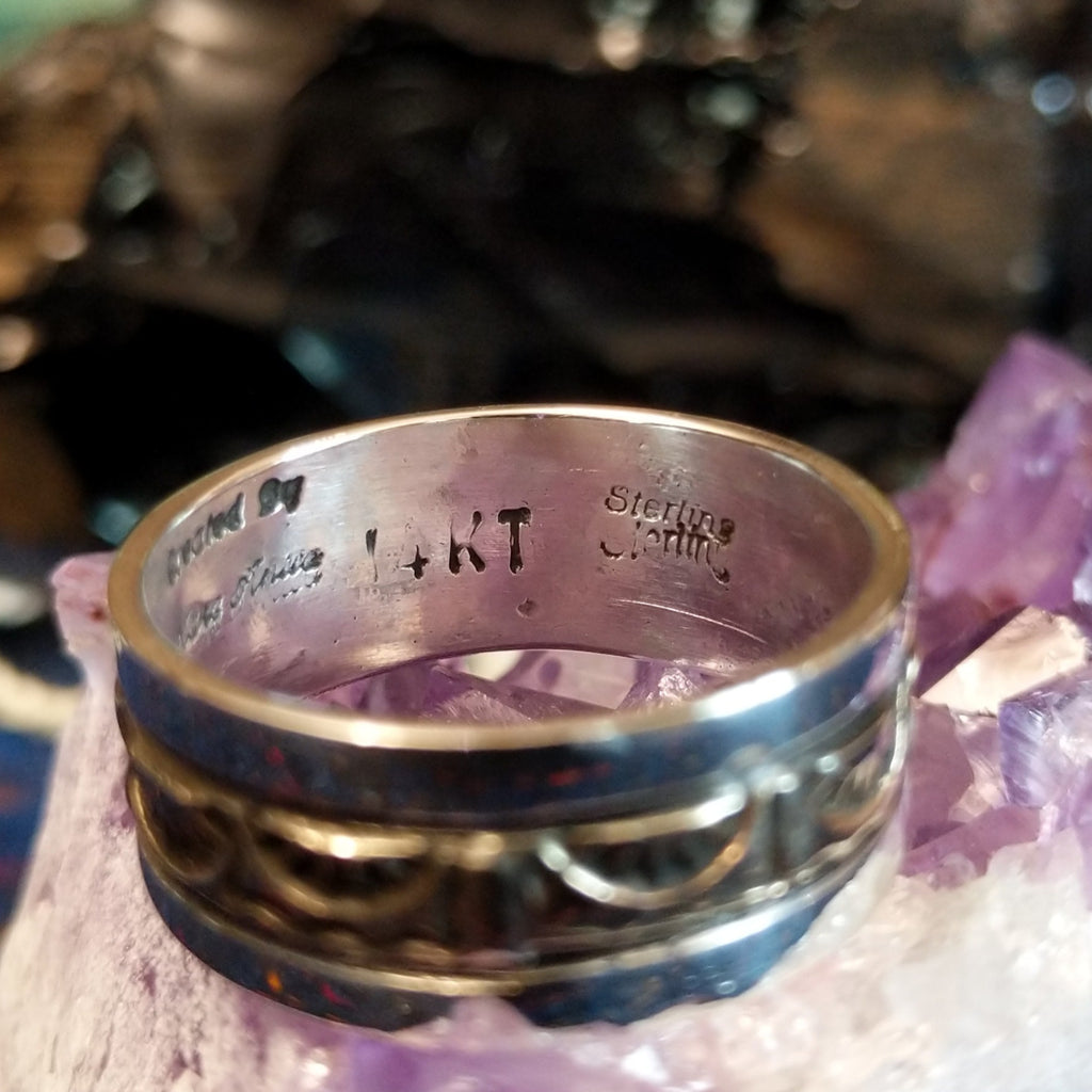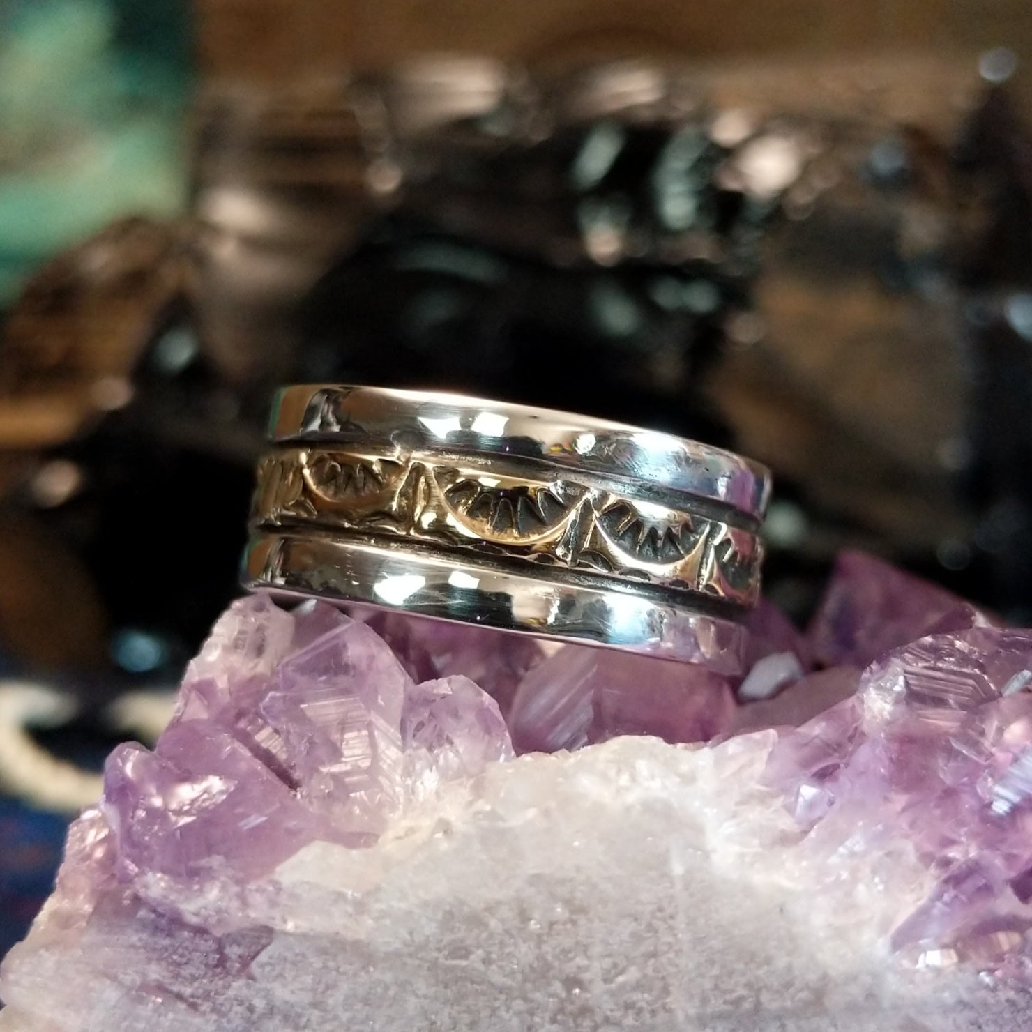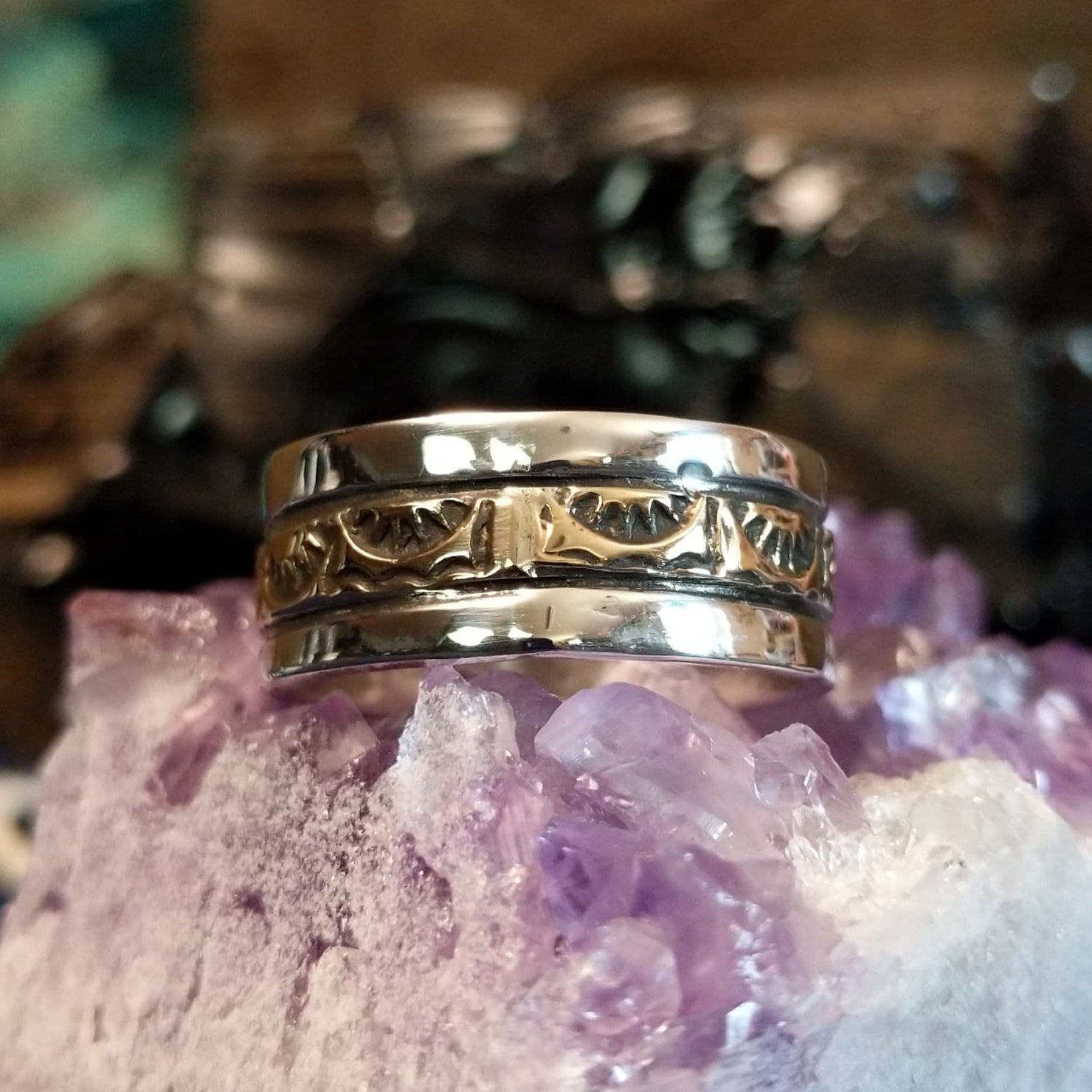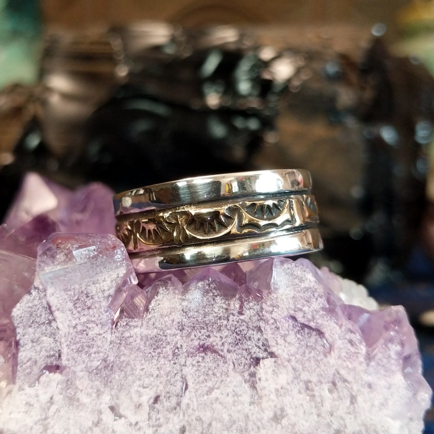 This Native American 14K gold and silver ring by Marc Antia is a masterful blend of two timeless metals. Featuring a bold gold band adorned with detailed engravings, set against a polished sterling silver band, this ring embodies both elegance and craftsmanship.