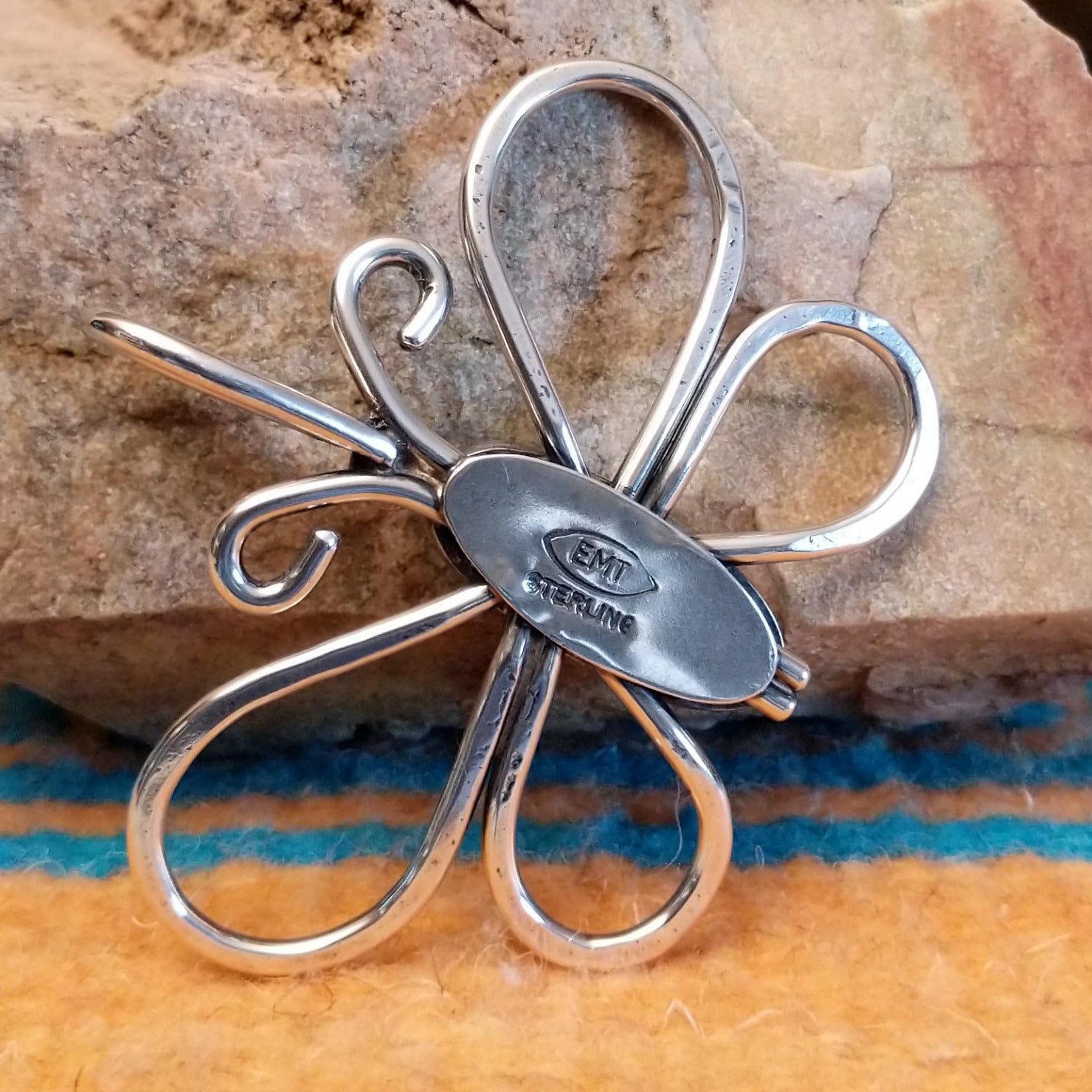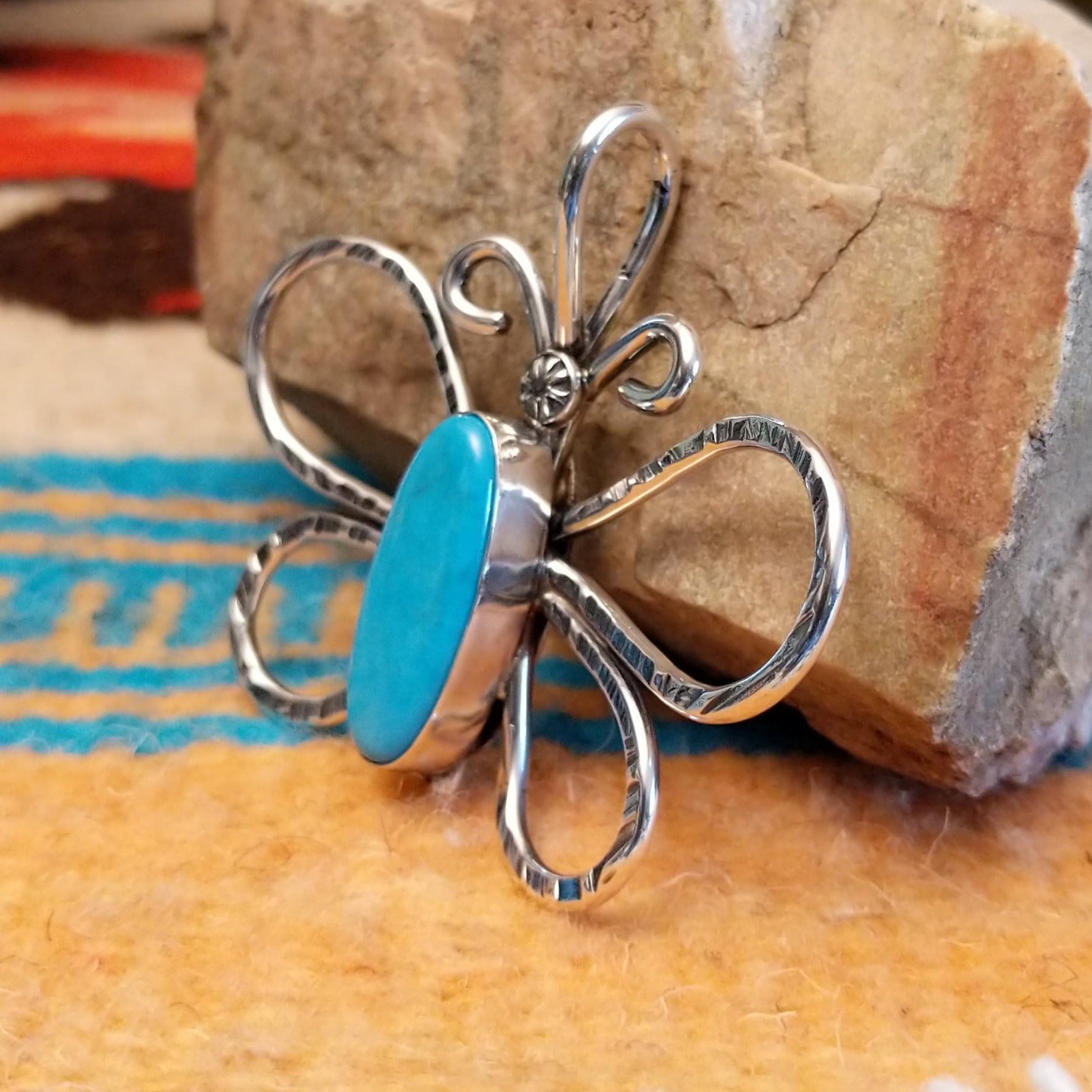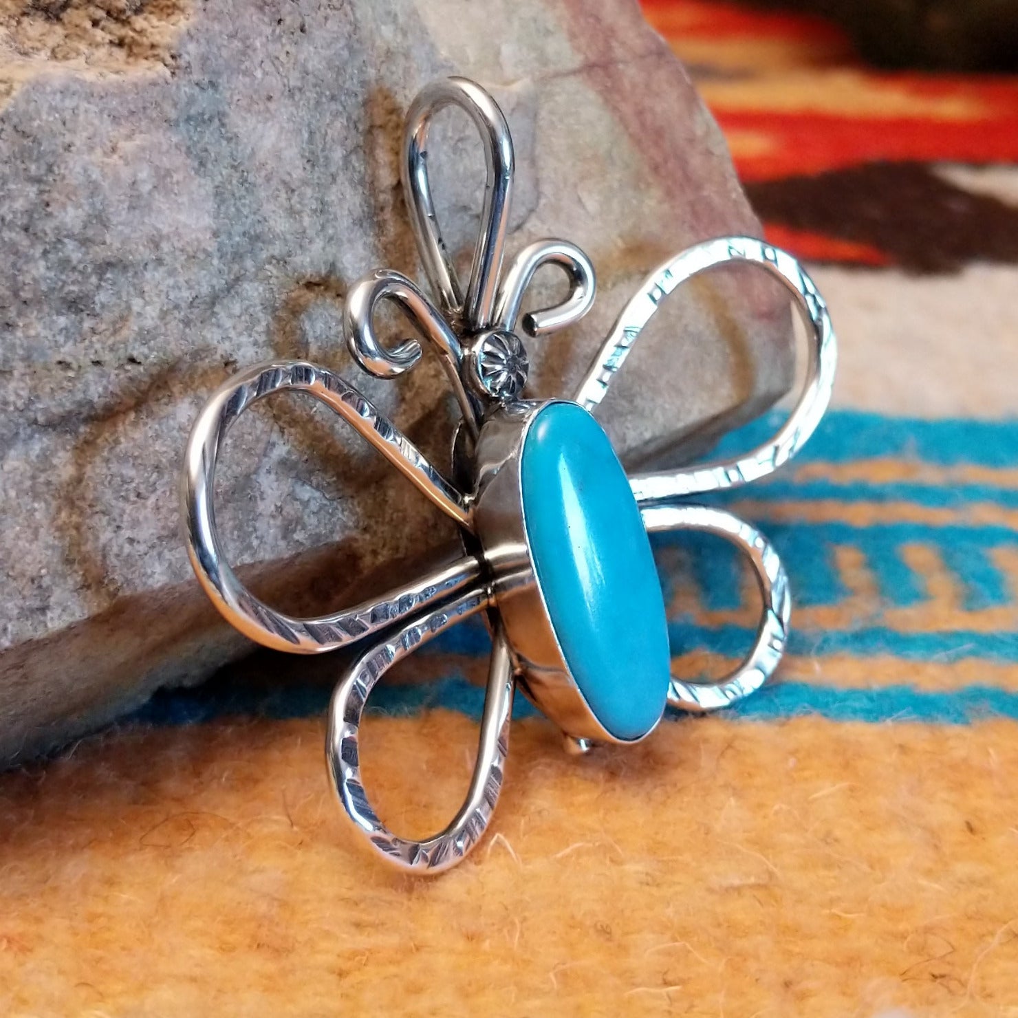 This sterling silver pendant by Navajo artisans Everett and Mary Teller features Kingman turquoise set in an oval bezel that makes up the body of the butterfly. Delicate silverwork is used to create an open wing design that makes this a beautiful adornment for collectors.