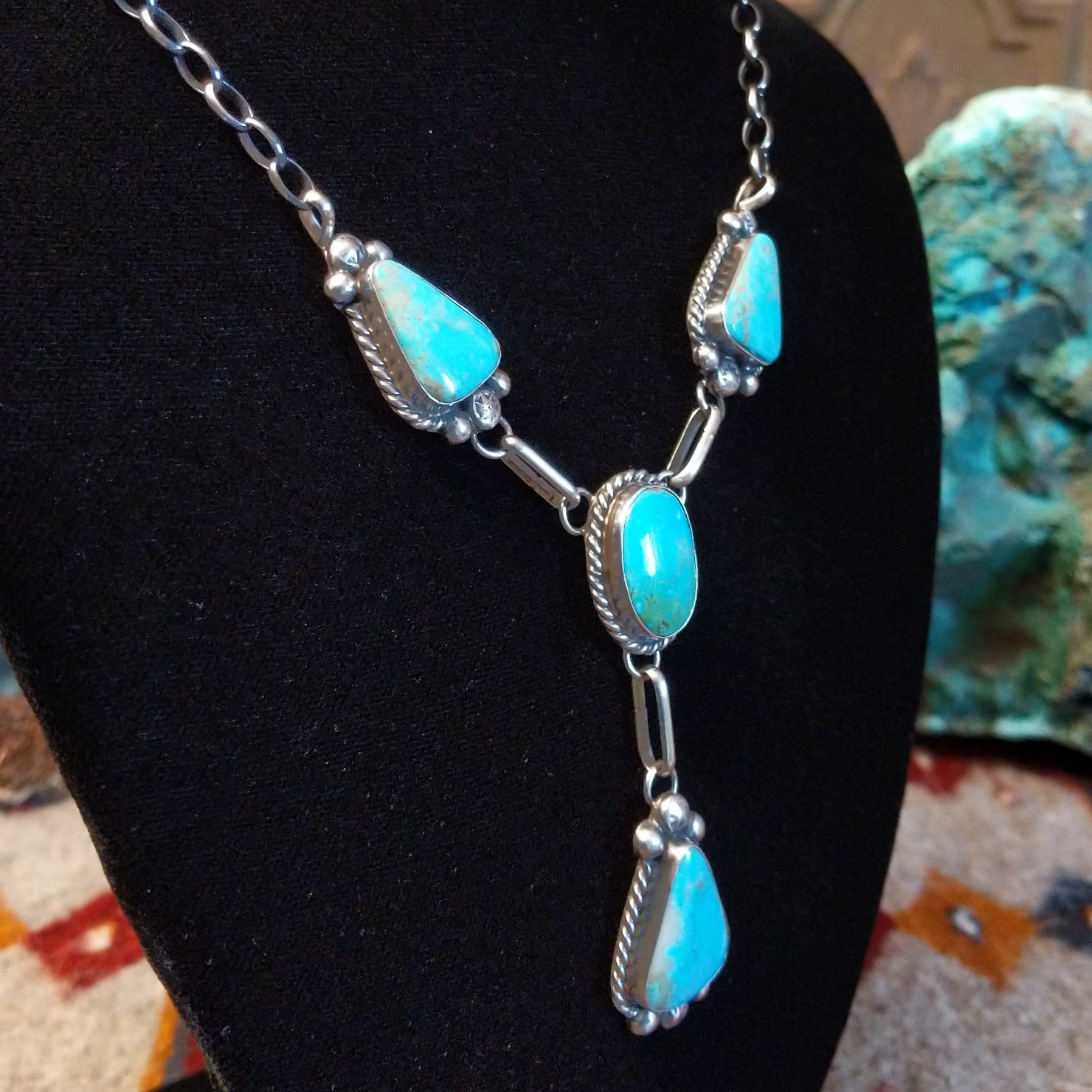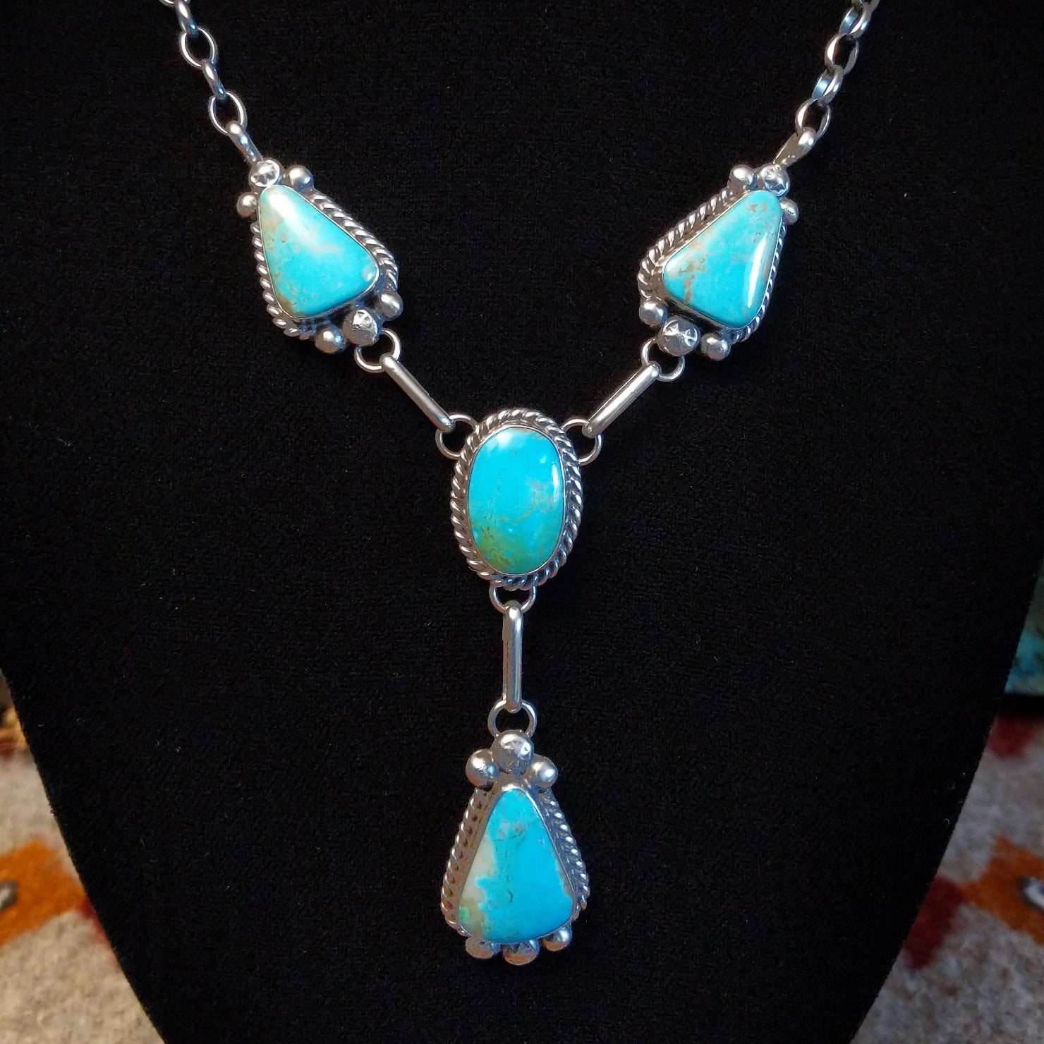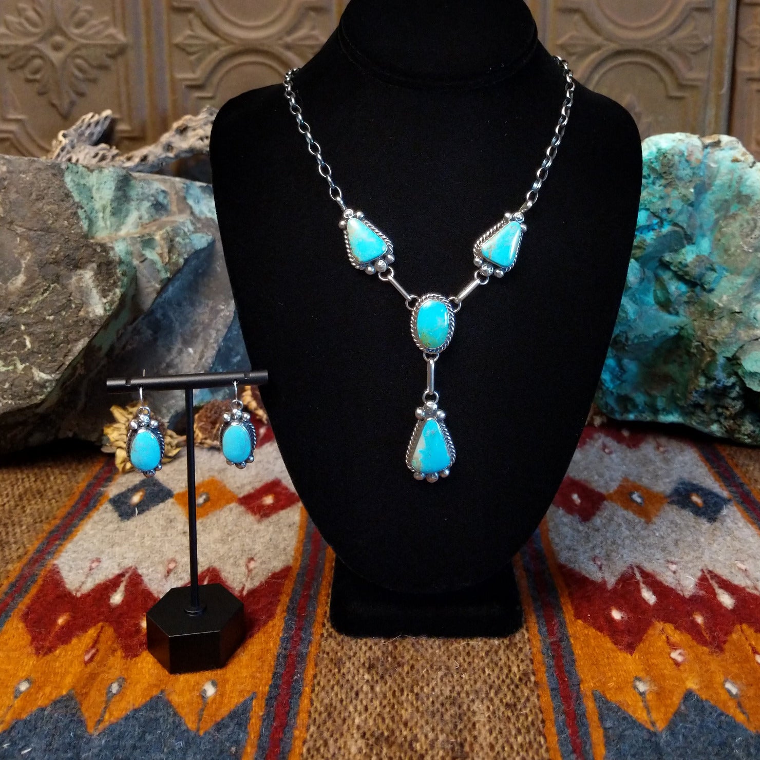 This handcrafted set by Navajo artisan Augustine Largo showcases authentic Kingman turquoise stones secured in bezels, with the necklace featuring four graduated drops. Intricate dotted and twisted rope detailing frames each stone, with coordinating drop earrings that complete the beautiful set.
