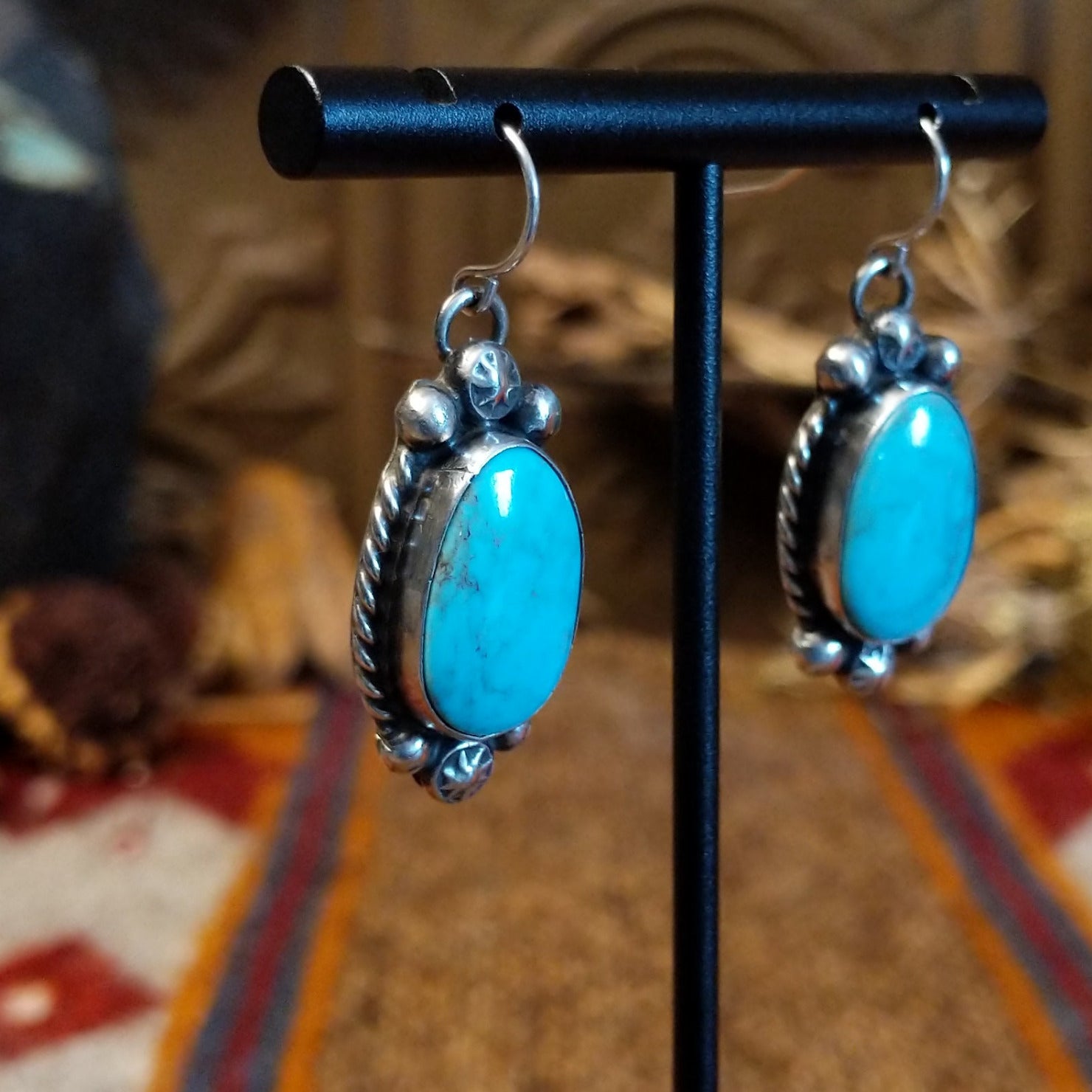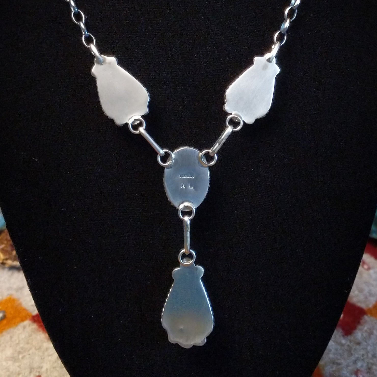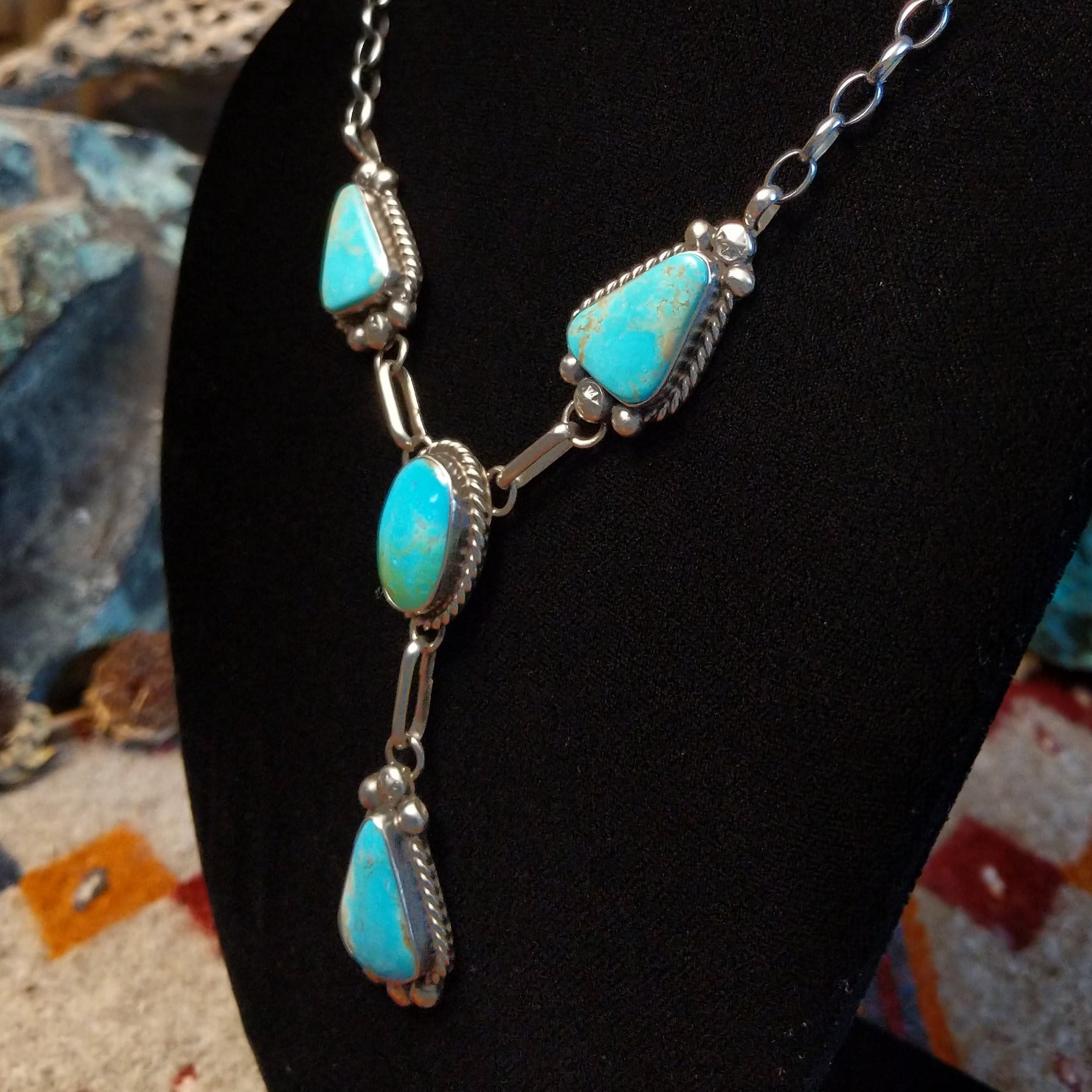 This handcrafted set by Navajo artisan Augustine Largo showcases authentic Kingman turquoise stones secured in bezels, with the necklace featuring four graduated drops. Intricate dotted and twisted rope detailing frames each stone, with coordinating drop earrings that complete the beautiful set.