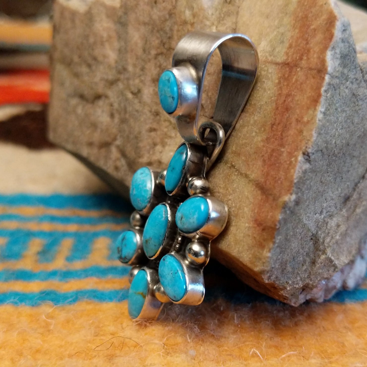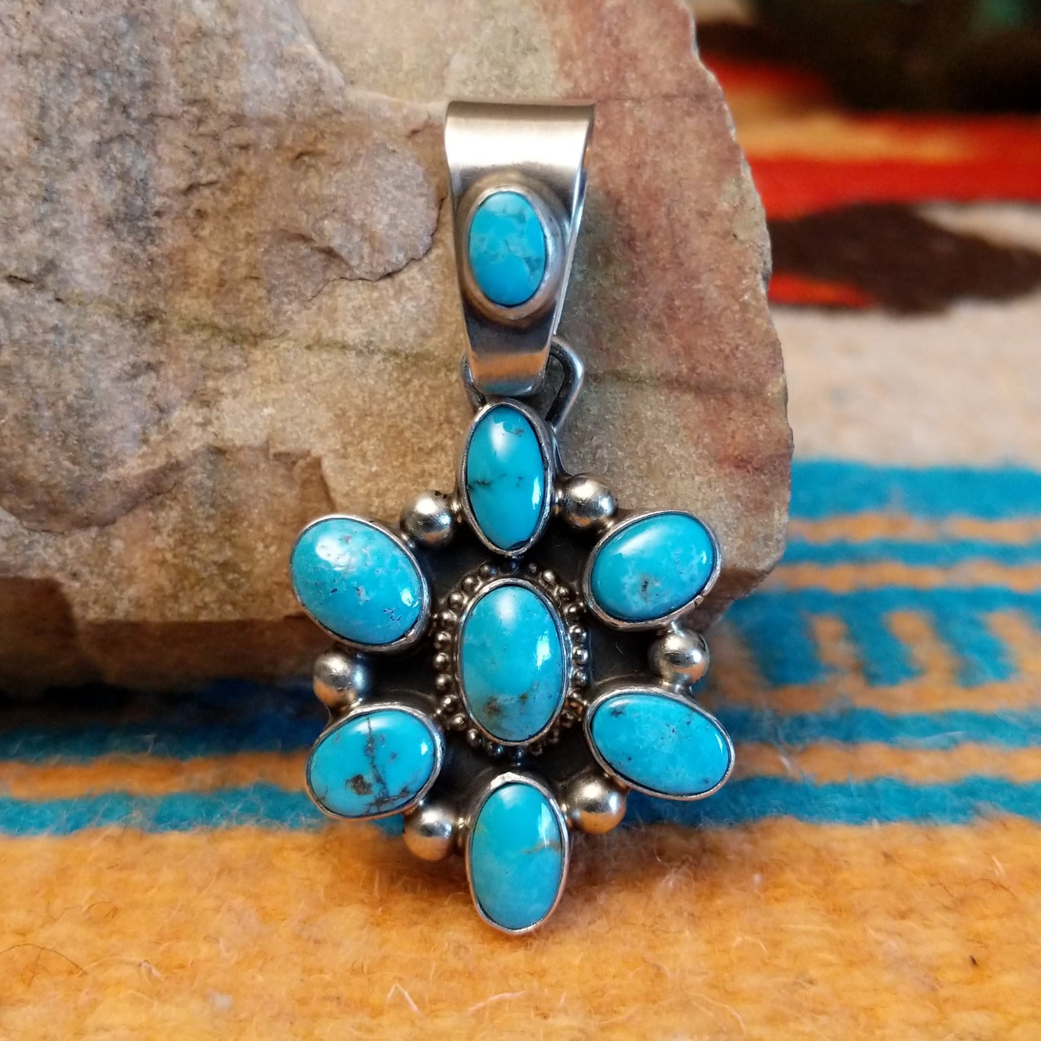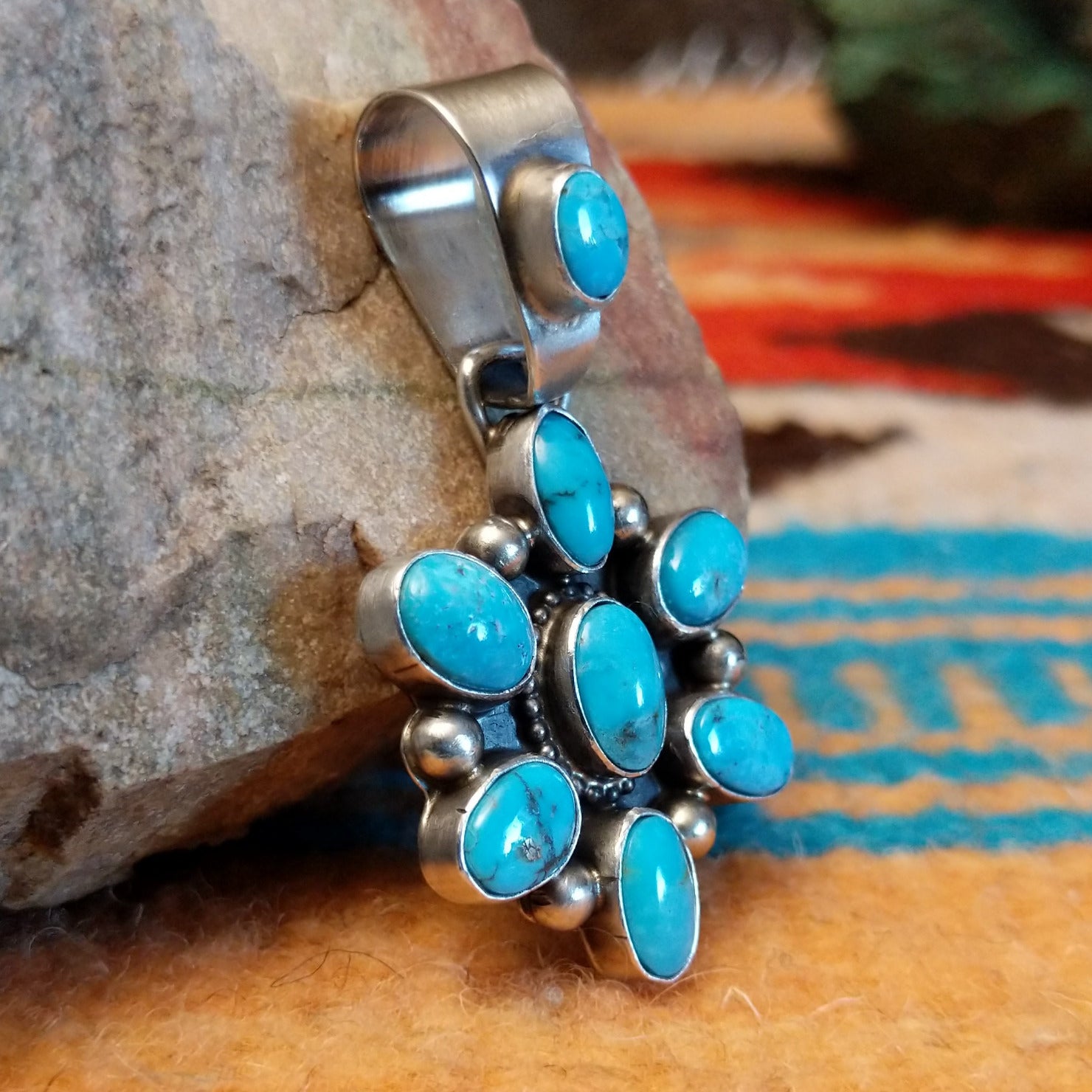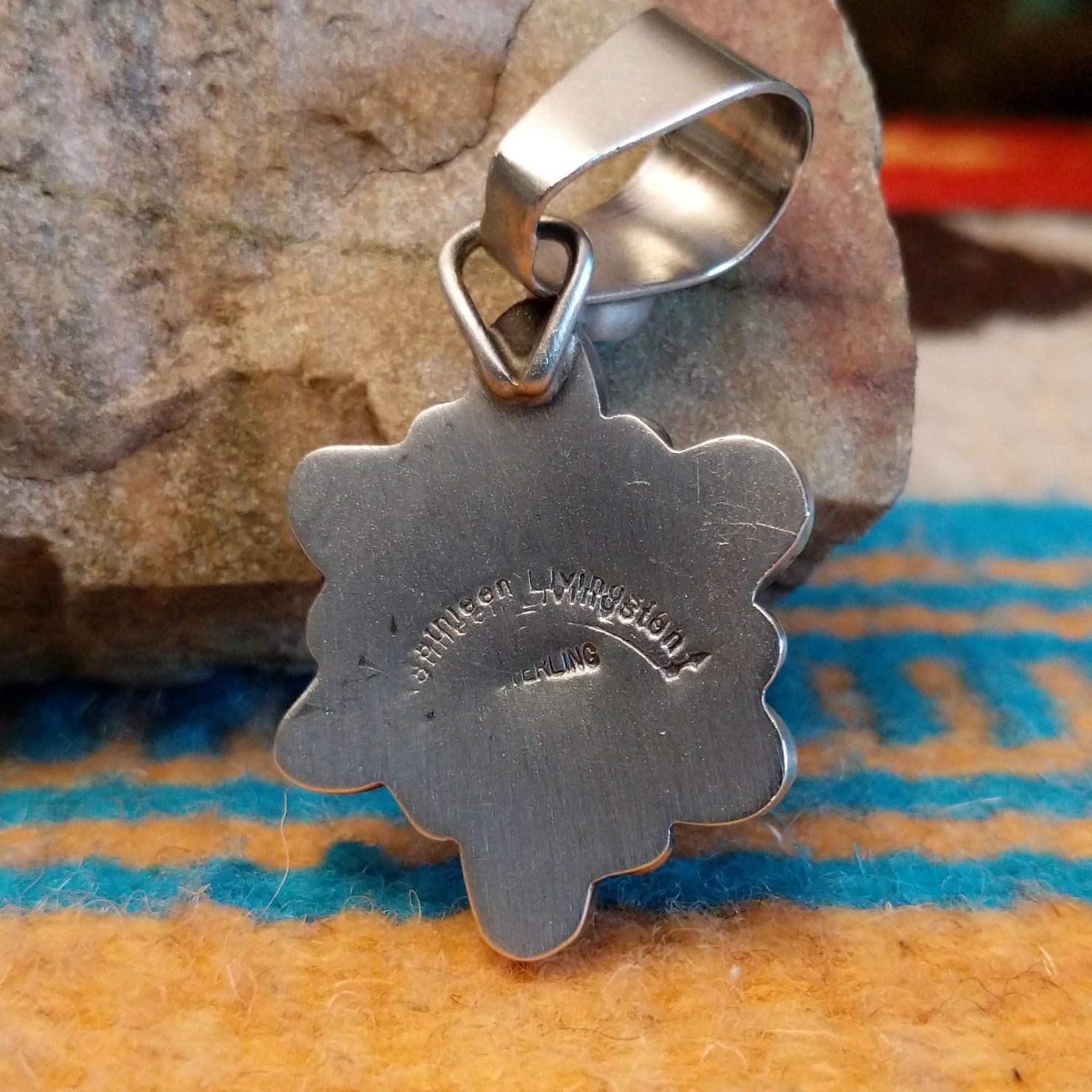 This sterling silver pendant by Navajo artisan Kathleen Livingston features Kingman turquoise set in oval bezels that create a starburst design. The center stone is framed by twisted rope accents that create a stunning addition for various collections.