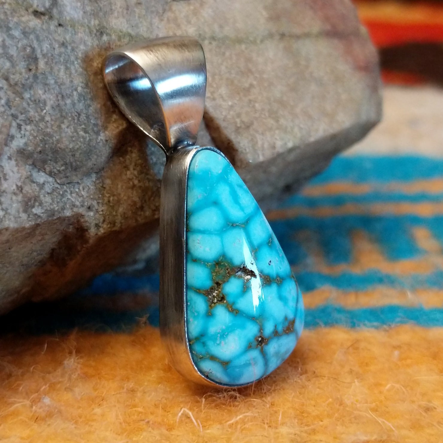 This sterling silver pendant crafted by Navajo artisan Bernyse Chavez features Kingman turquoise set in the teardrop bezel. The unique matrix of the stone makes this a stunning adornment for various occasions.