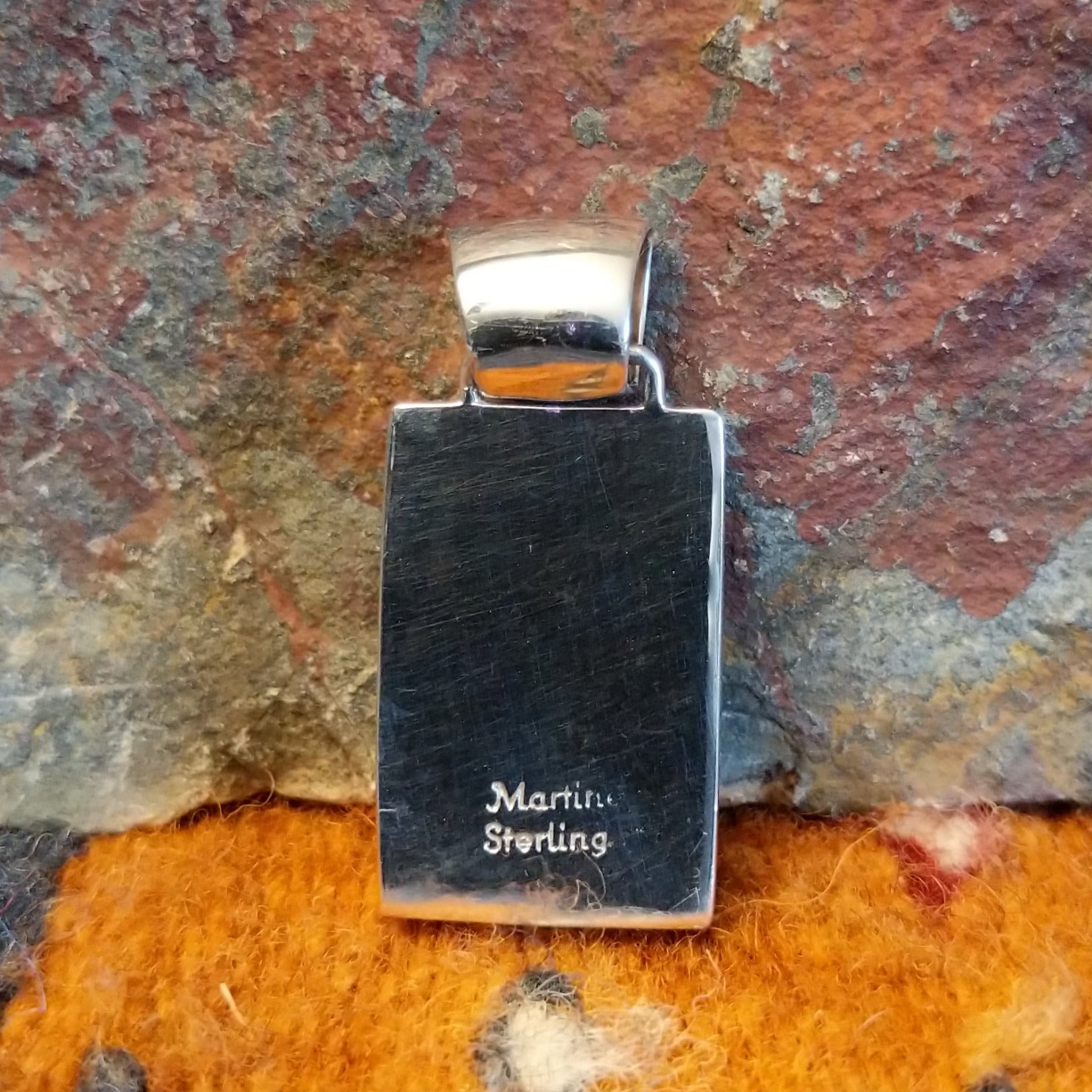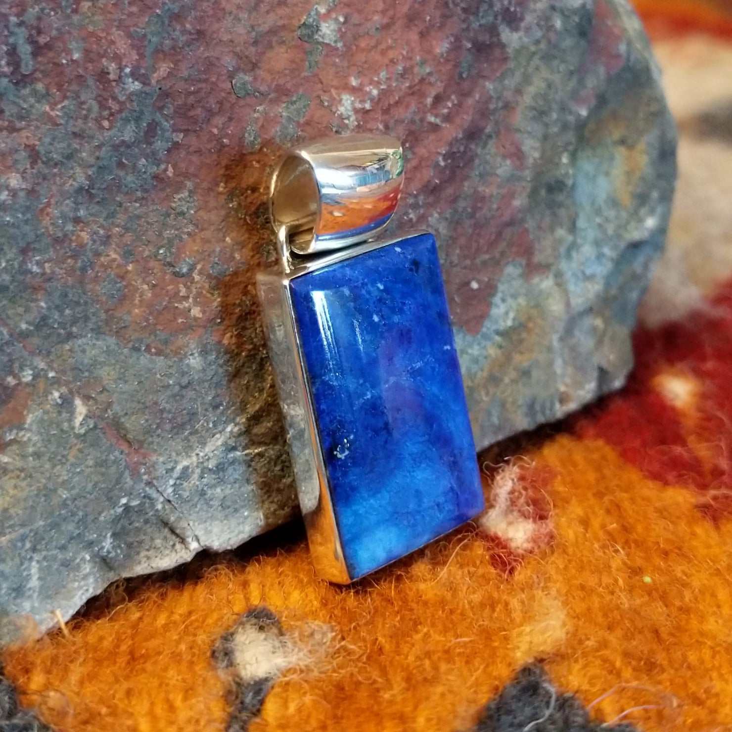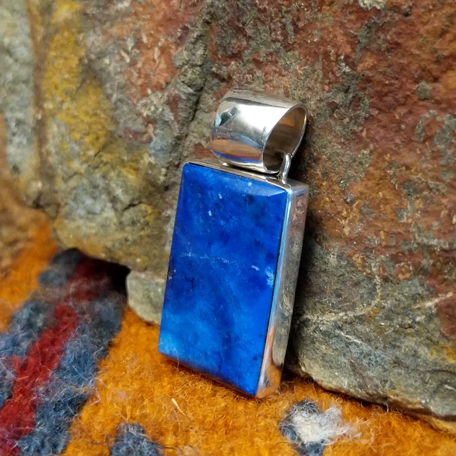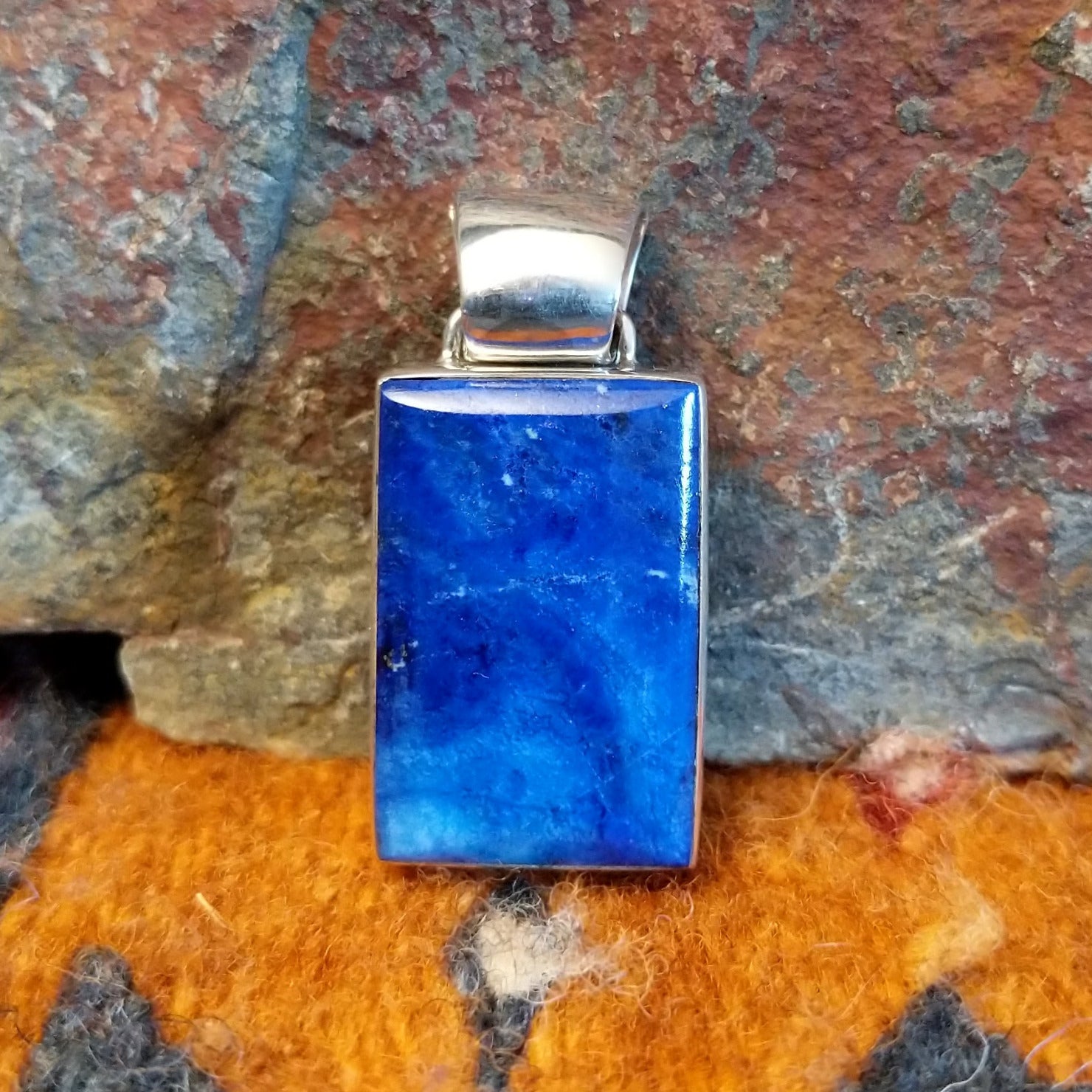 Crafted by Navajo artisan Martine, this rectangular sterling silver pendant presents a polished lapis lazuli stone set within a secure bezel. The piece is a balanced addition, making it a versatile adornment for everyday and formal wear.