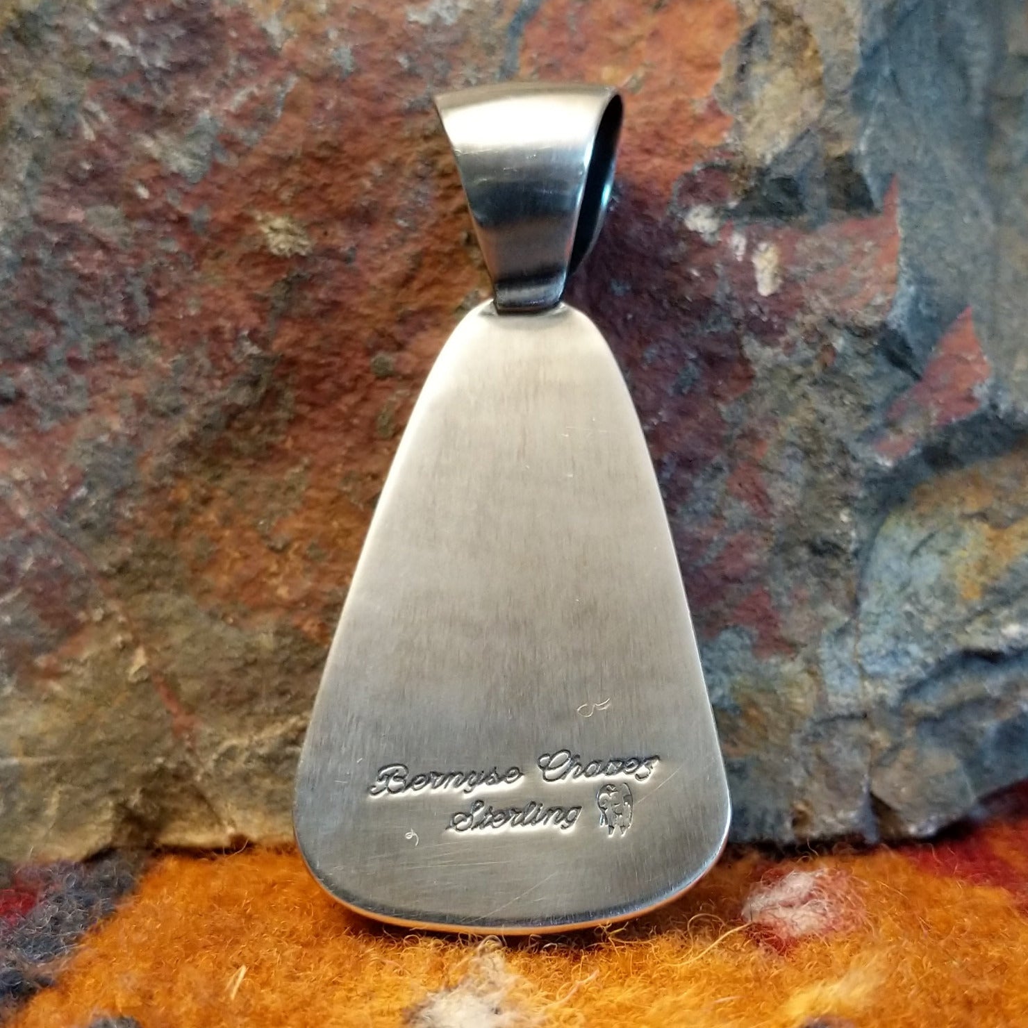 Crafted by Navajo artisan Bernyse Chavez, this triangular sterling silver pendant showcases a striking palomino variscite stone with a prominent pyrite inclusion, all secured within the bezel. The distinctive hues and natural mineral composition create an eye-catching focal point, a perfect accessory for various occasions.