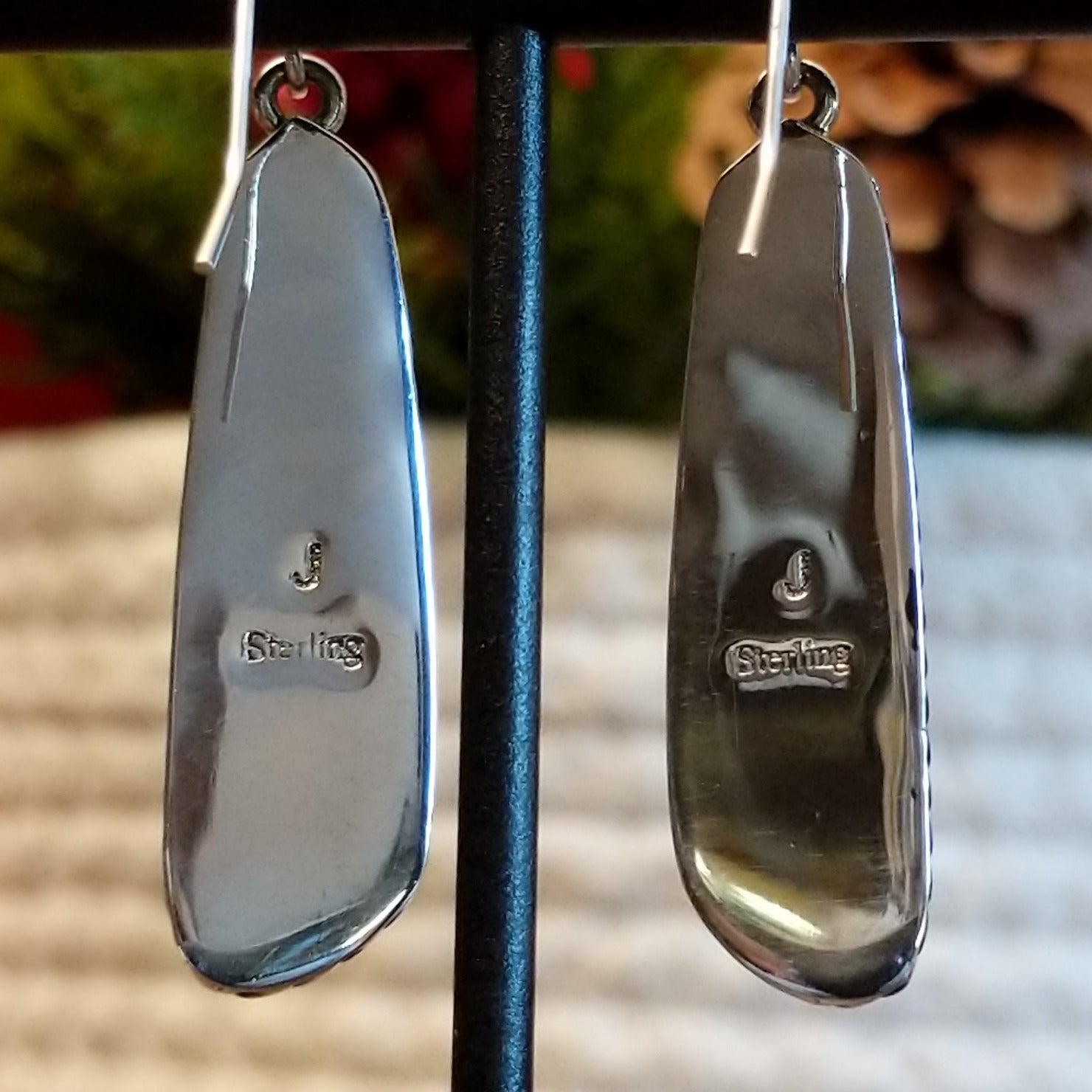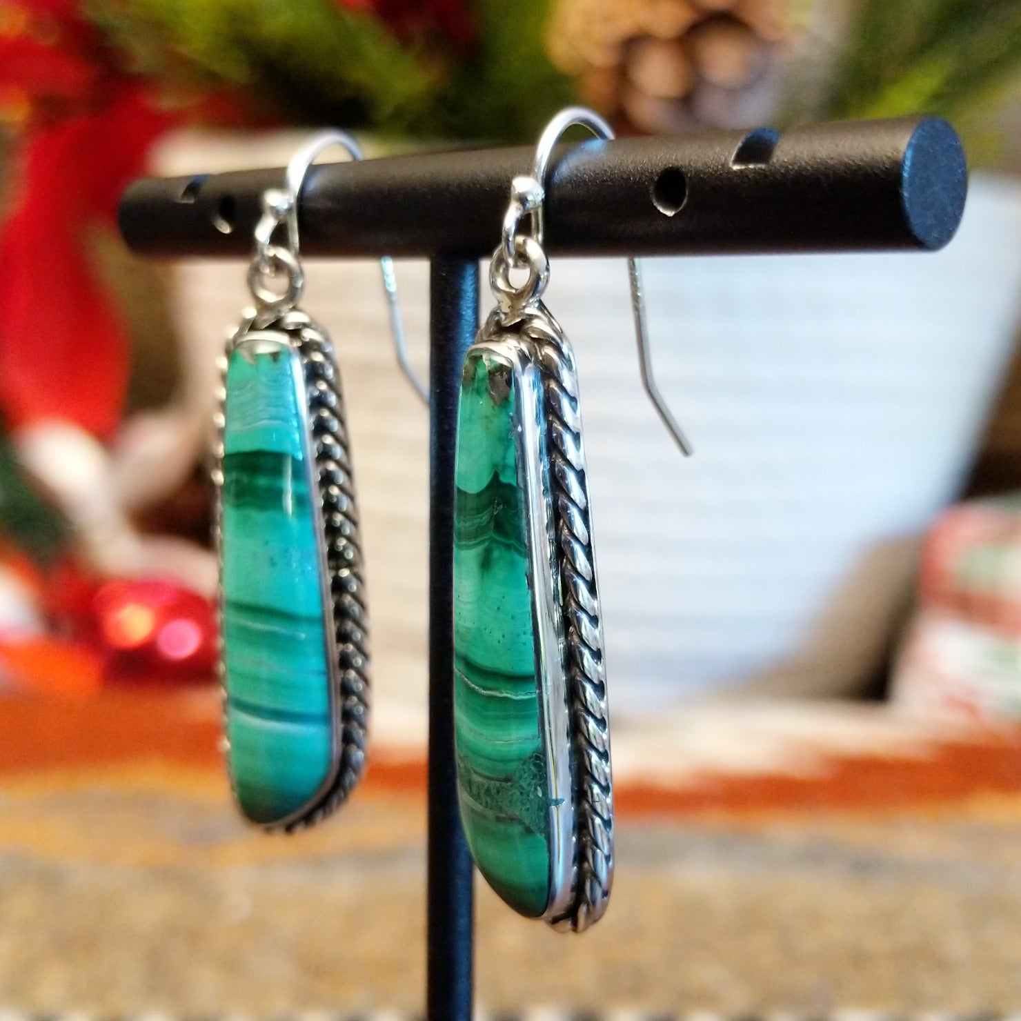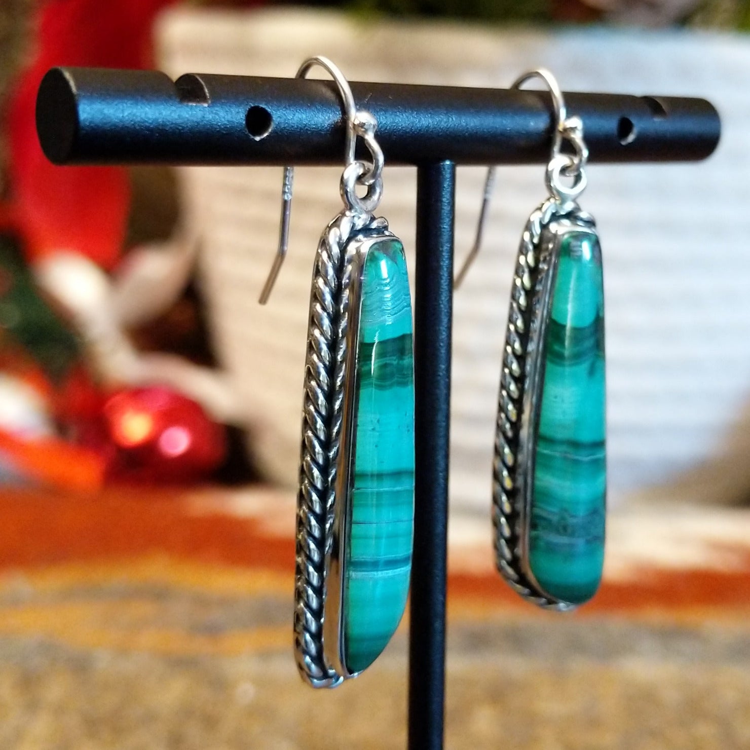 Crafted by Navajo artisan John King, these striking dangle earrings feature polished malachite stones suspended from sterling silver hooks. Accented with signature twisted rope metalwork, the design is a choice for collectors.