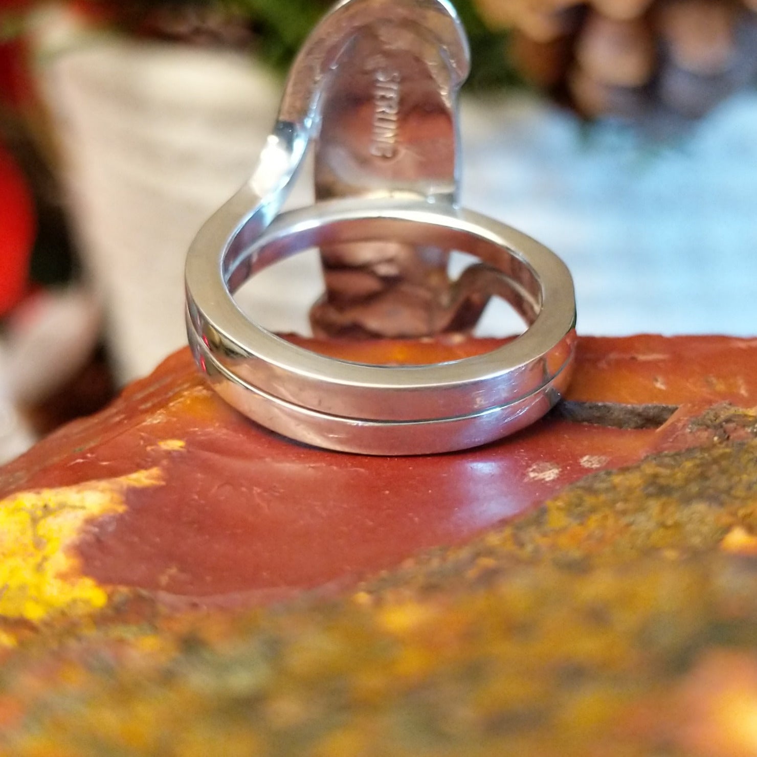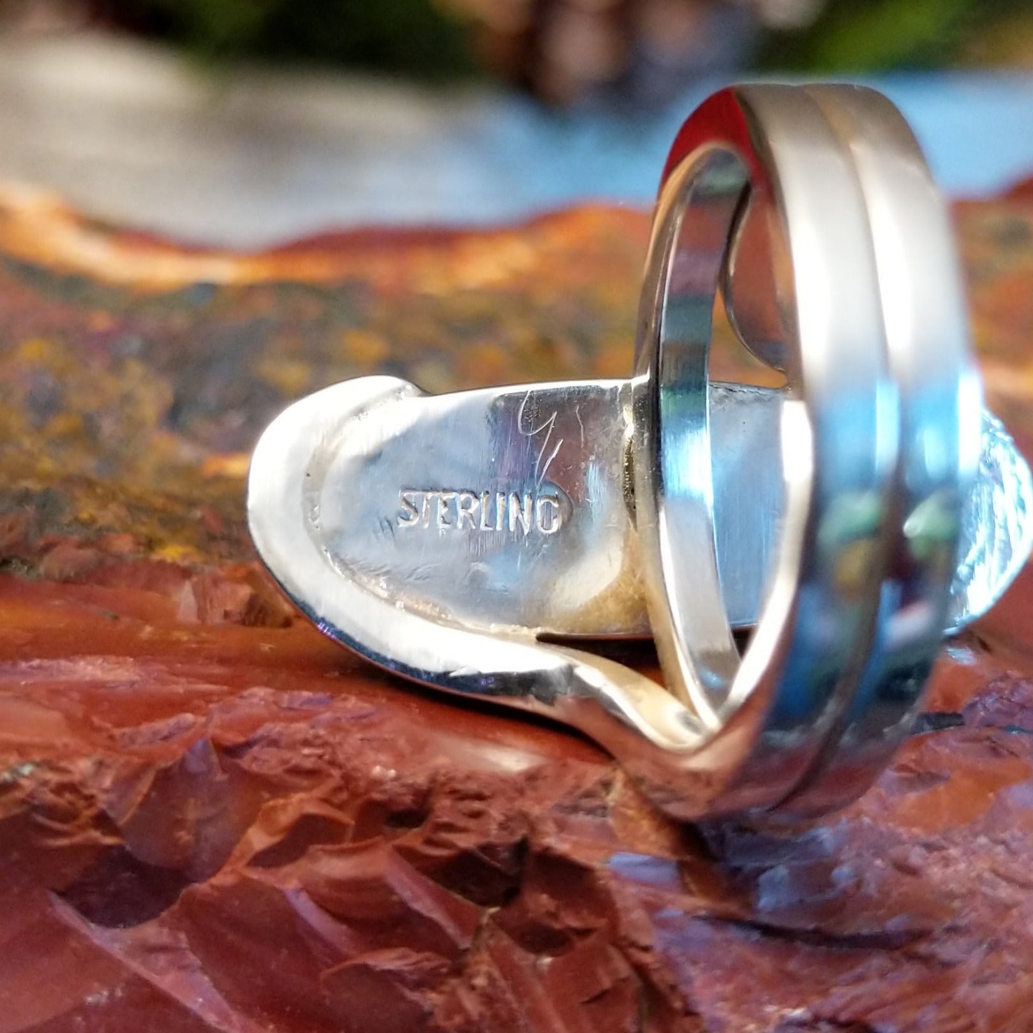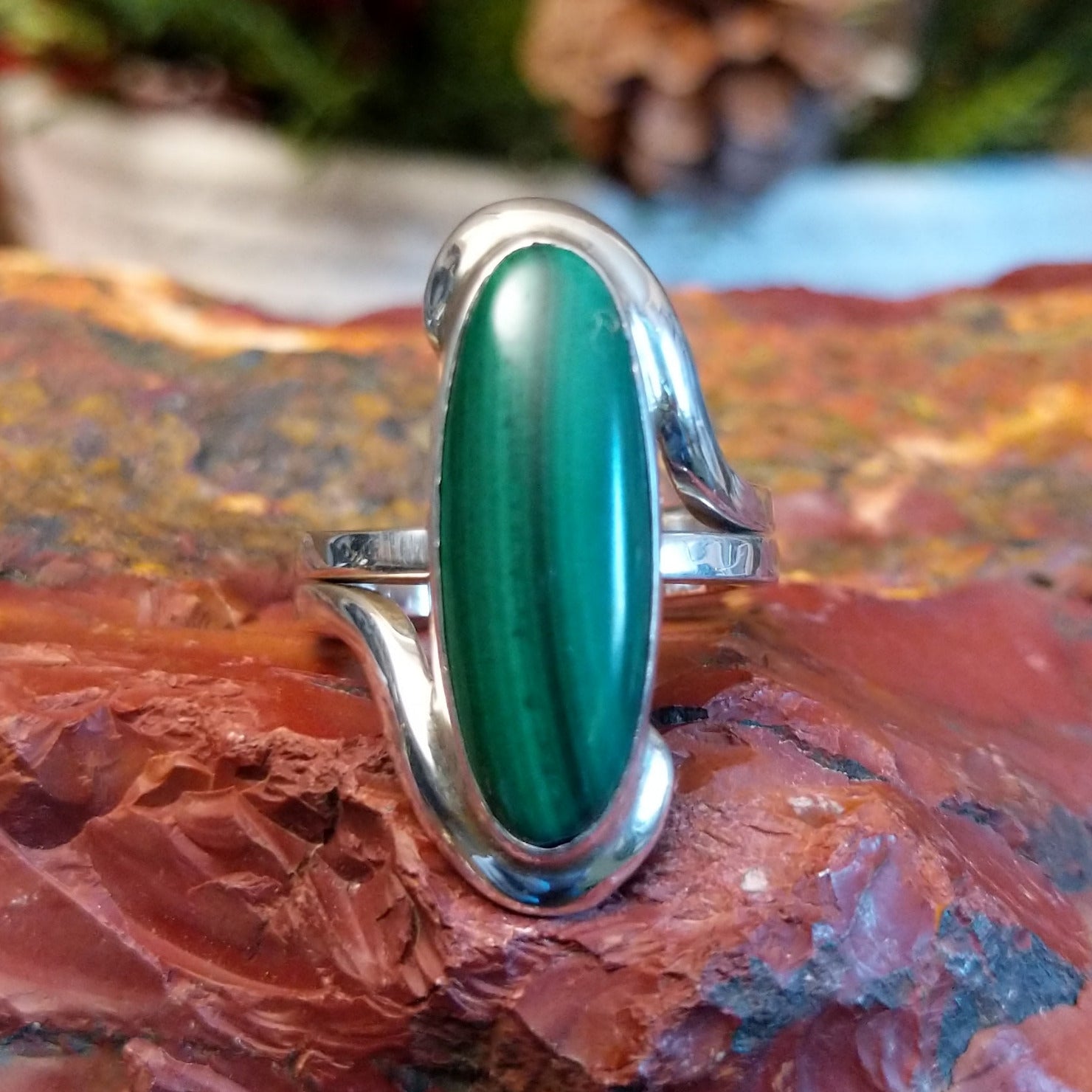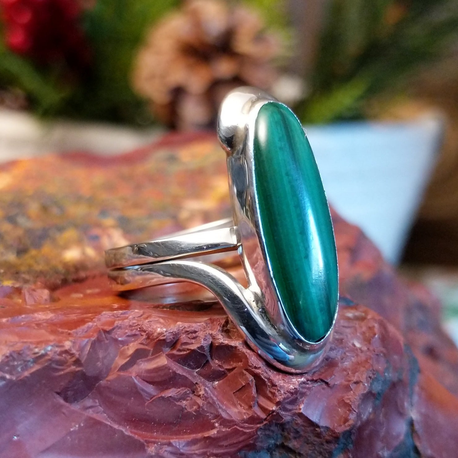 This striking Navajo-made sterling silver ring featuring an elongated oval malachite stone set within an elegant looped band design. The natural green striations of the malachite create a captivating focal point, while the sculptural silver loops frame the stone with refined craftsmanship.