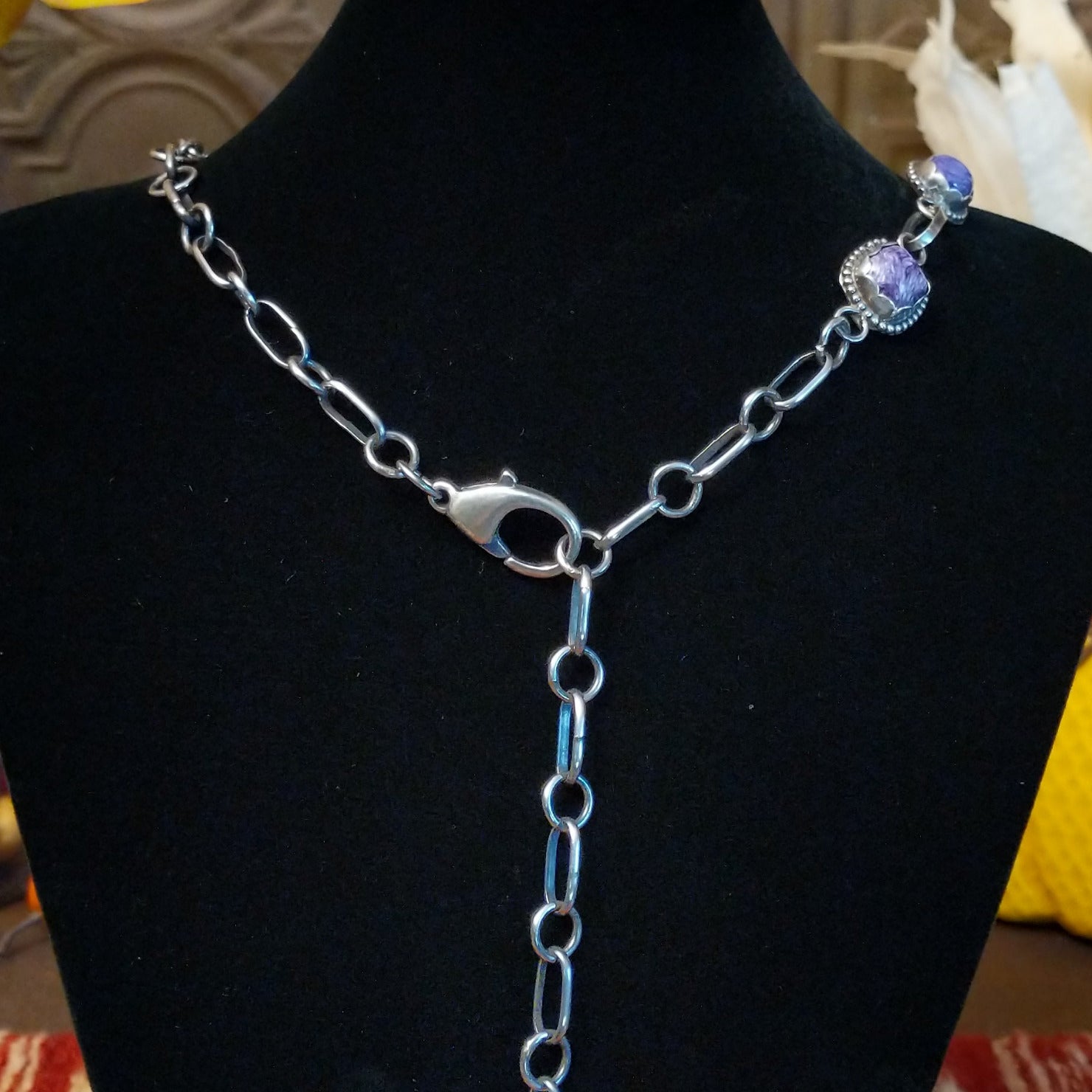 This Navajo-made necklace showcases vibrant charoite stones set in sterling silver notched bezels, expertly linked to create a seamless, elegant design. Crafted by artisan inital B., each bezel highlights the unique matrix of the charoite, showcasing traditional silversmithing techniques.