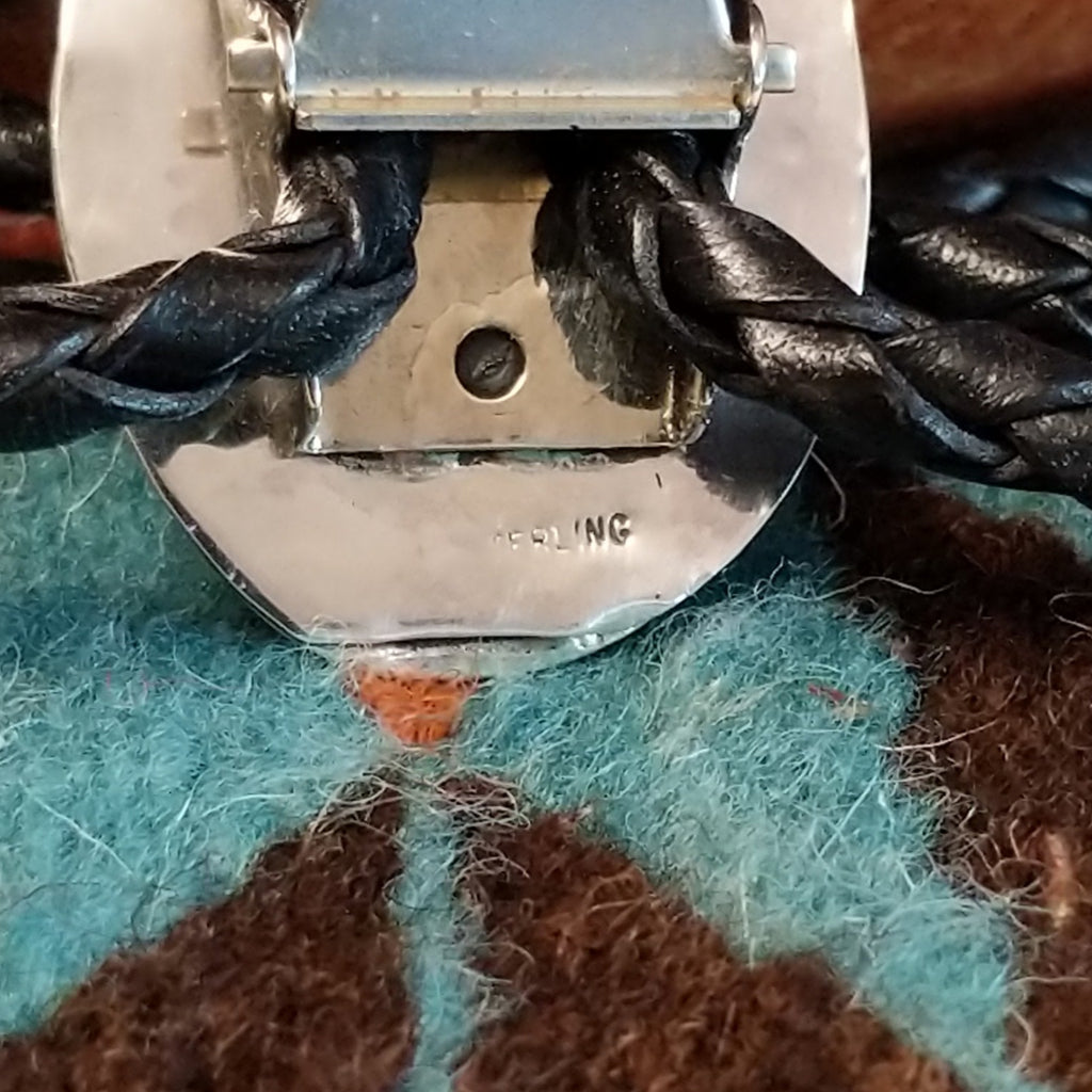 This is a handsome bolo tie with its clasp holding a bright white buffalo stone with black veining that runs on the outer edges. The stone is framed by stamped silver that has been given a deep patina to maintain its eye-catching contrast.