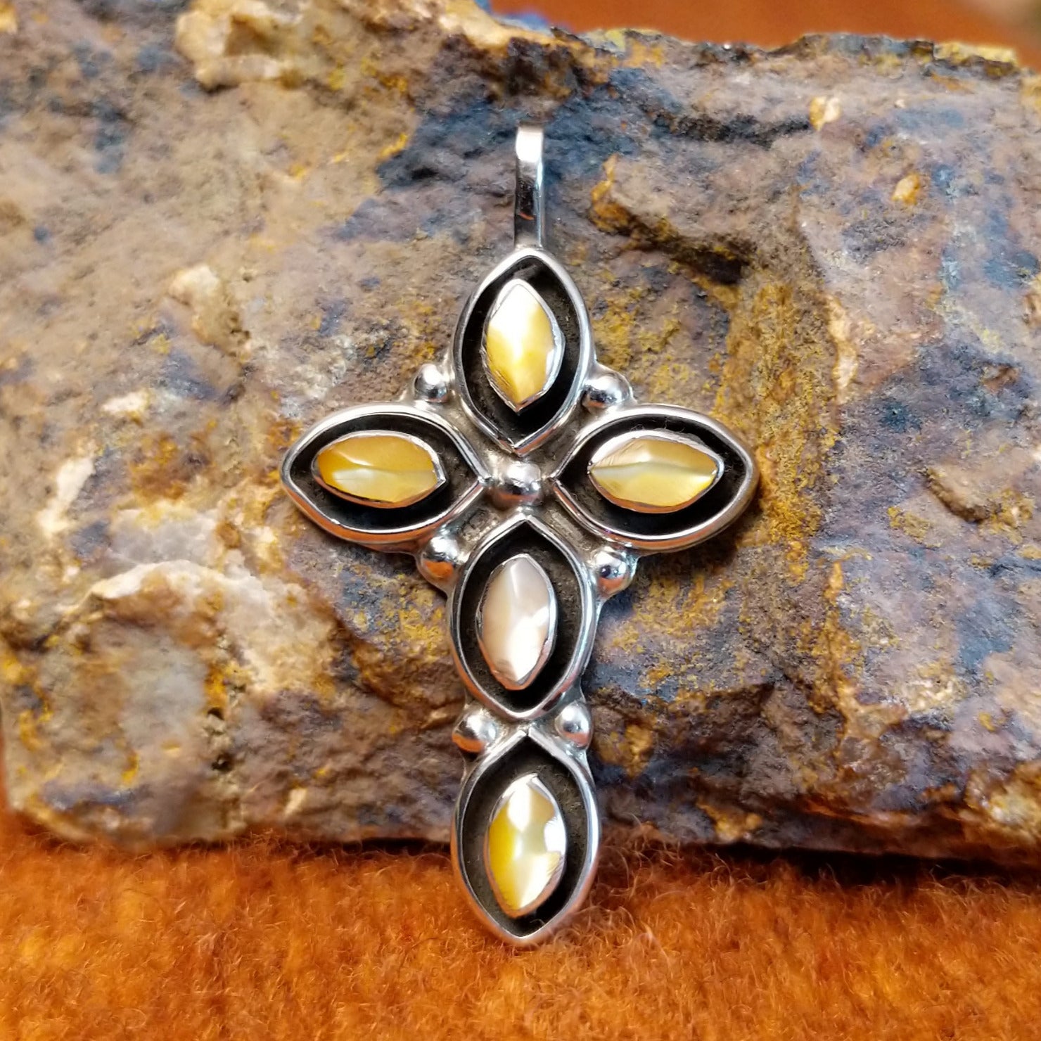 This Navajo-made cross pendant features yellow mussel shell expertly set within sterling silver shadowbox settings. The design combines traditional symbolism with meticulous craftsmanship, creating a distinctive, beautiful piece.