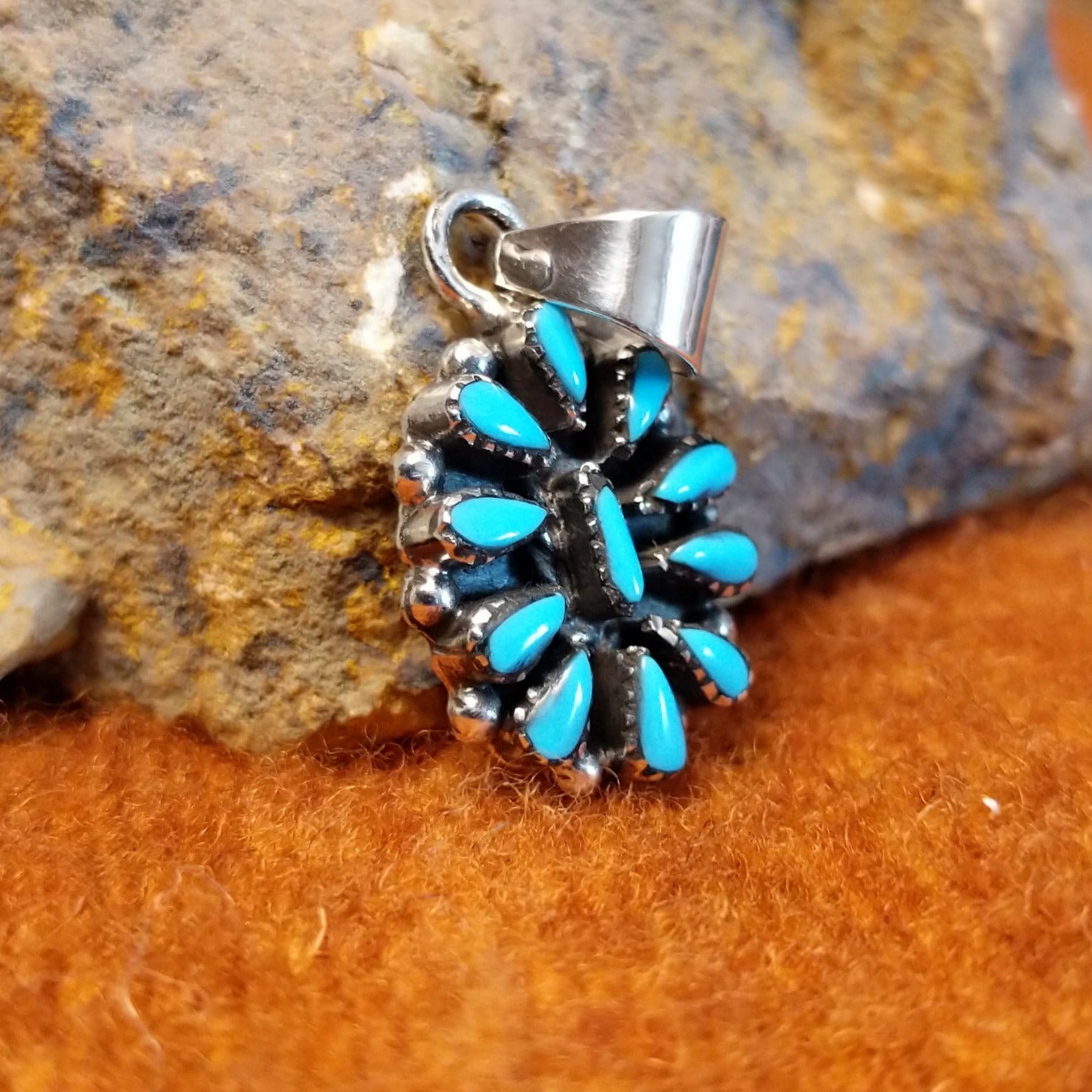 This petite point pendant by Navajo artisan Lowell Draper showcases expertly inlaid turquoise stones set in sterling silver. The intricate petit point technique highlights precision and traditional craftsmanship, creating a refined, stunning piece.