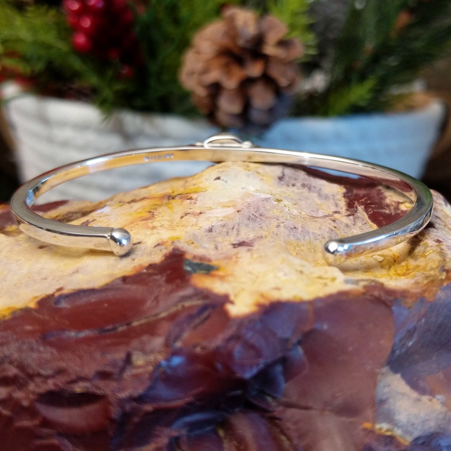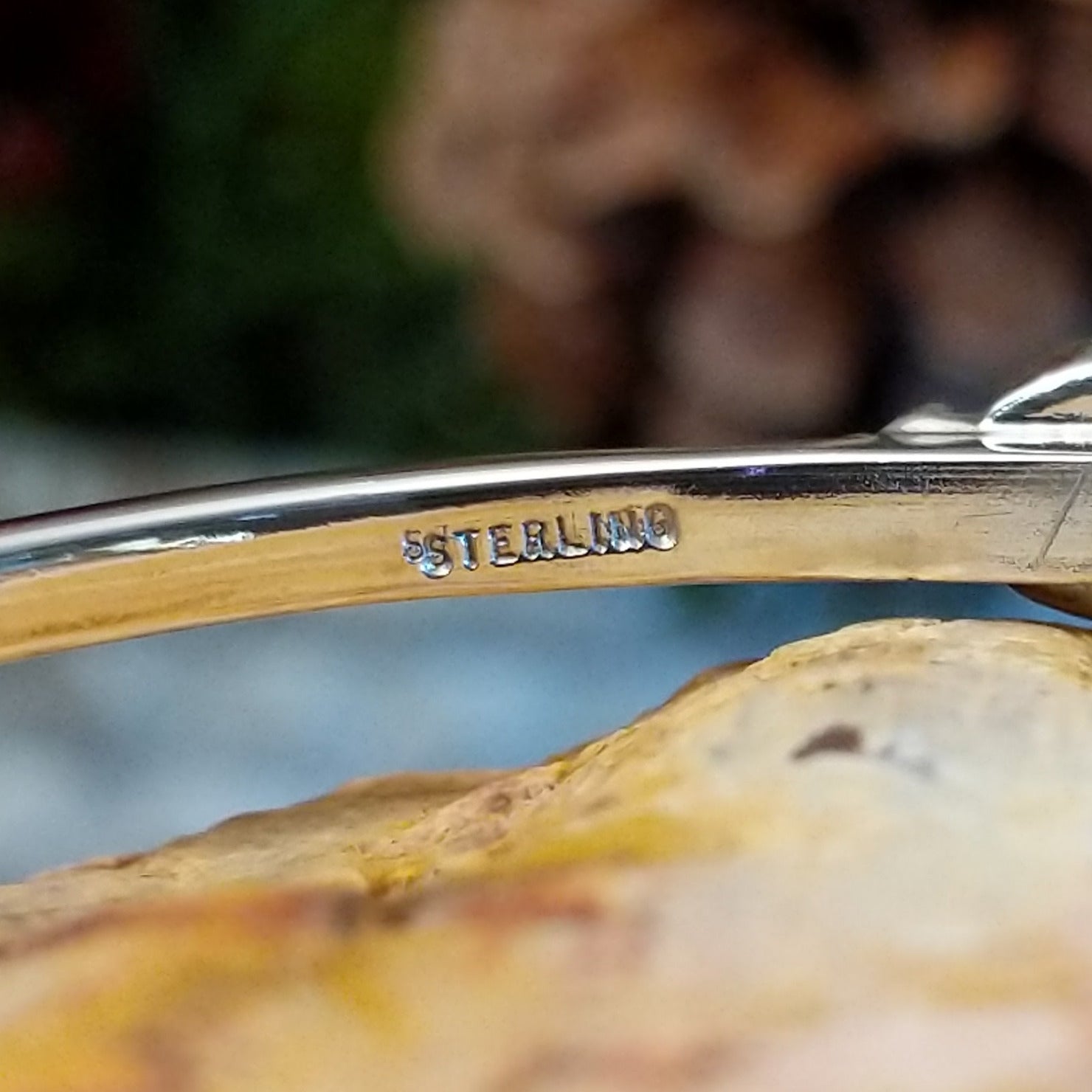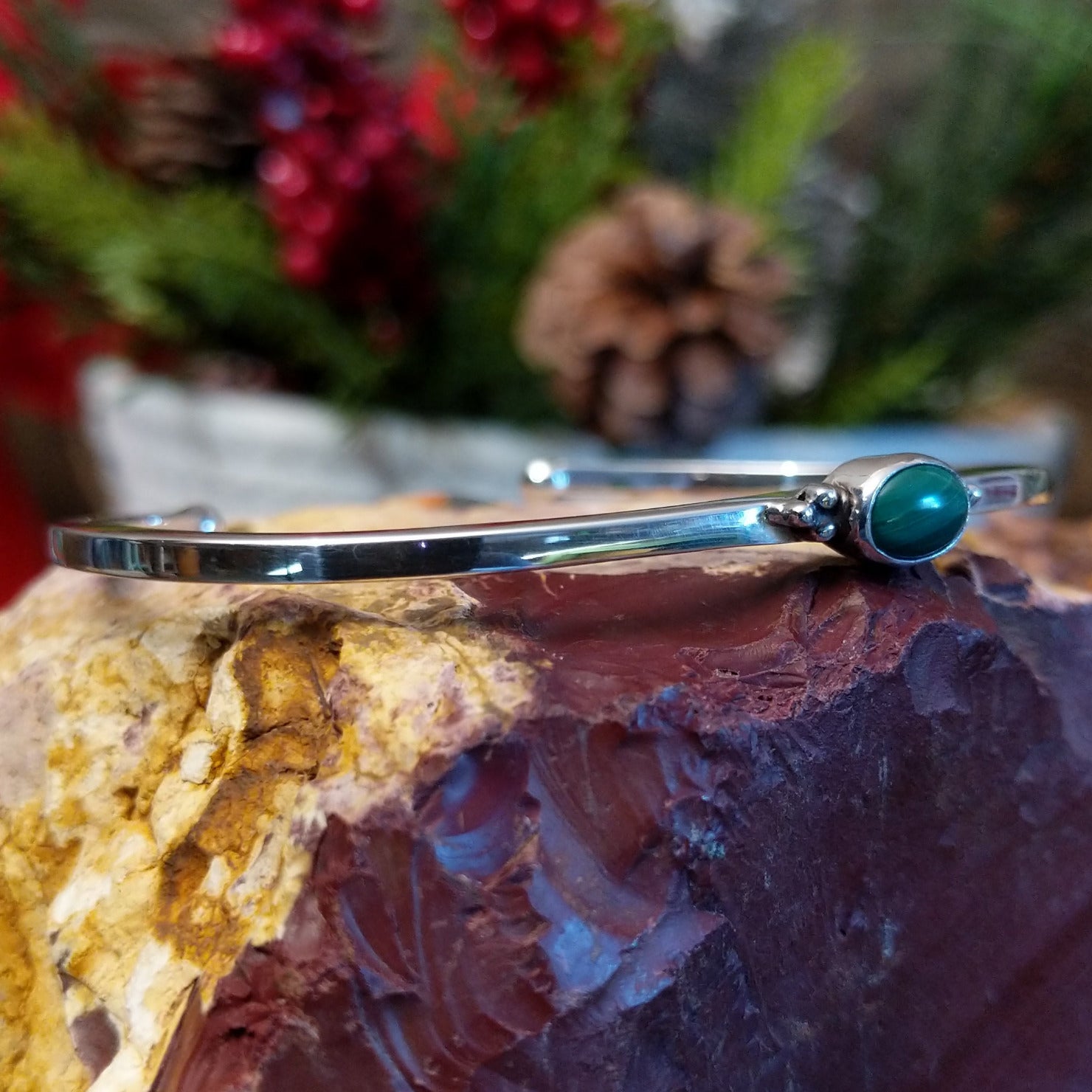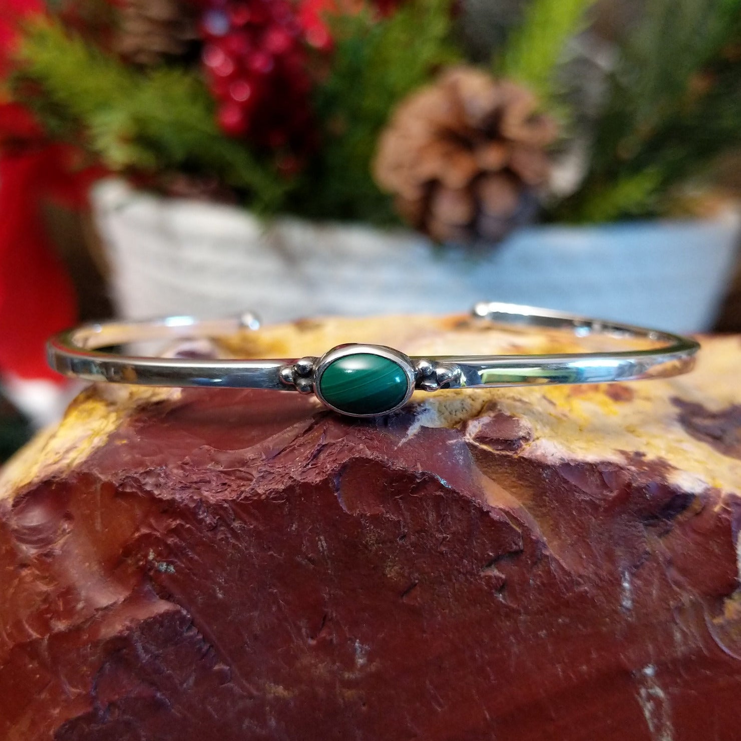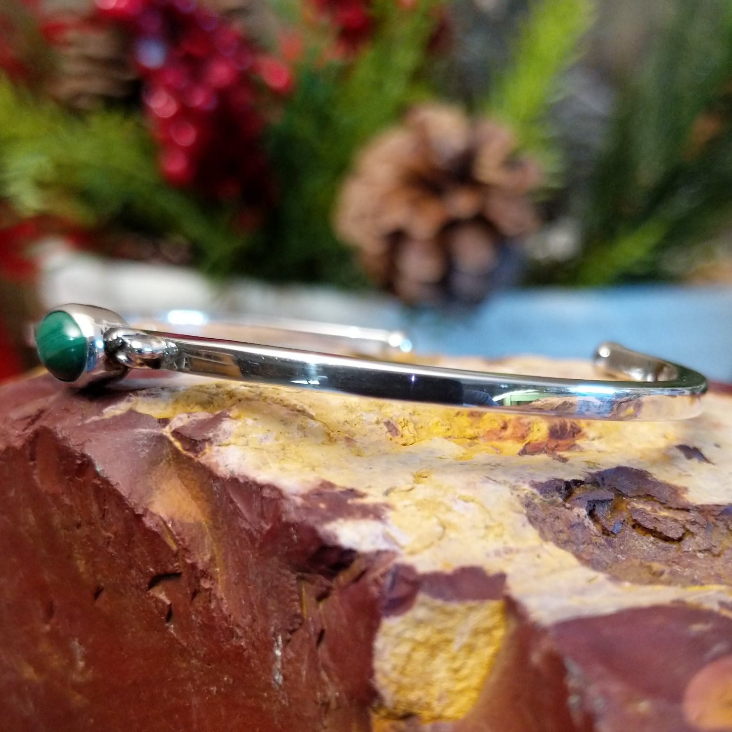 This Navajo made sterling silver cuff pairs a slender band with a petite malachite oval, delivering elegance through refined craftsmanship and natural beauty. The minimalist silhouette adapts for various occasions while the stone's distinctive green striations ensures it remains unique.
