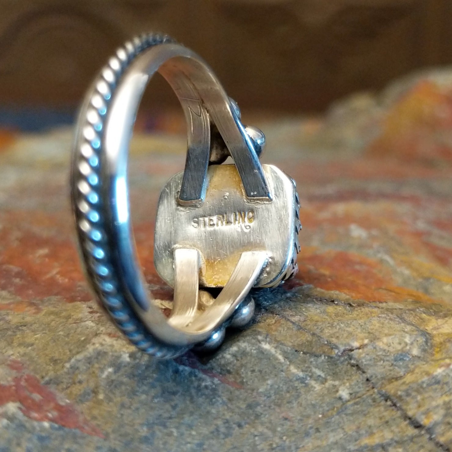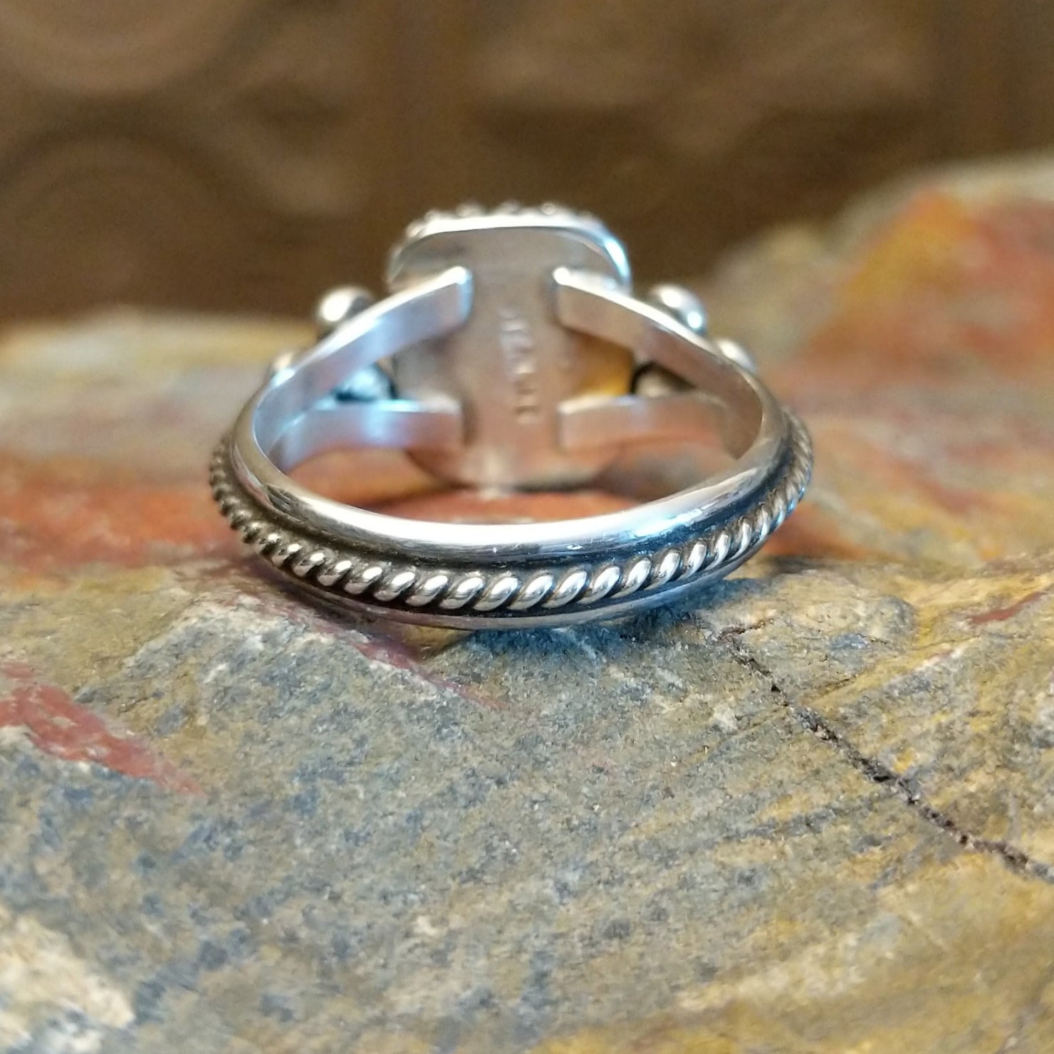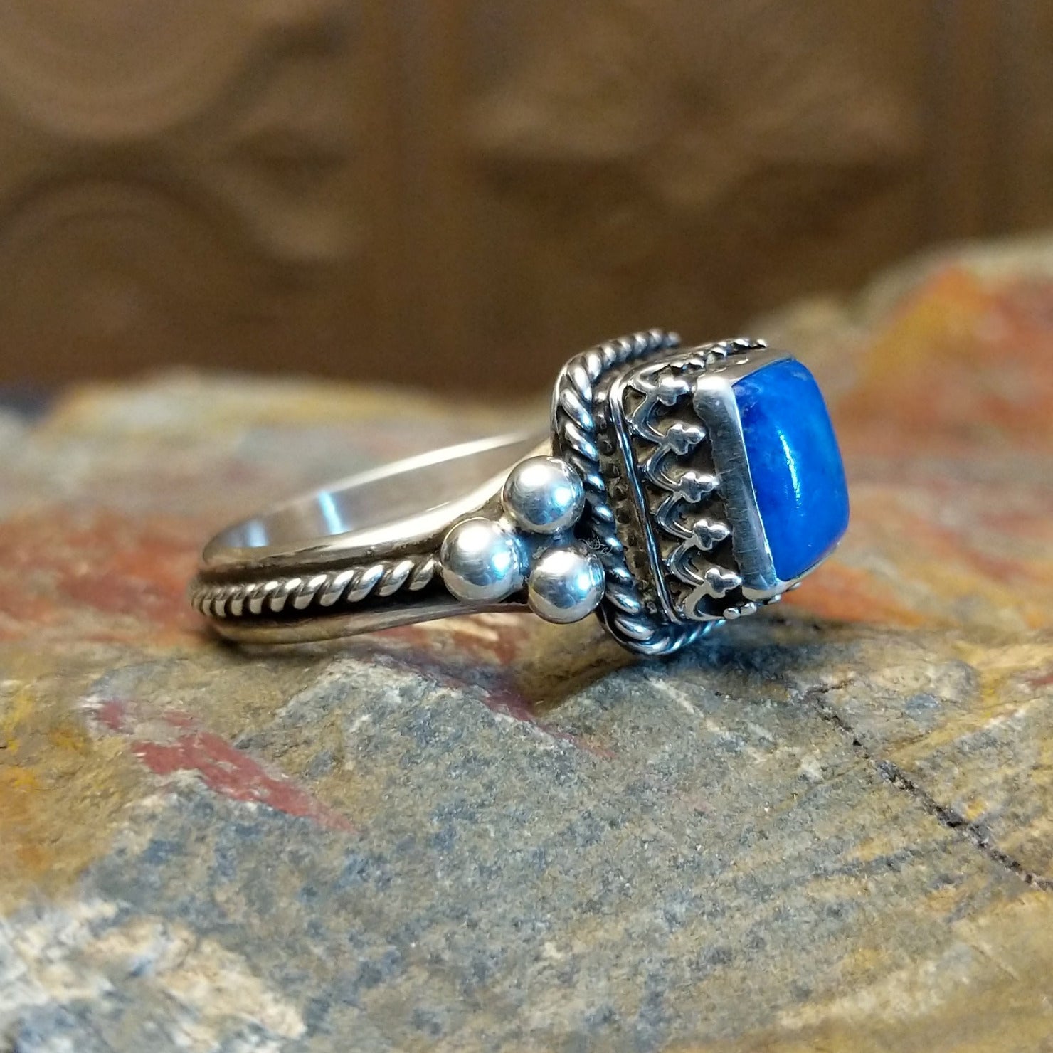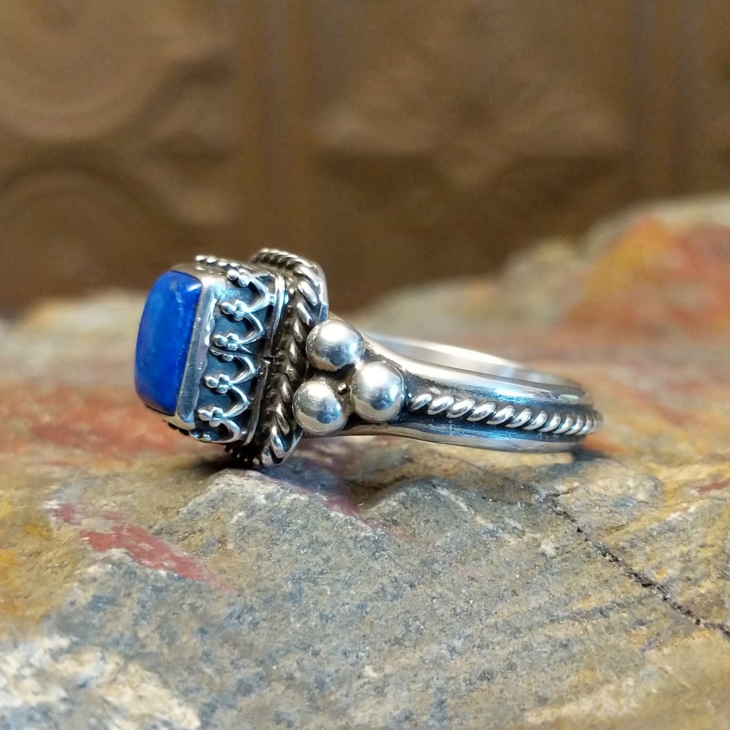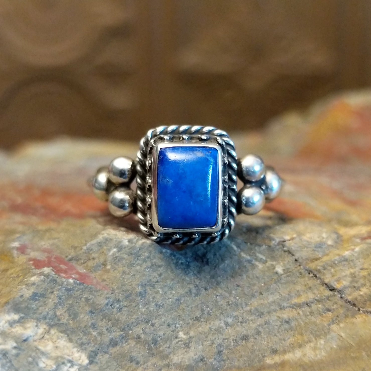 This Navajo made sterling silver ring showcases a lapis stone set within a square bezel and surrounded by twisted rope framing with dotted metalwork accents. The unique stone stetting and design makes this a bold and regal jewelry choice for various collections.