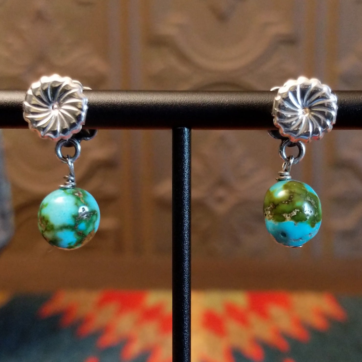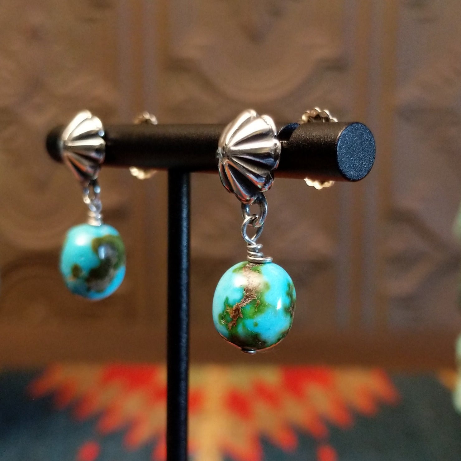 These Navajo-crafted earrings pair rough-cut Sonoran Gold turquoise beads with sterling silver floral posts. The unique design and stunning appearance of the stone make these a perfect addition for various occasions.
