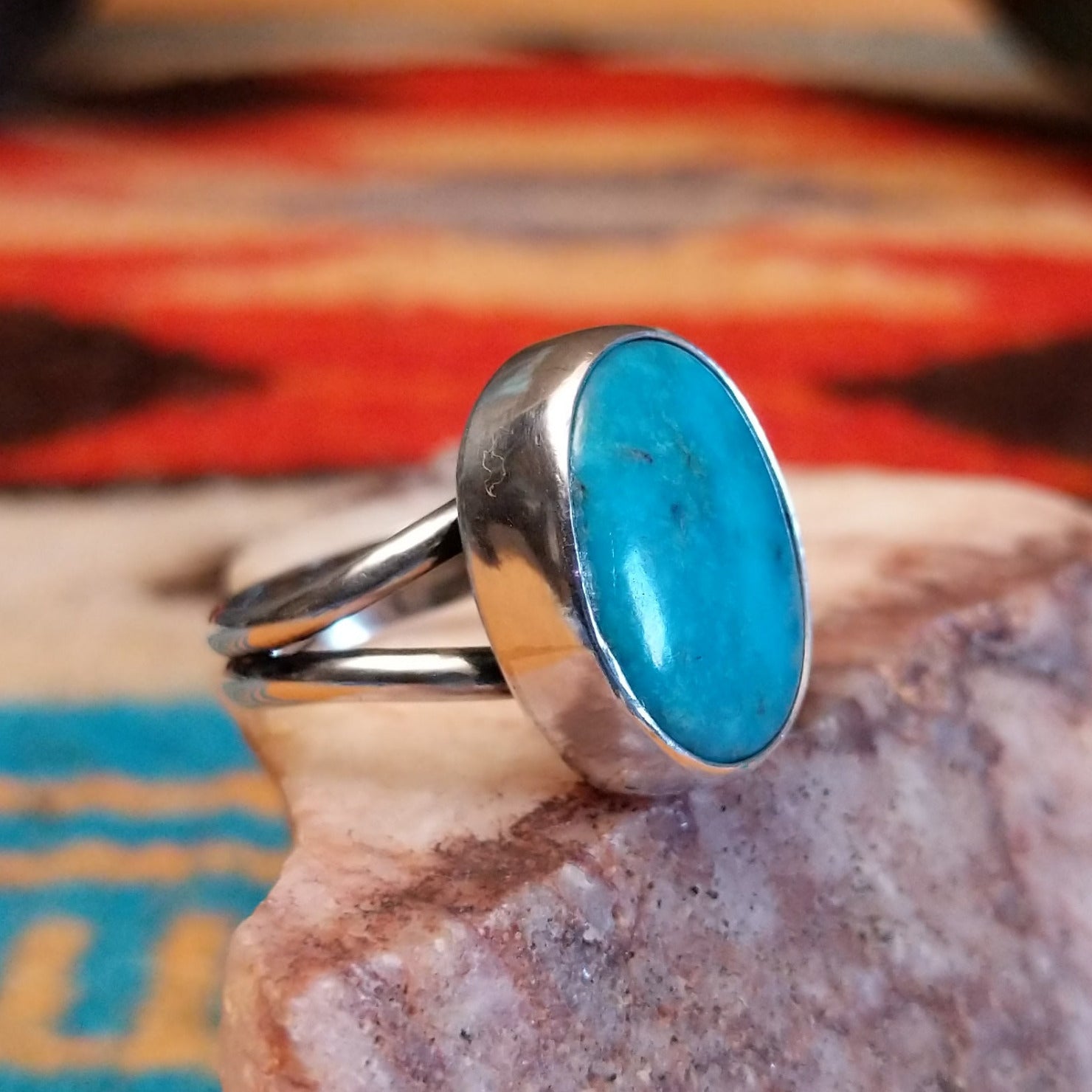 Crafted by Navajo artisans Everett and Mary Teller, this sterling silver ring features Kingman turquoise set in an oval bezel. The simplistic design and vibrant hue of the piece makes this a perfect, everyday adornment.