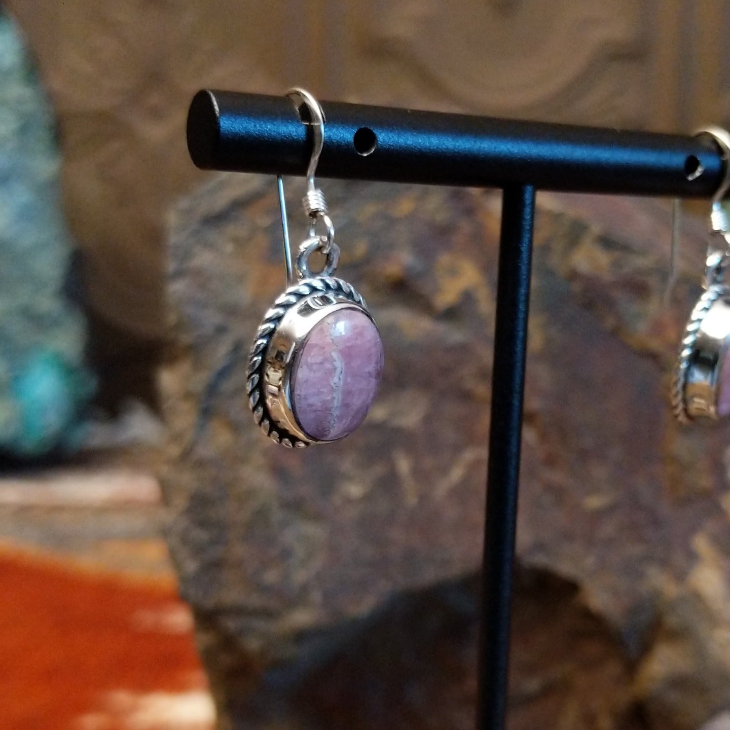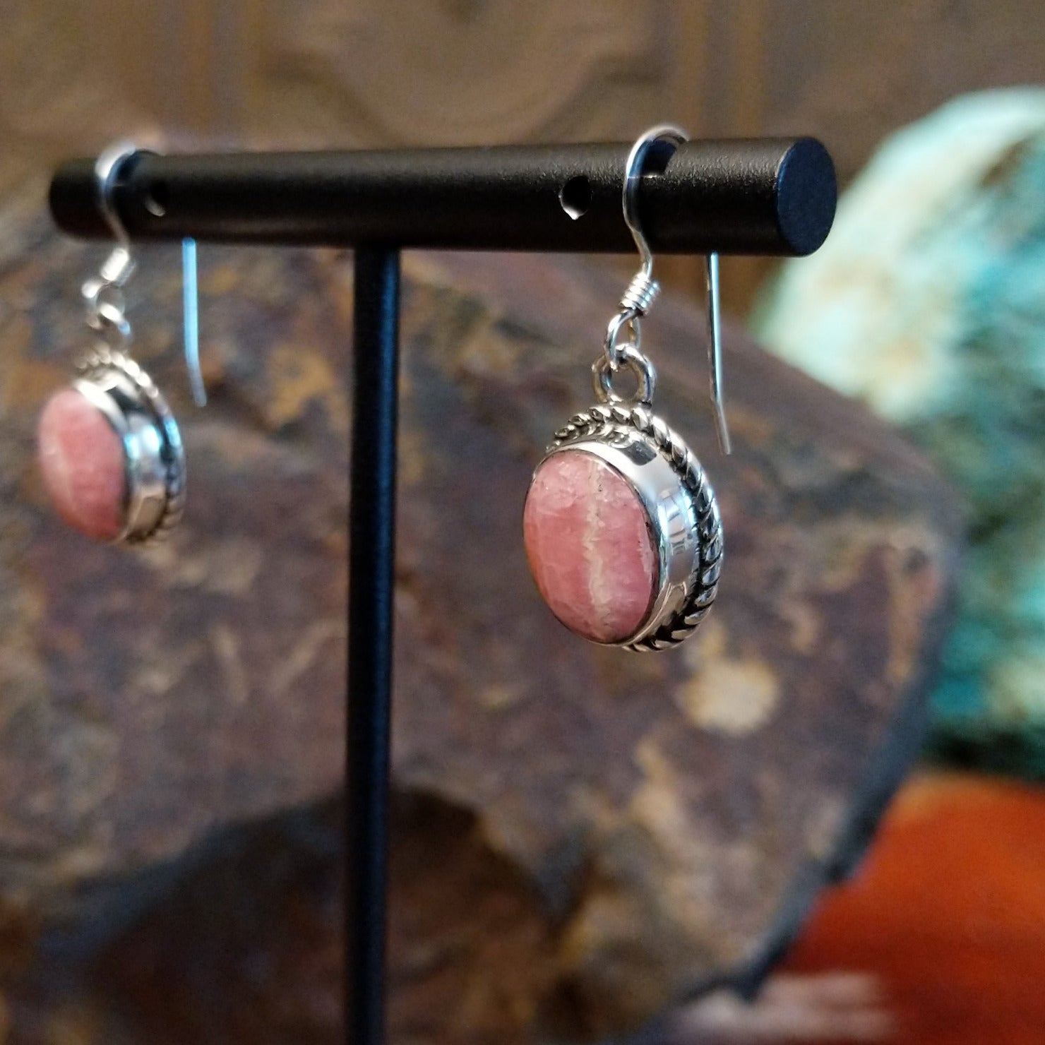 These traditional Navajo made oval rhodochrosite earrings will be the perfect accent to any outfit. The stones in these earrings are a wonderful example of the many striations that rhodochrosite has. A rope twist bezel gives these earrings a step up in class!