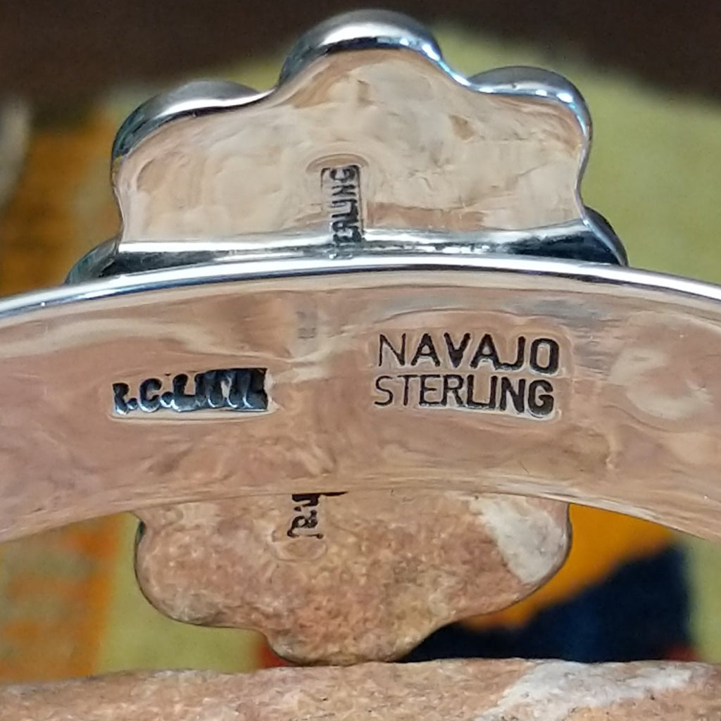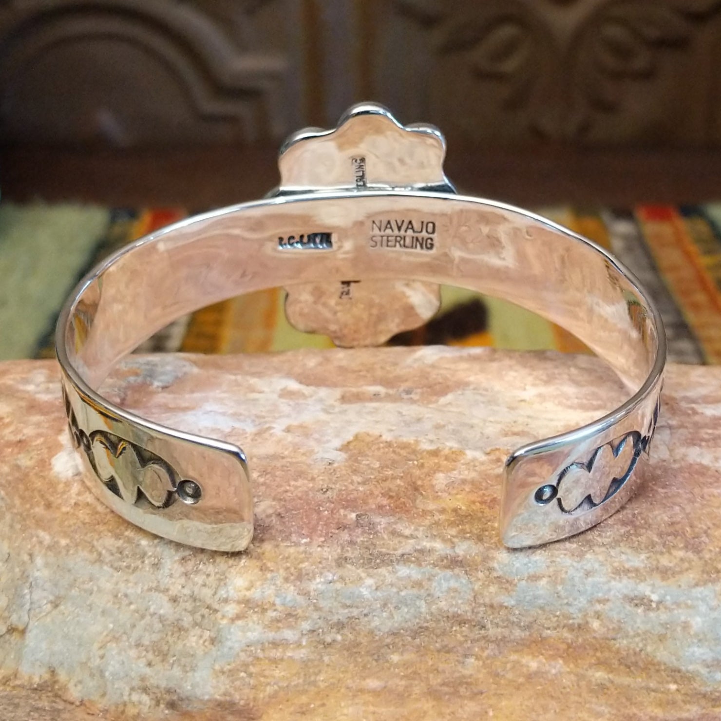 This ring features an oval of creamy pink conch shell, elegantly set and encircled by winding silver lines that twist counterclockwise. The band is adorned with two prominent silver stars and accented by delicate stamped designs.