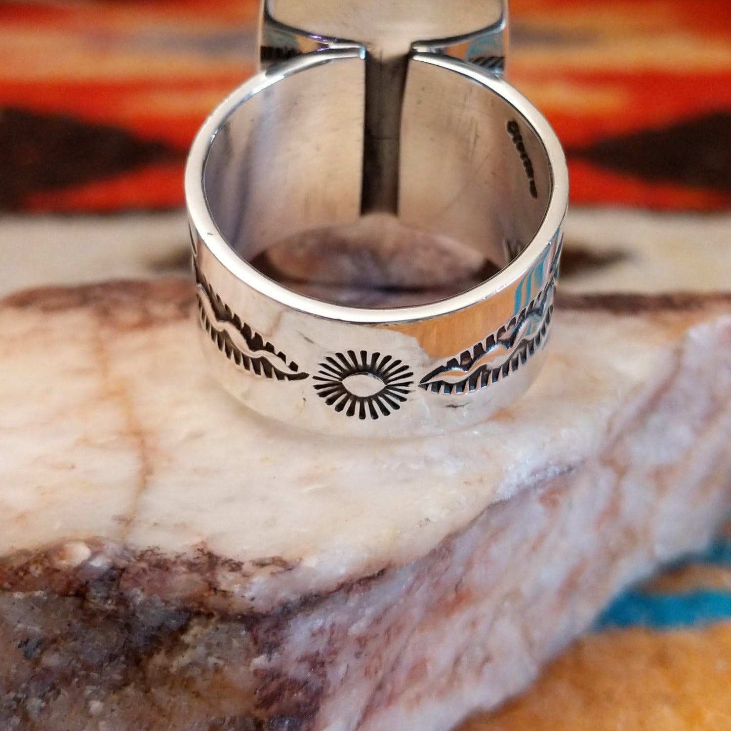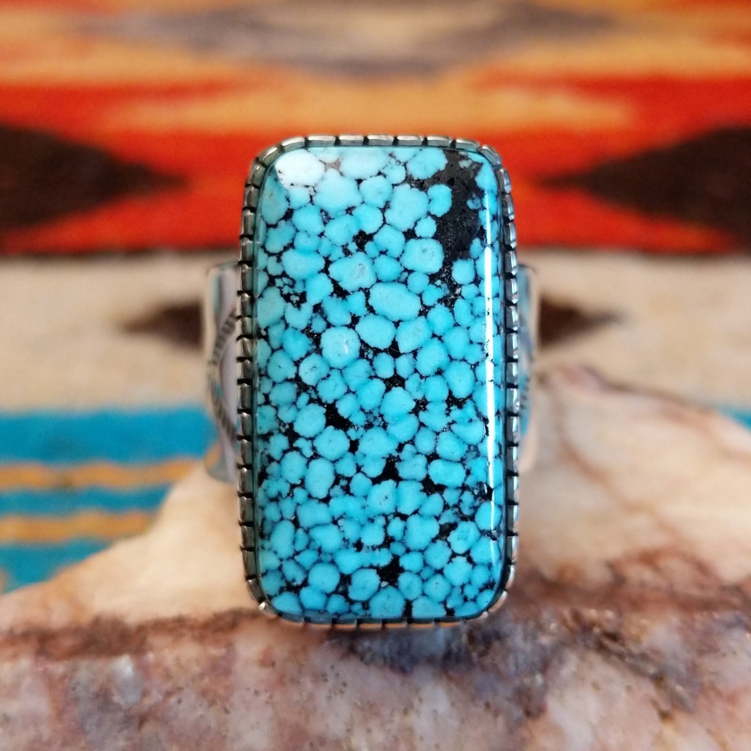 This sterling silver ring by Navajo artisan Murphy Platero features Spiderweb Kingman turquoise set in a rectangular bezel. The unique matrix of the stone makes this a beautiful adornment for various jewelry collections or occasions.