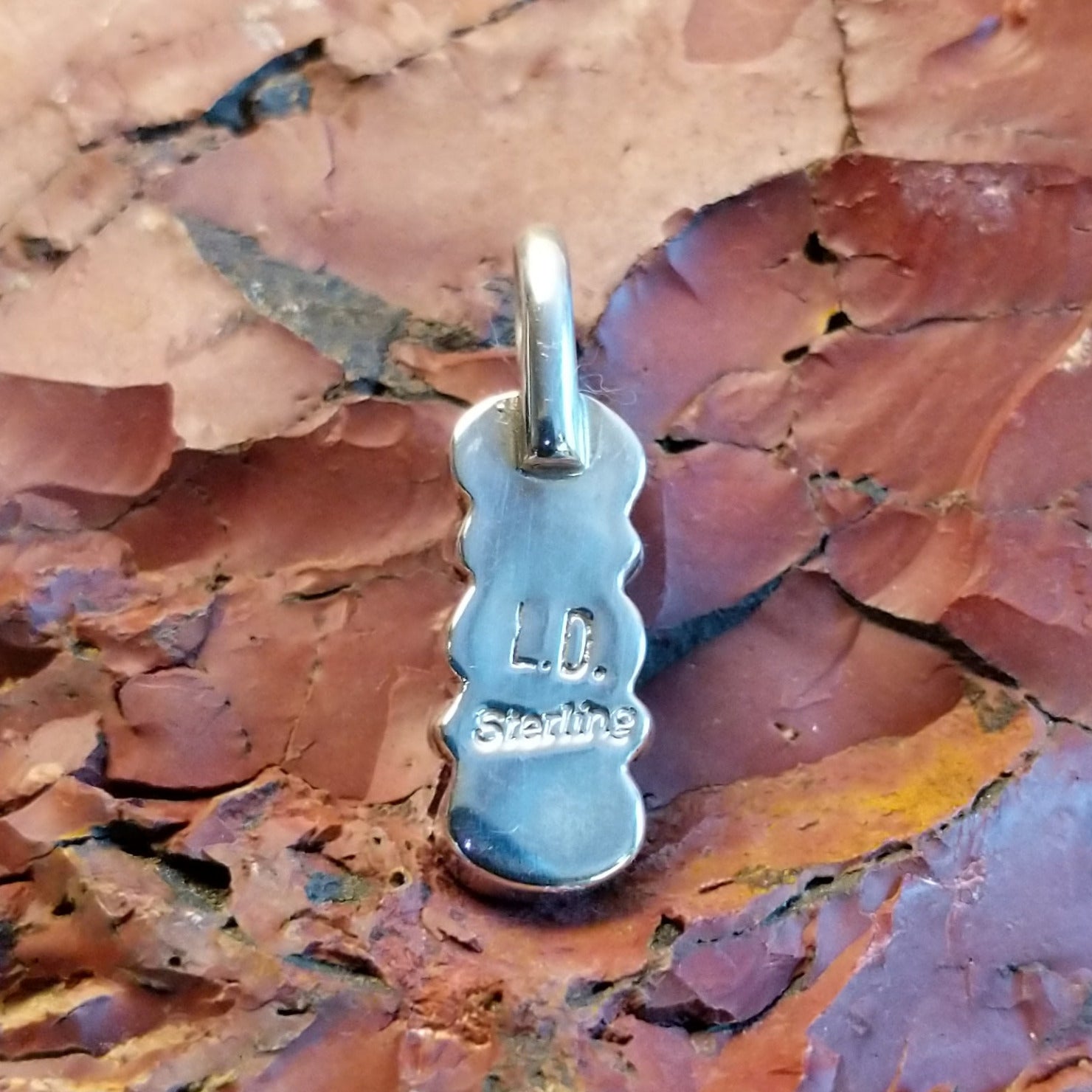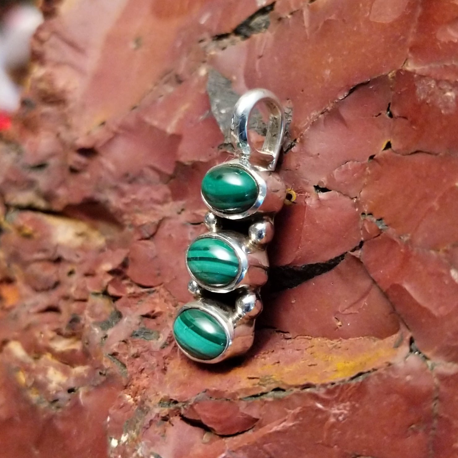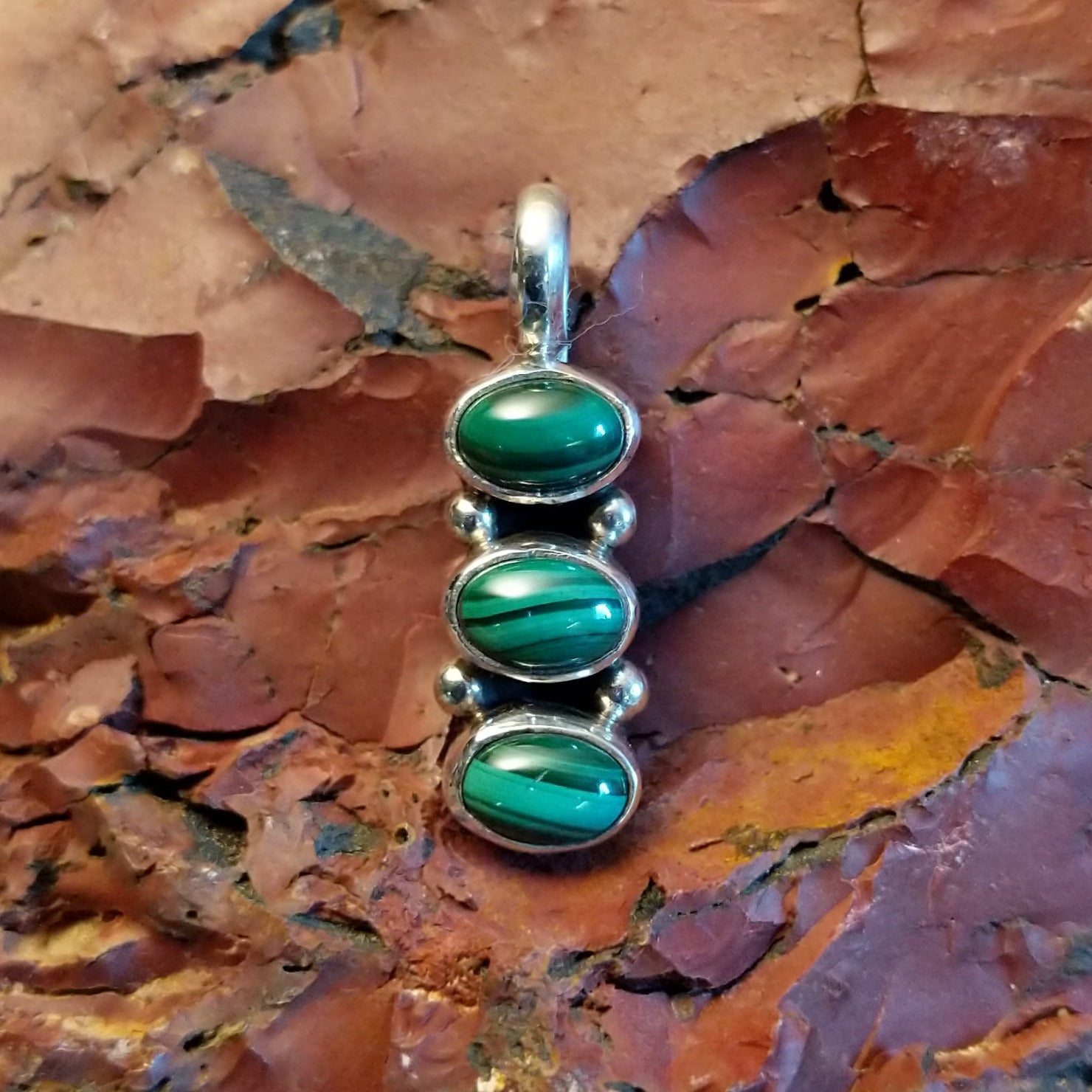 This sterling silver pendant by Navajo artisan Lowell Draper features a unique stacked design with malachite set in the bezels. The stones green coloring makes it a stunning addition for various collections.