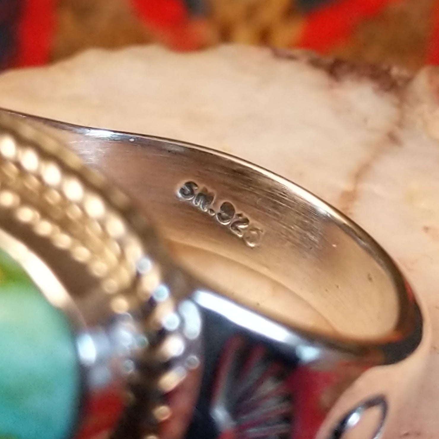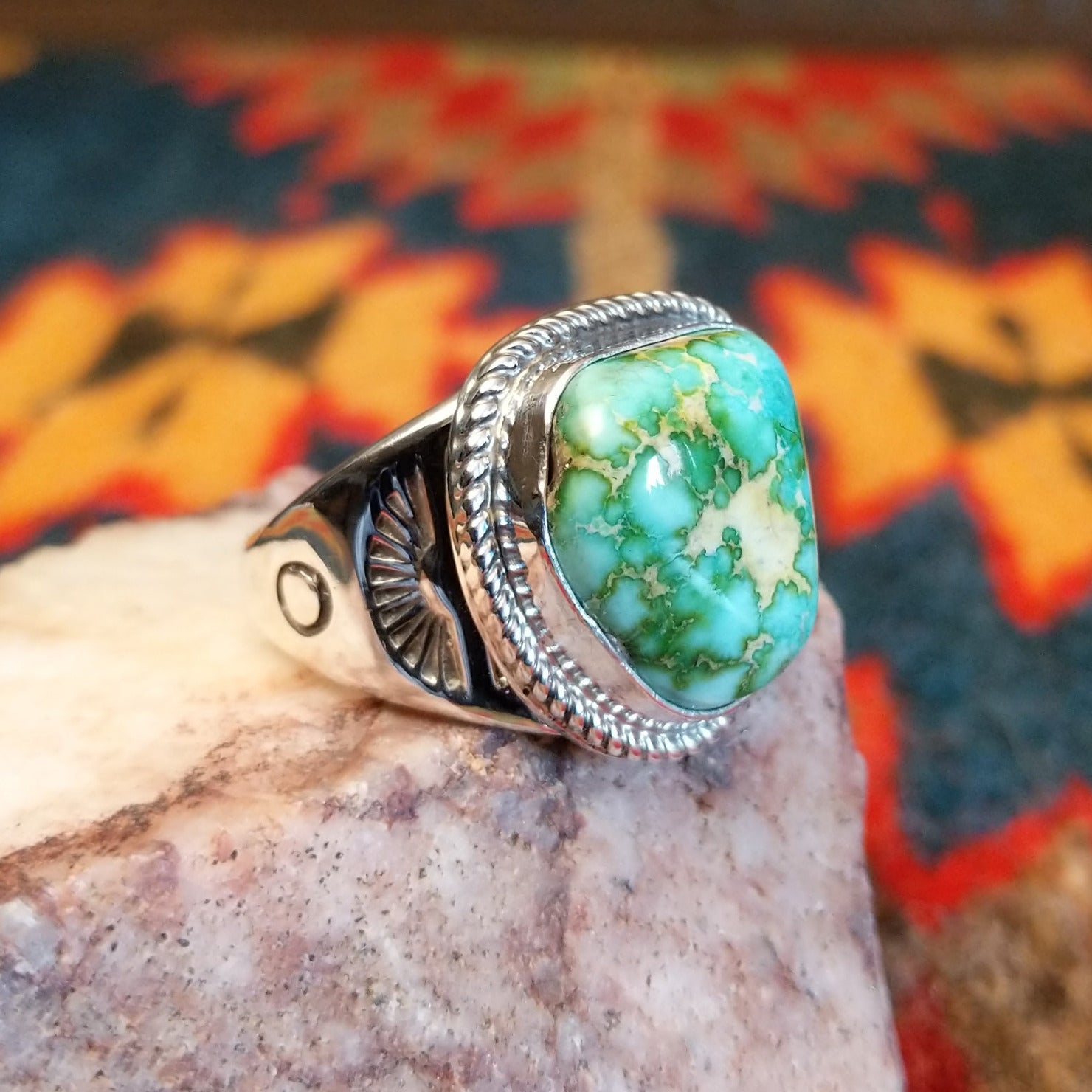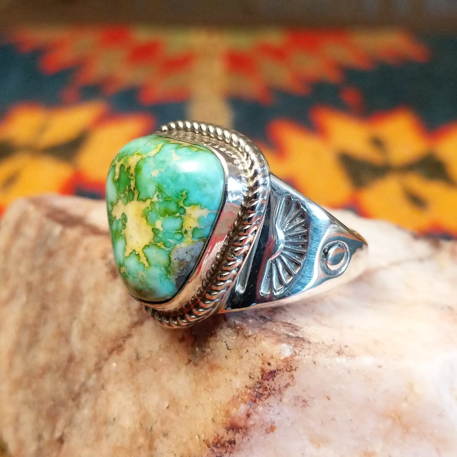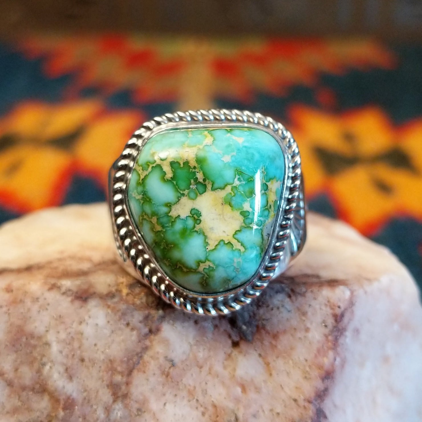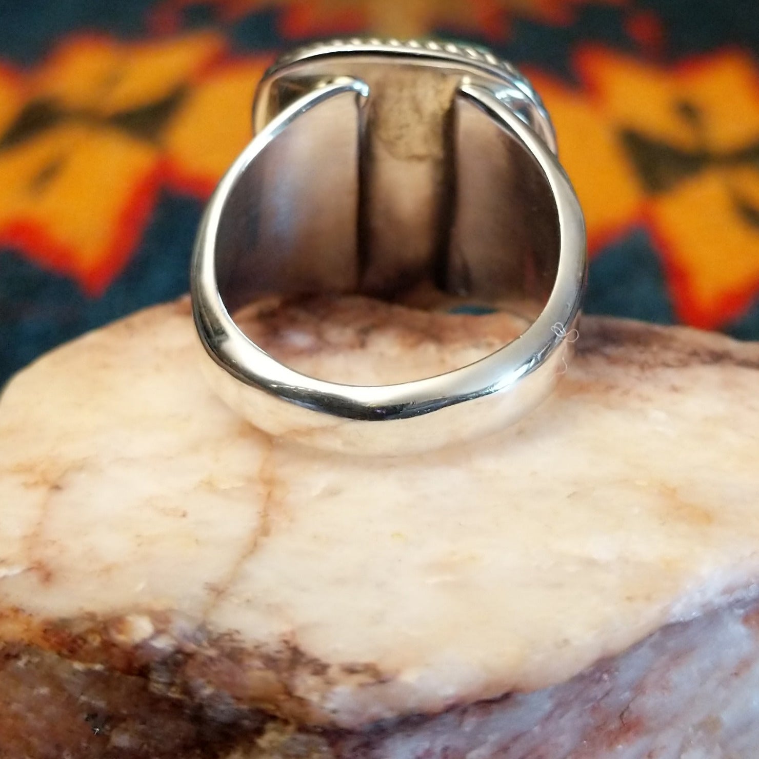 This handcrafted ring features a genuine Sonoran Gold Turquoise stone in a classic rope design, set in sterling silver. Made by Shirley Henry, this ring is size 10.5 and showcases the natural turquoise and golden matrix tones. A refined Southwestern statement piece that beautifully highlights the stone’s rich color and distinctive matrix.
