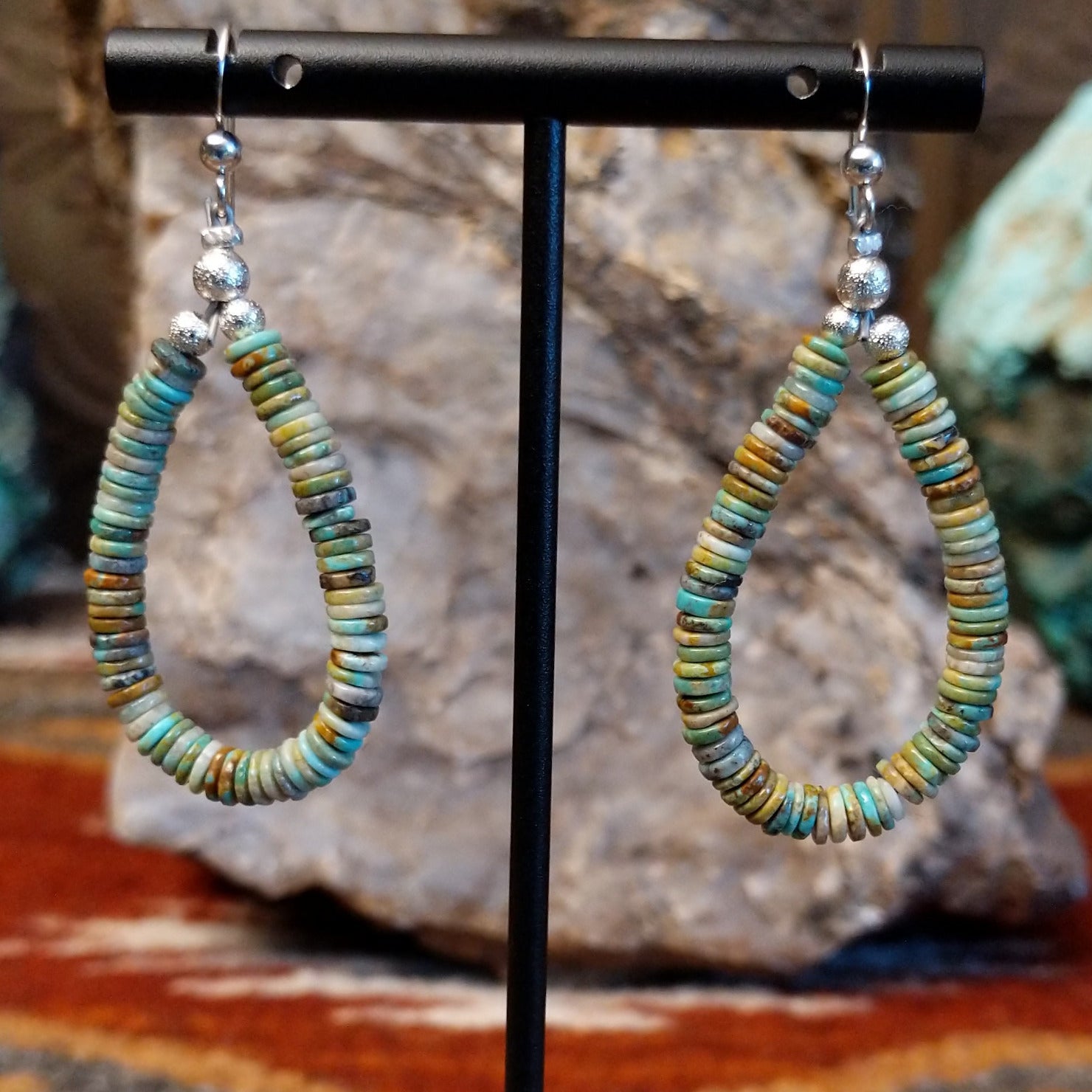These stunning earrings by Navajo artisan Mary Teller showcase turquoise beaded onto the sterling silver wire. The hooks of the earrings make it a perfect dangle accessory for various occasions.